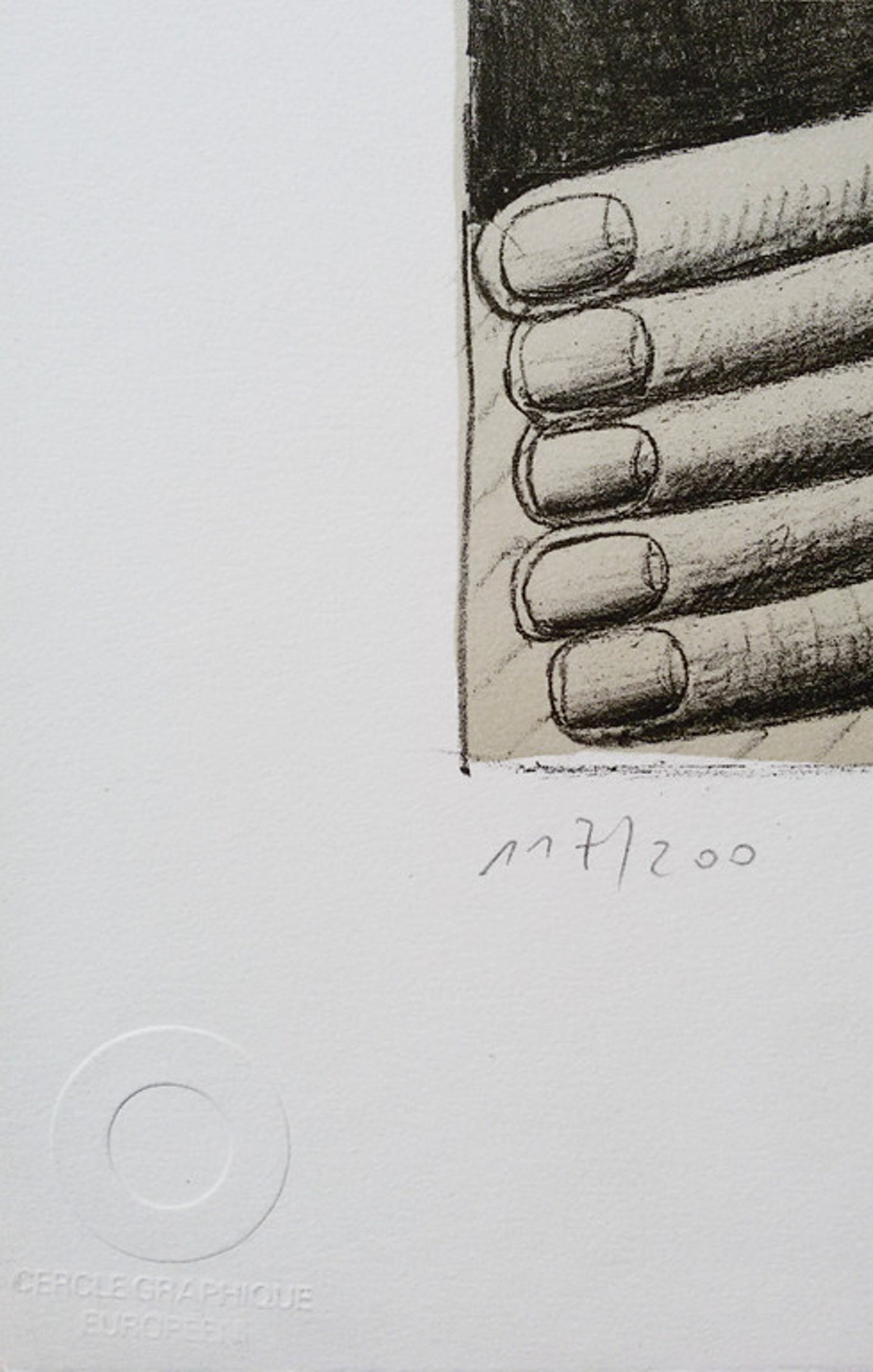 Karakteristieke 'Kopffüßler' (Hoofdvoeter) van Horst Antes, uitgegeven door Cercle Graphique Européen in 1970. Litho op Rives papier, met potlood gesigneerd en genummerd (117/200) en met blindstempel van Cercle Graphique Européen. Literatuur: Lutze 647. In uitstekende conditie.