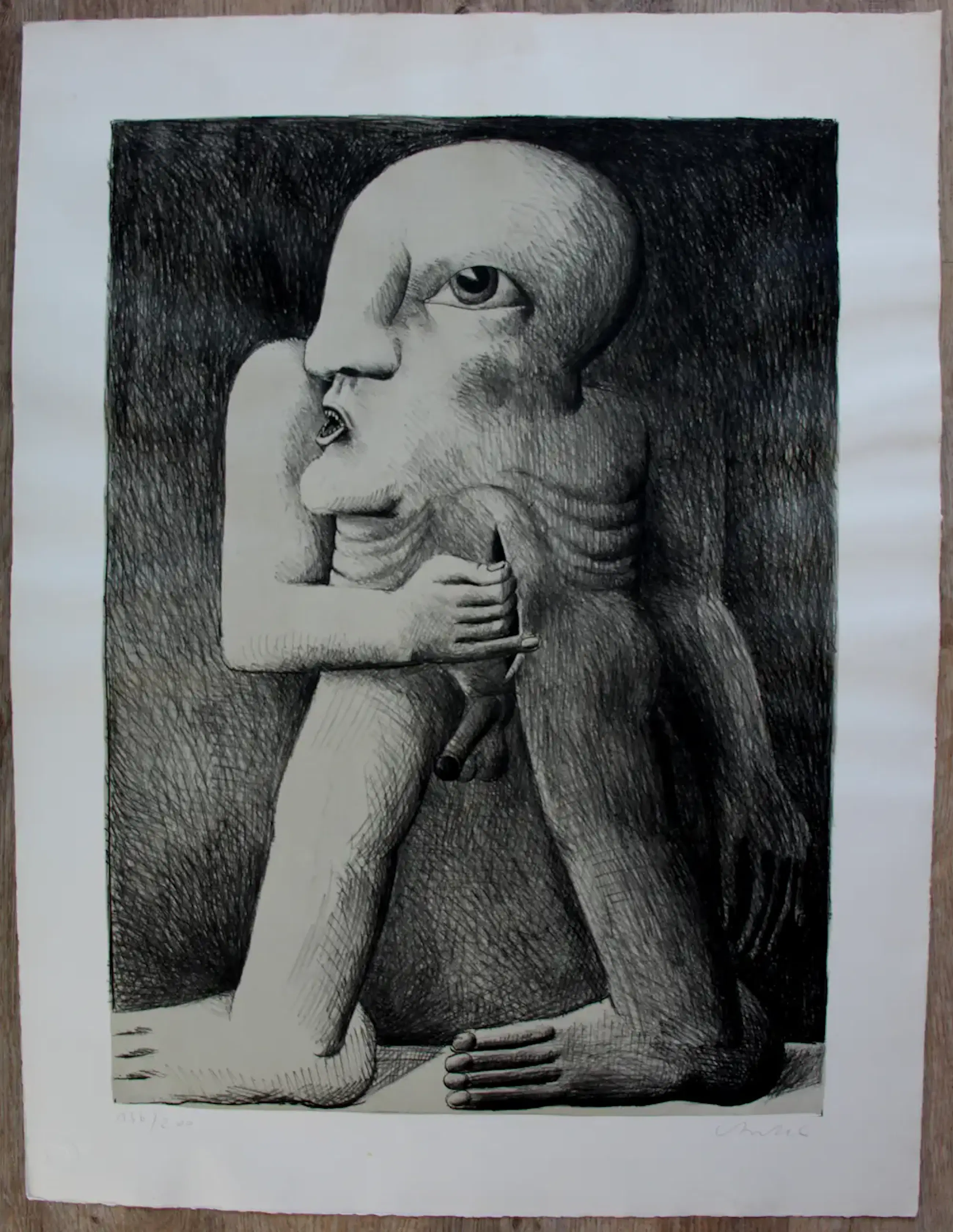 Litho van Horst Antes. Oplage: 136/200. Afmetingen blad: H75 x b57cm. Afmetingen voorstelling: H62 x b45cm. Het werk is rechts onder gesigneerd door de kunstenaar. De authenticiteit van dit werk wordt volledig gegarandeerd. Een certificaat van echtheid kan, op aanvraag, worden gemaild.