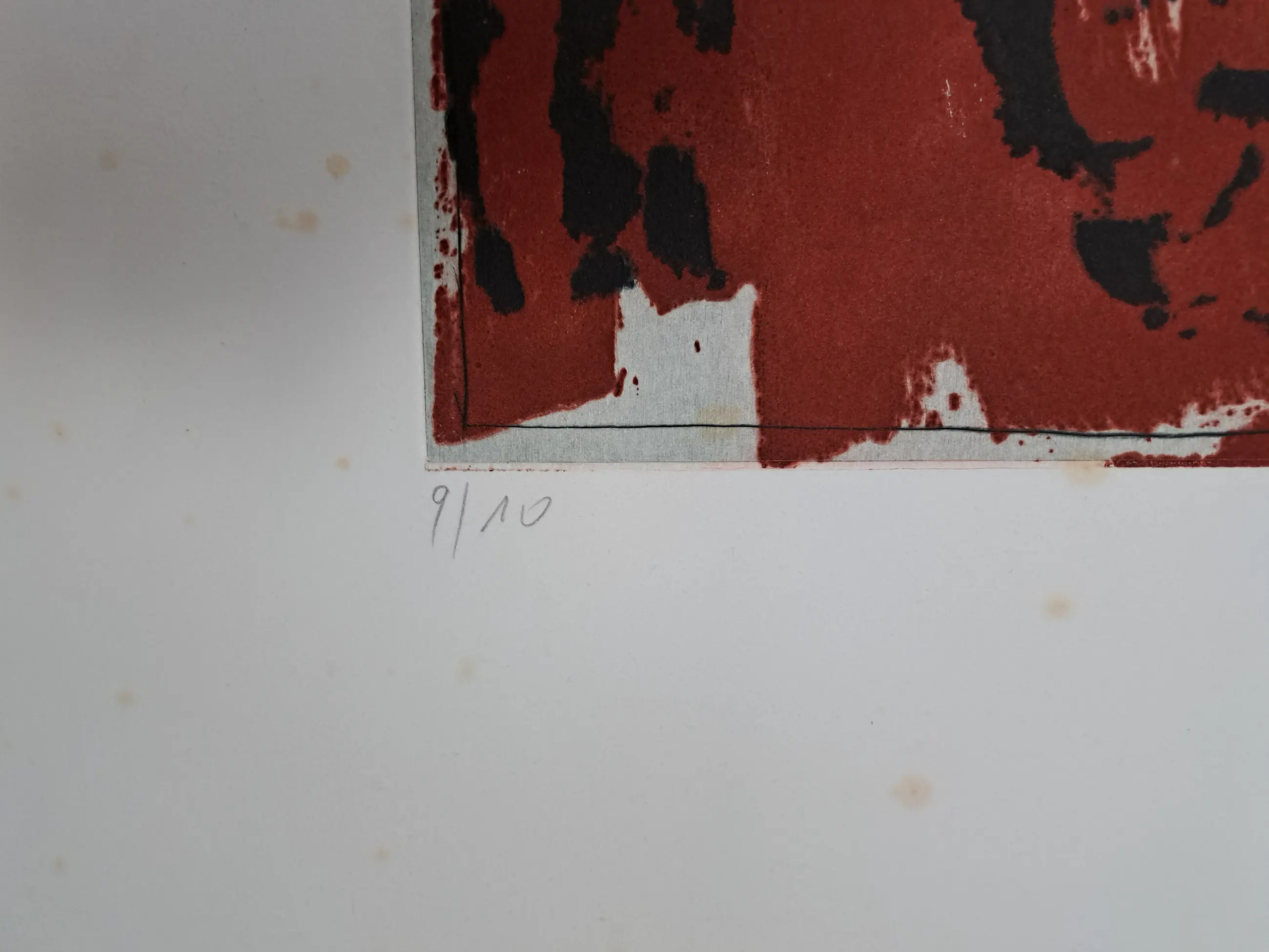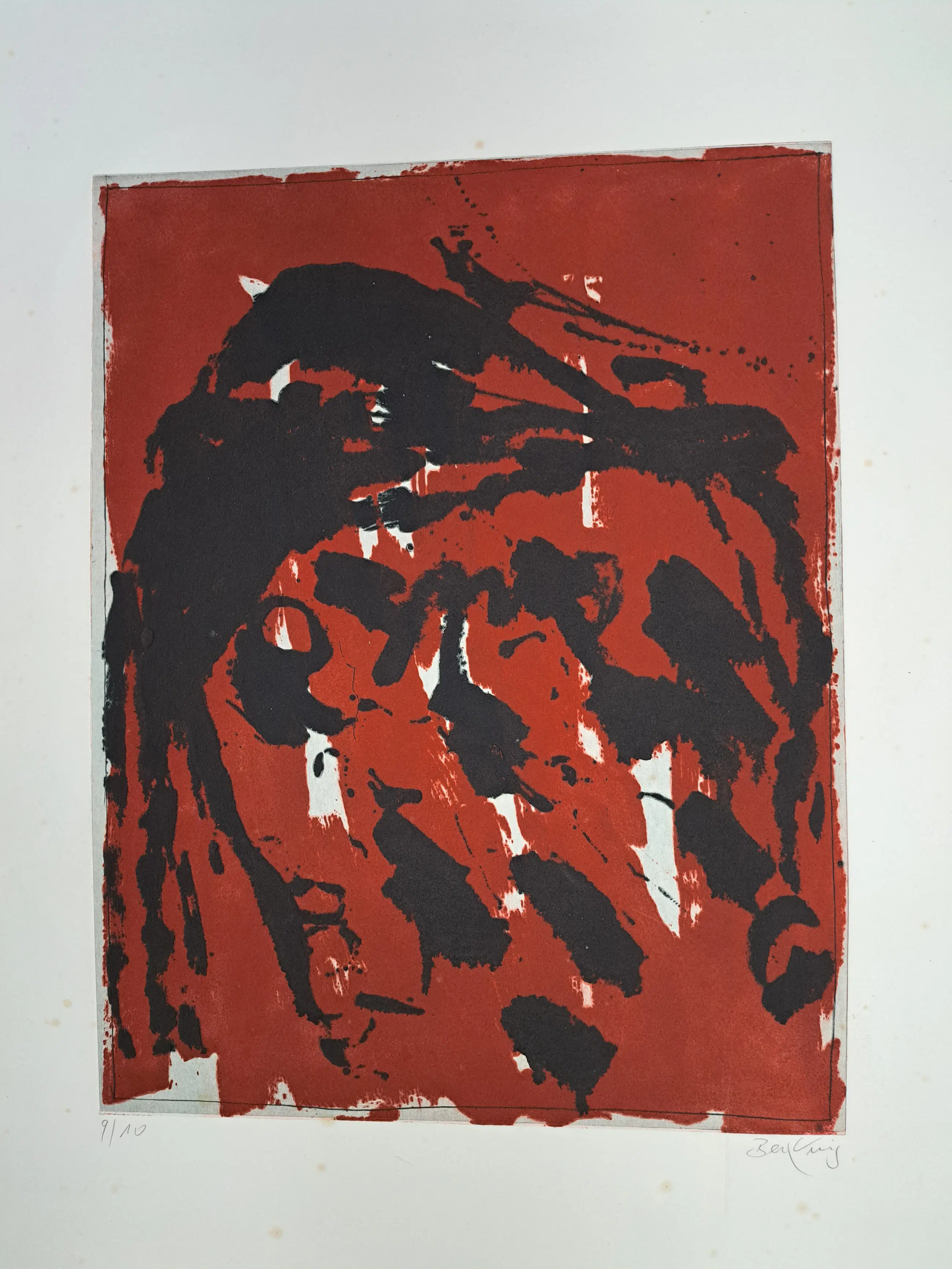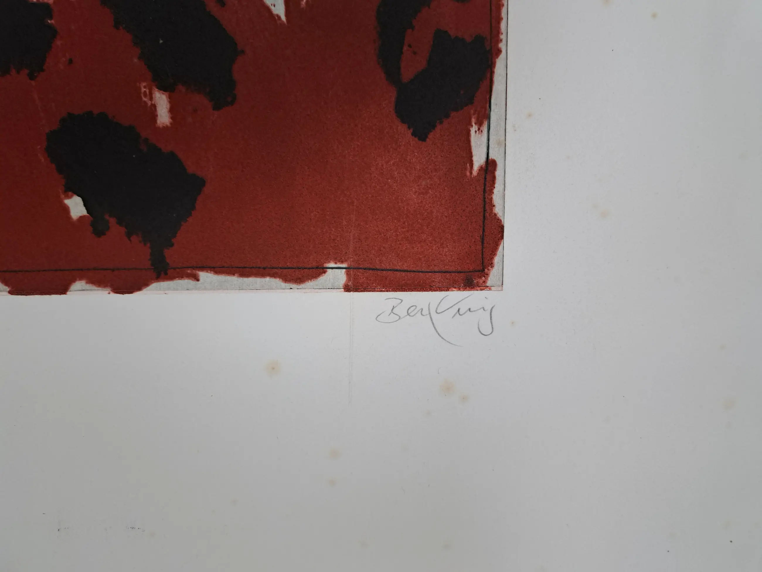 BECKING Horst (°1937) Ohne Titel Kleurets en aquatint Getekend en genummerd 9/10 Afmetingen ets : 64,5 x 50 cm Afmetingen blad : 108 x 79 cm In de marges van de prent spotvlekjes, klein scheurtje (1.5 cm) en enkele vouwen ( zie foto's)