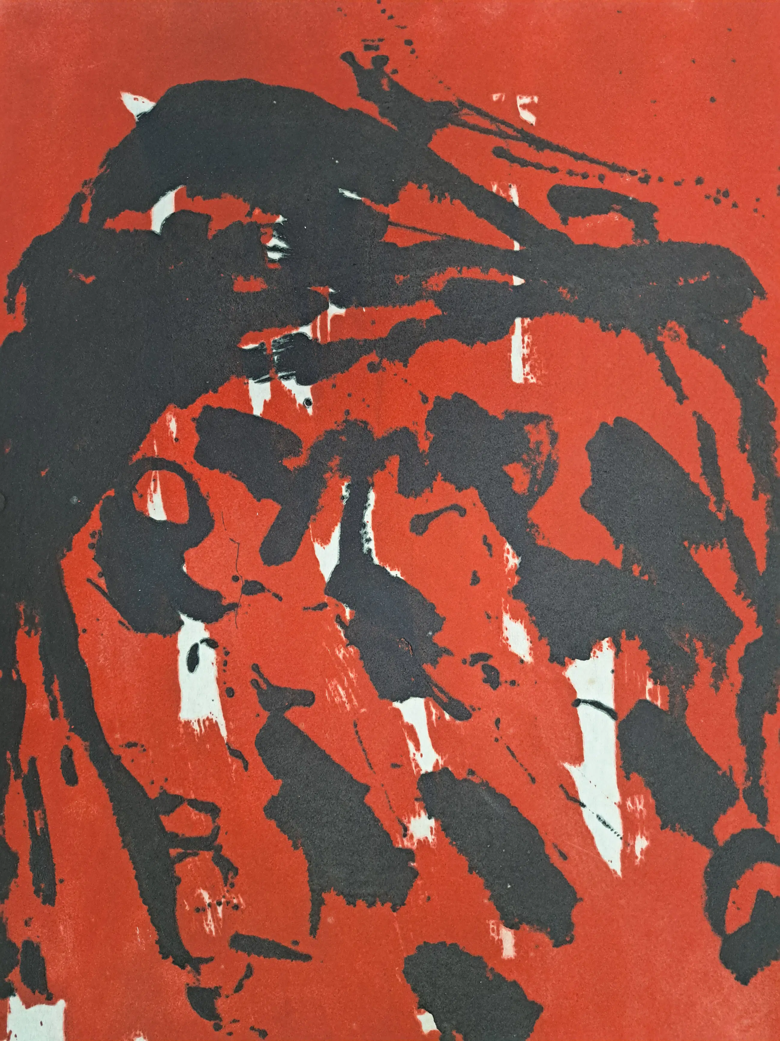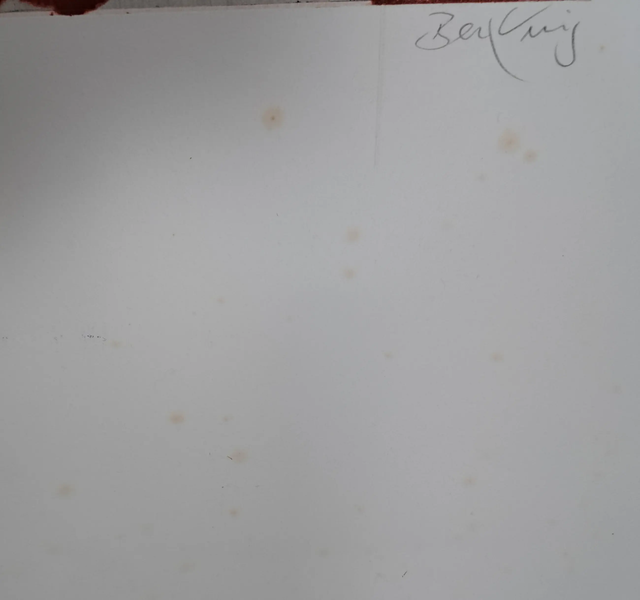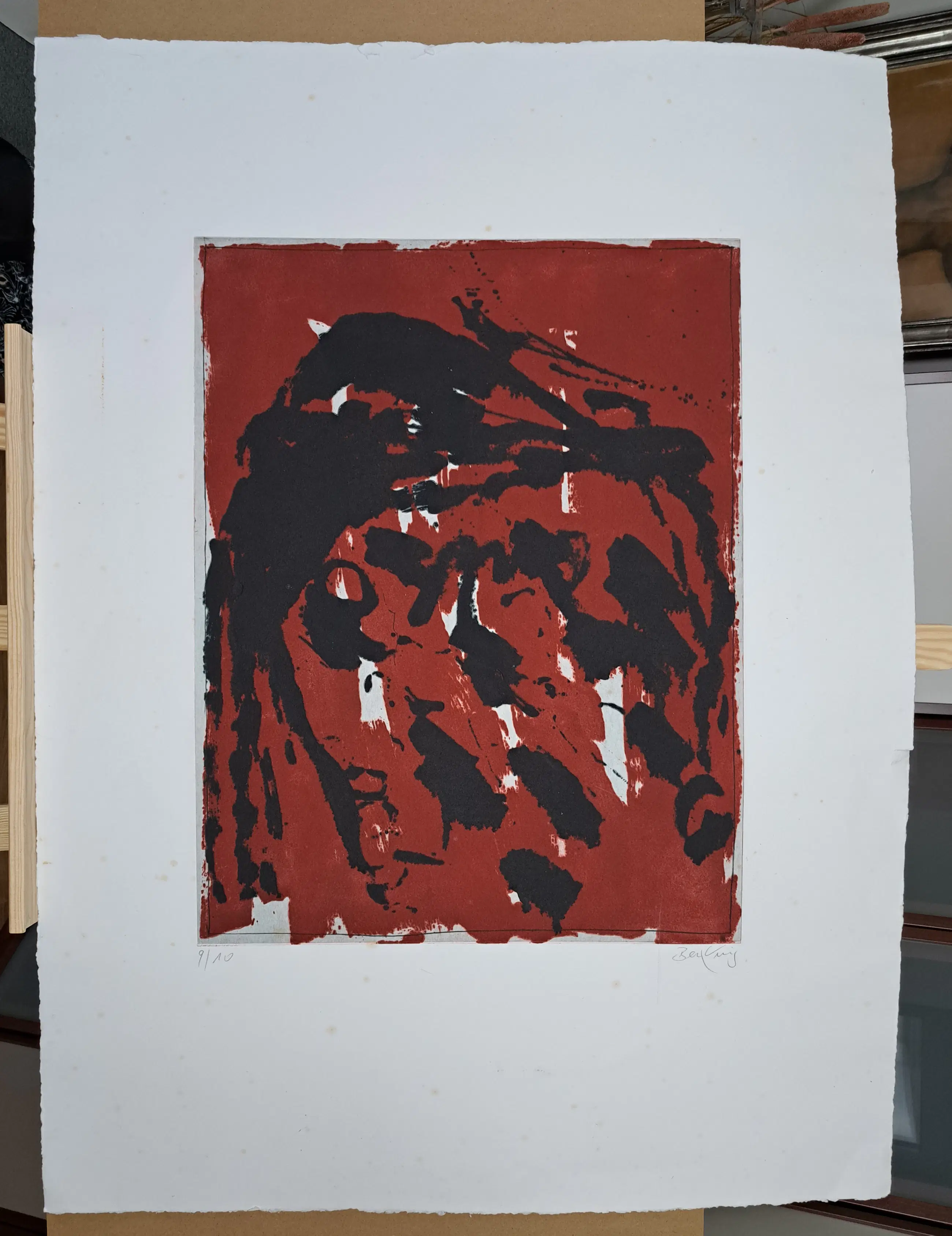 BECKING Horst (°1937) Ohne Titel Kleurets en aquatint Getekend en genummerd 9/10 Afmetingen ets : 64,5 x 50 cm Afmetingen blad : 108 x 79 cm In de marges van de prent spotvlekjes, klein scheurtje (1.5 cm) en enkele vouwen ( zie foto's)