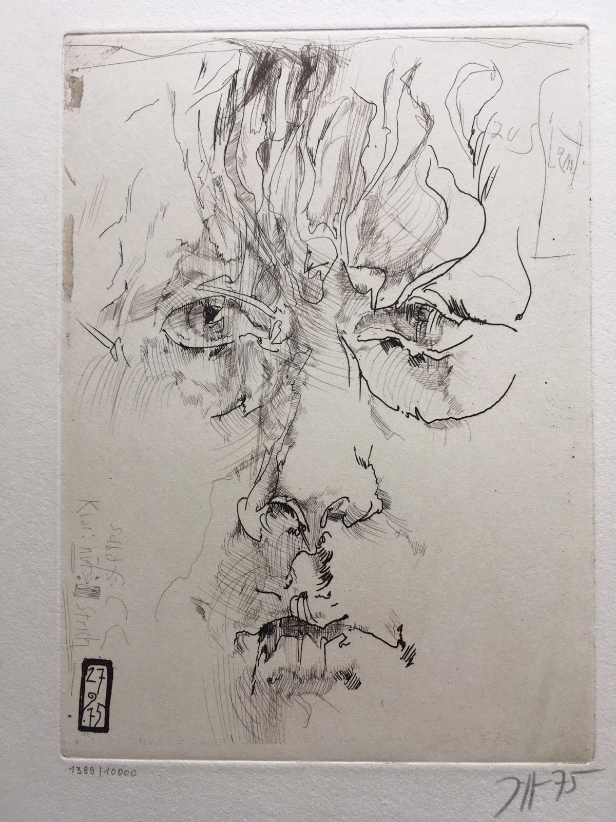 Janssen, Horst, Selbst für C.C. , Kaltnadelradierung 1975, datiert 27.9.1975, handsigniert und nummeriert 1389/10000, Druck Siegfried Reinert, Berlin. Bildformat 23x16cm, Blattformat 42x30cm. Von dieser Radierung gibt es 5000, die anderen 5000 basieren auf einem am 1.10.1975 gefertigten Selbst.