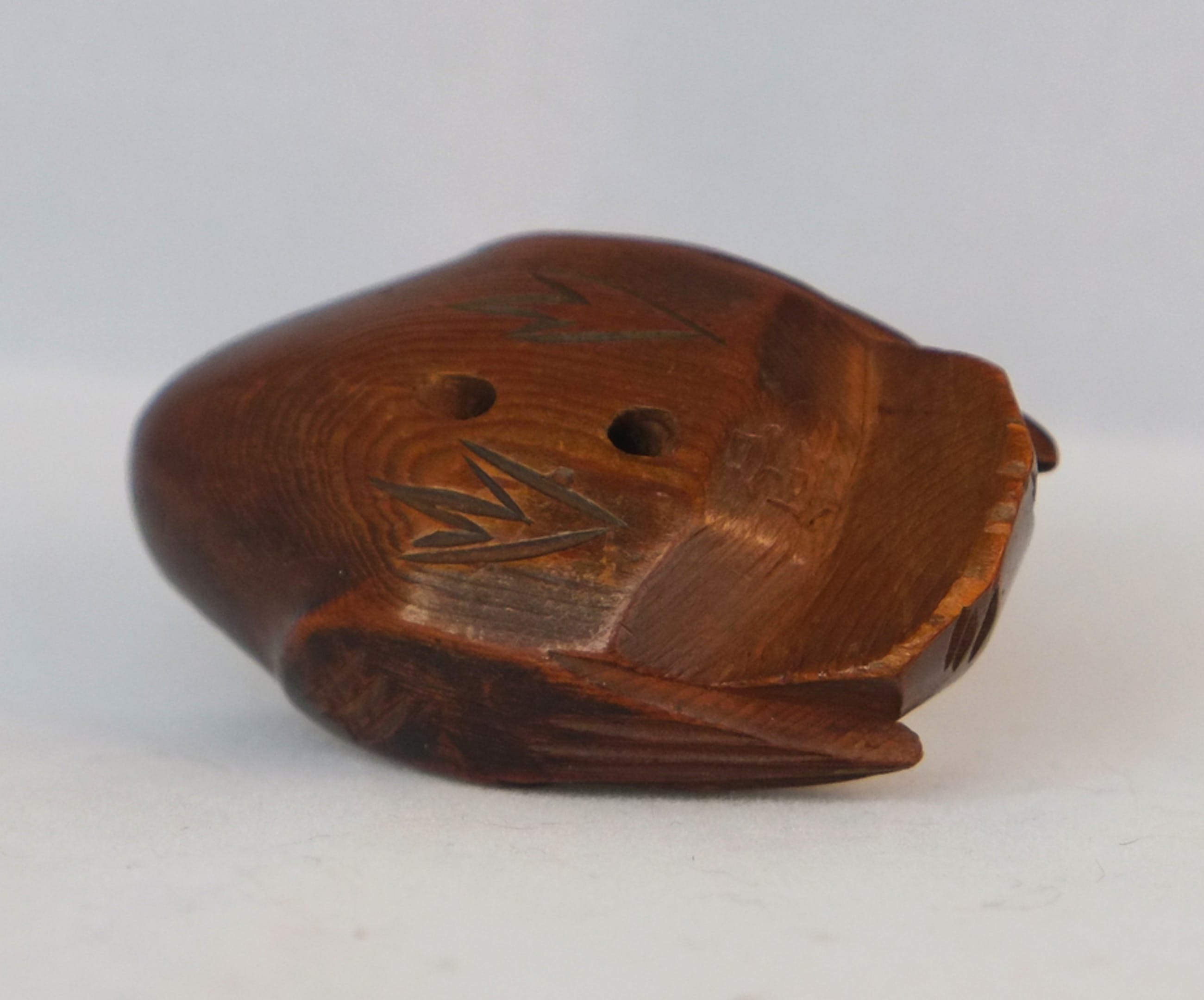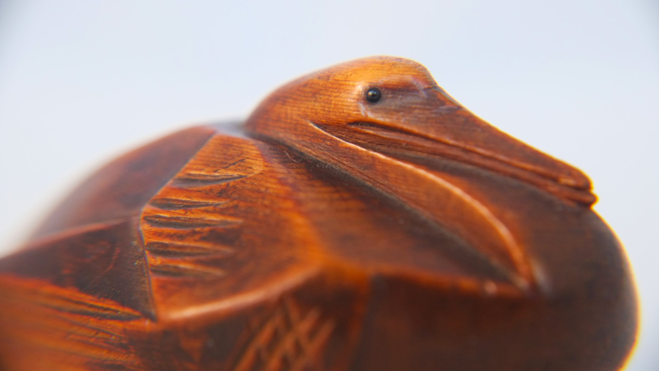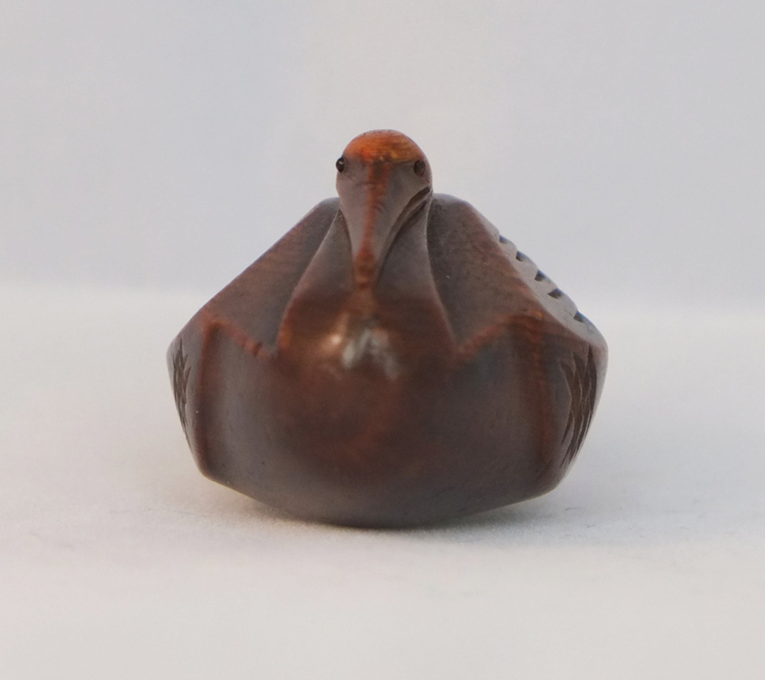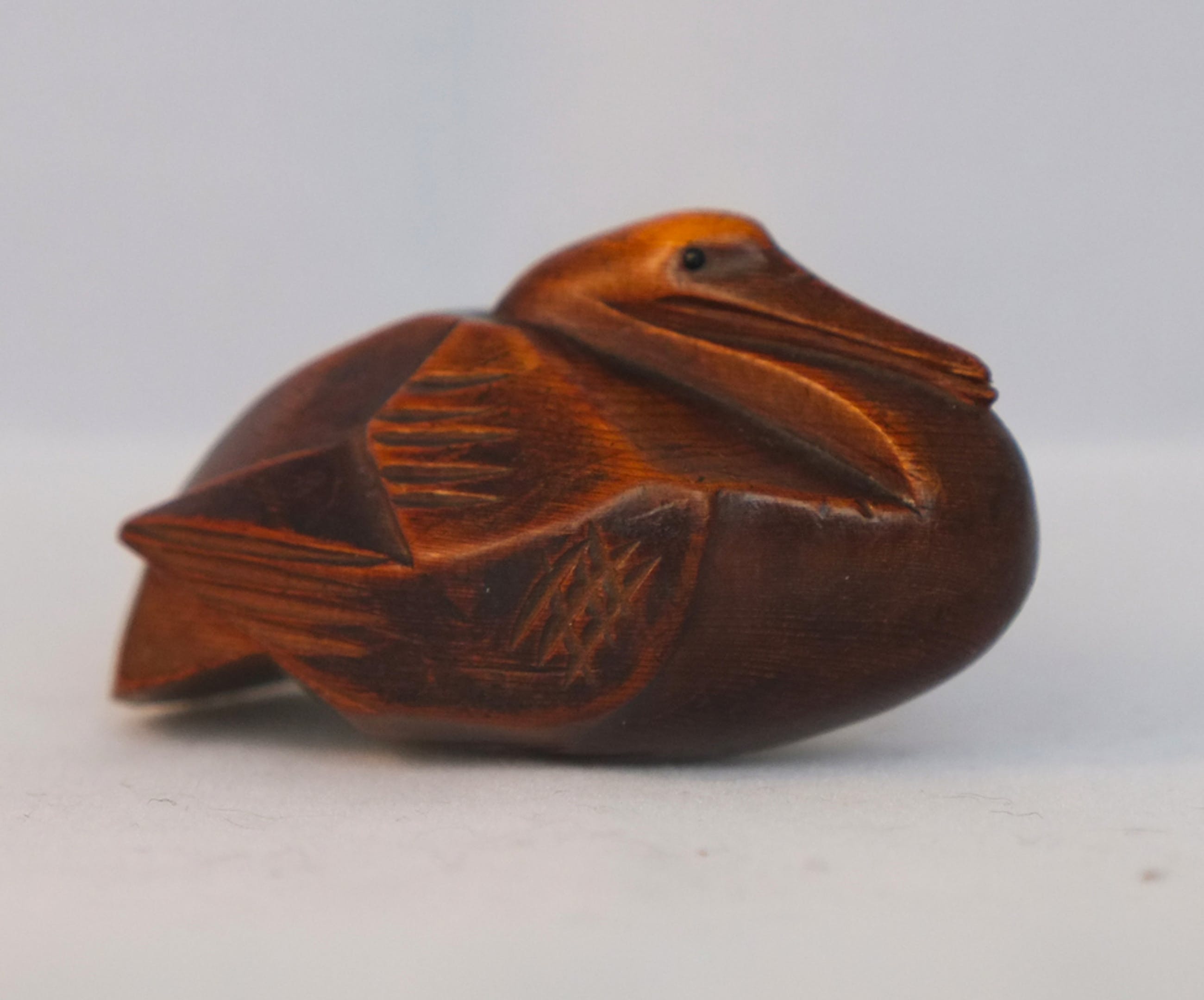 Mooie houten Netsuke van een fraai vormgegeven pelikaan. Het beeltje is aan de onderzijde gesigneerd en heeft de voor een Netsuke karakteristieke gaten waar het koortje doorheen ging om het rond een traditionele kimono te dragen. Er mist 1 kraaltje van een oog maar is indien gewenst gemakkelijk te vervangen. Bekijk de foto's voor een algehele indruk.