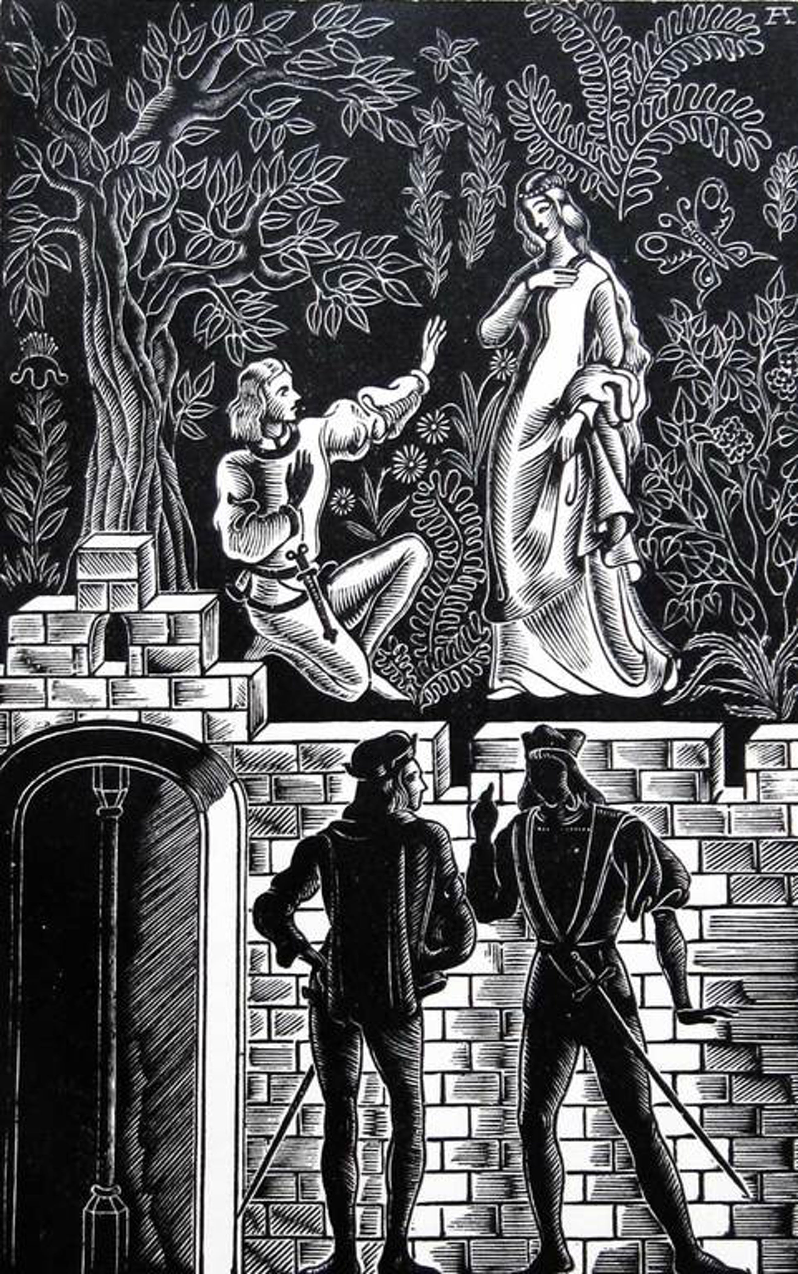 Houtsnede van Desiré Acket uit Karel van de Woestijne's ROMEO OF DE MINNAAR DER LIEFDE, 1941. Afm. blad: 15,5 x 23 cm, houtsnede 10 x 16 cm. Gesigneerd in de druk. Verzending NL 3,50 euro, Belgie 6 euro.