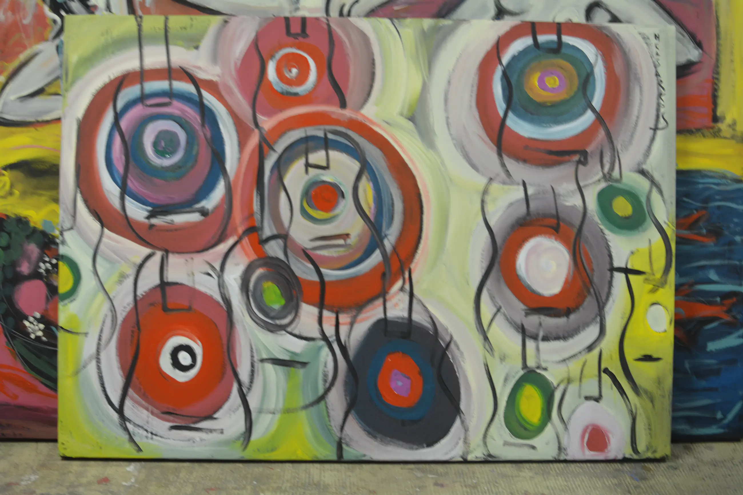 Titel - Akoestische gitaren Medium - Acryl op canvas Afmeting - 100x140 cm Handtekening - Gesigneerd rechtsboven Certificaat - met Certificaat van Echtheid Verzending in een veilige stijve buis