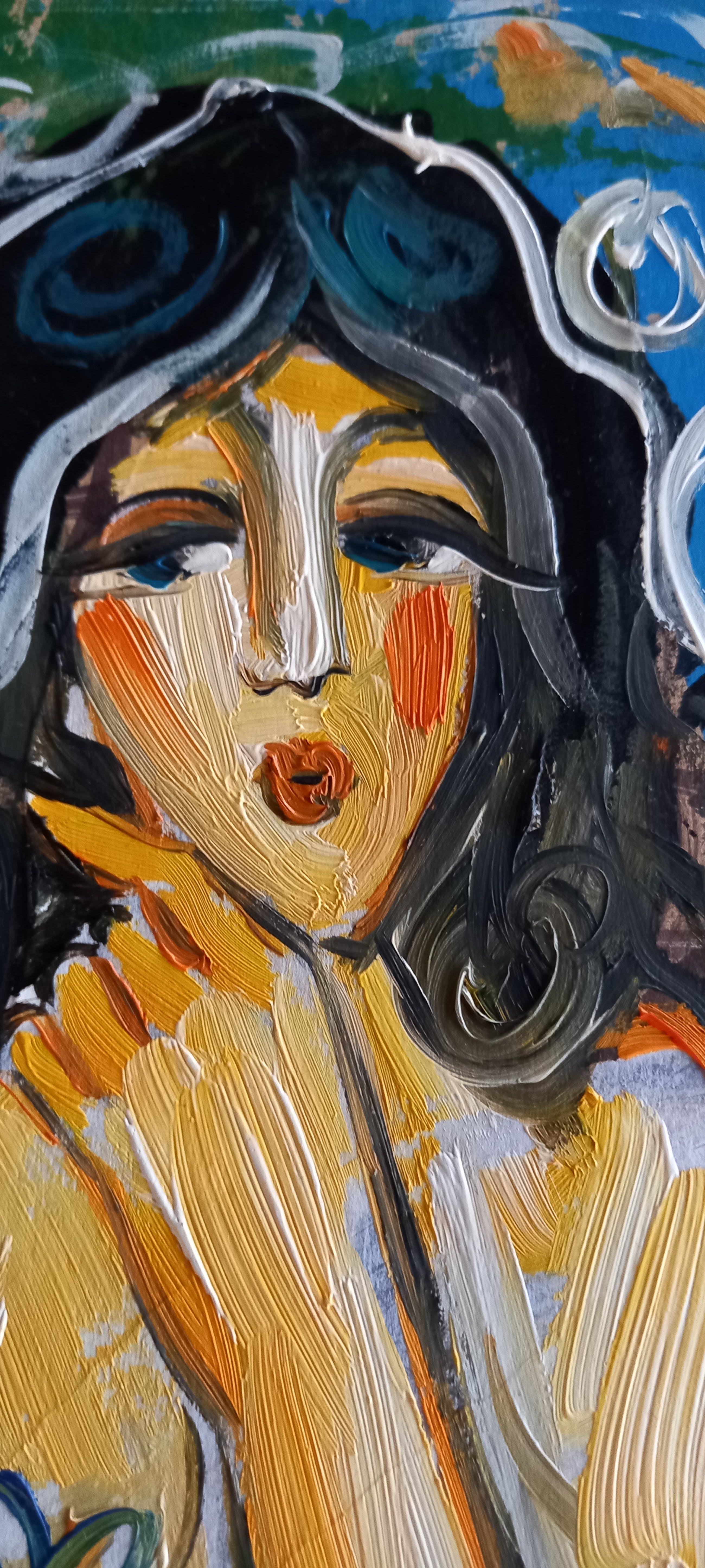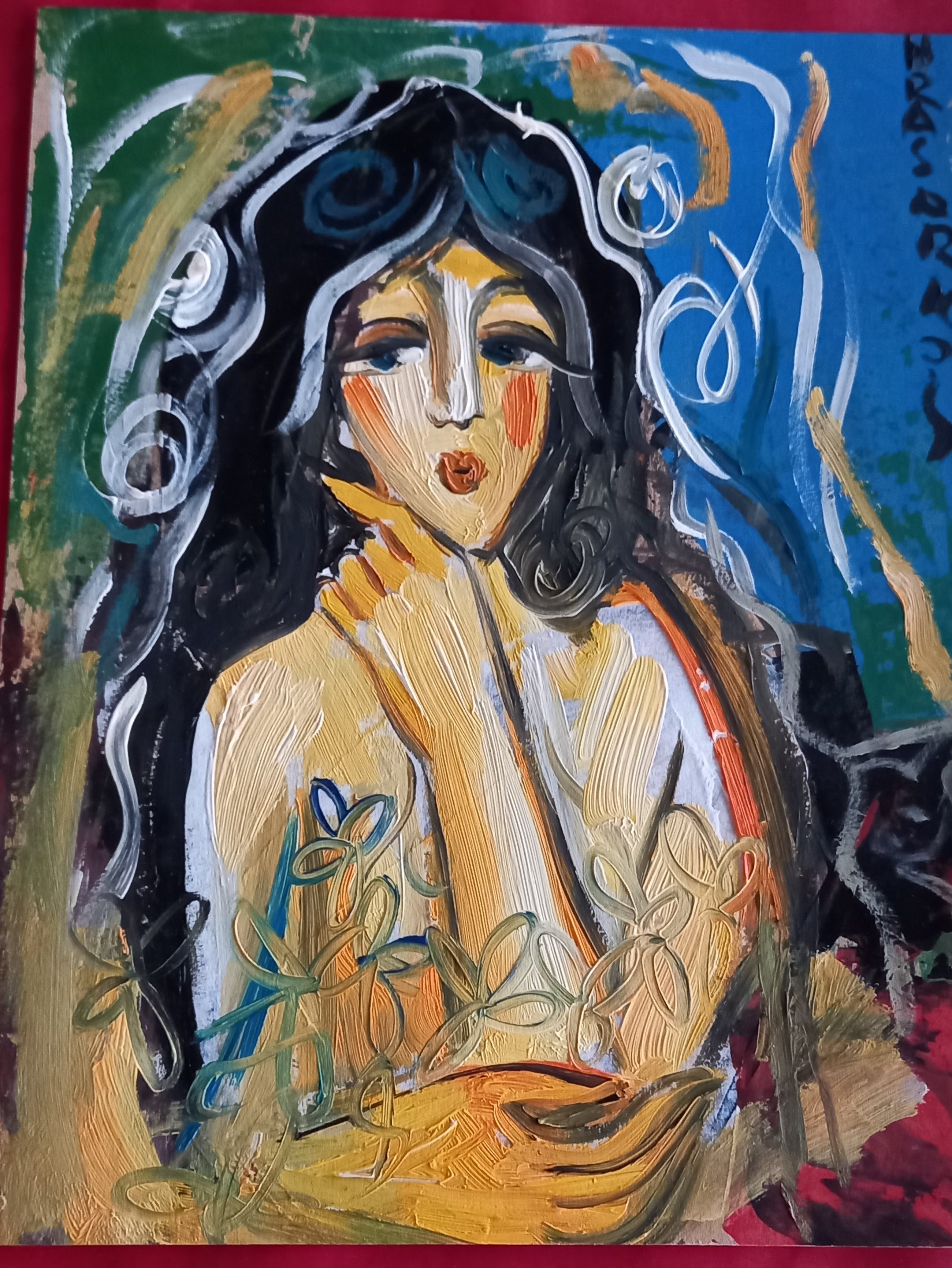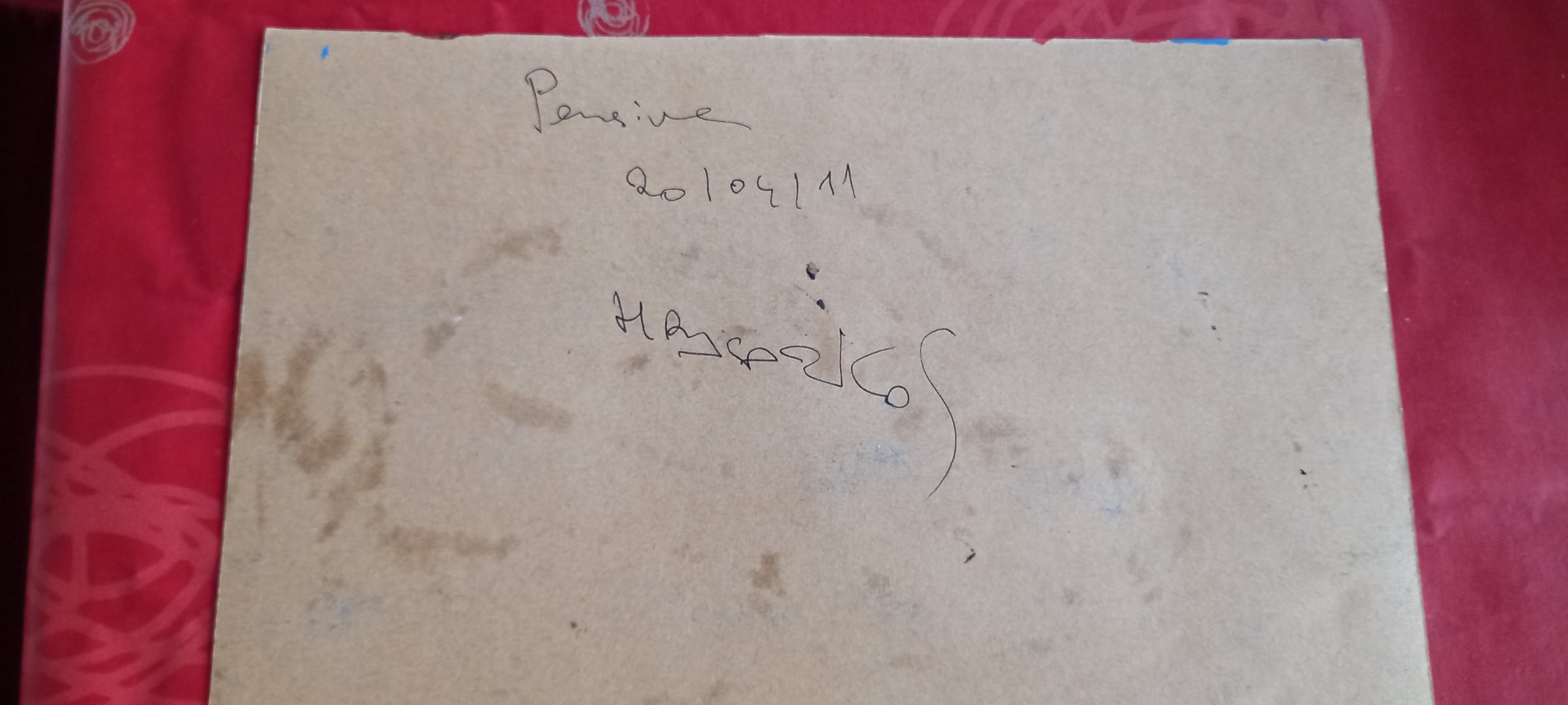 "Pensive" (nadenkend) is een werk van de Franse artiest Hrasarkos. In zijn typische "art brut" stijl met felle kleuren en een dikke laag verf. Gesigneerd op het werk en op de achterzijde vindt u eveneens handtekening + titel + datum.