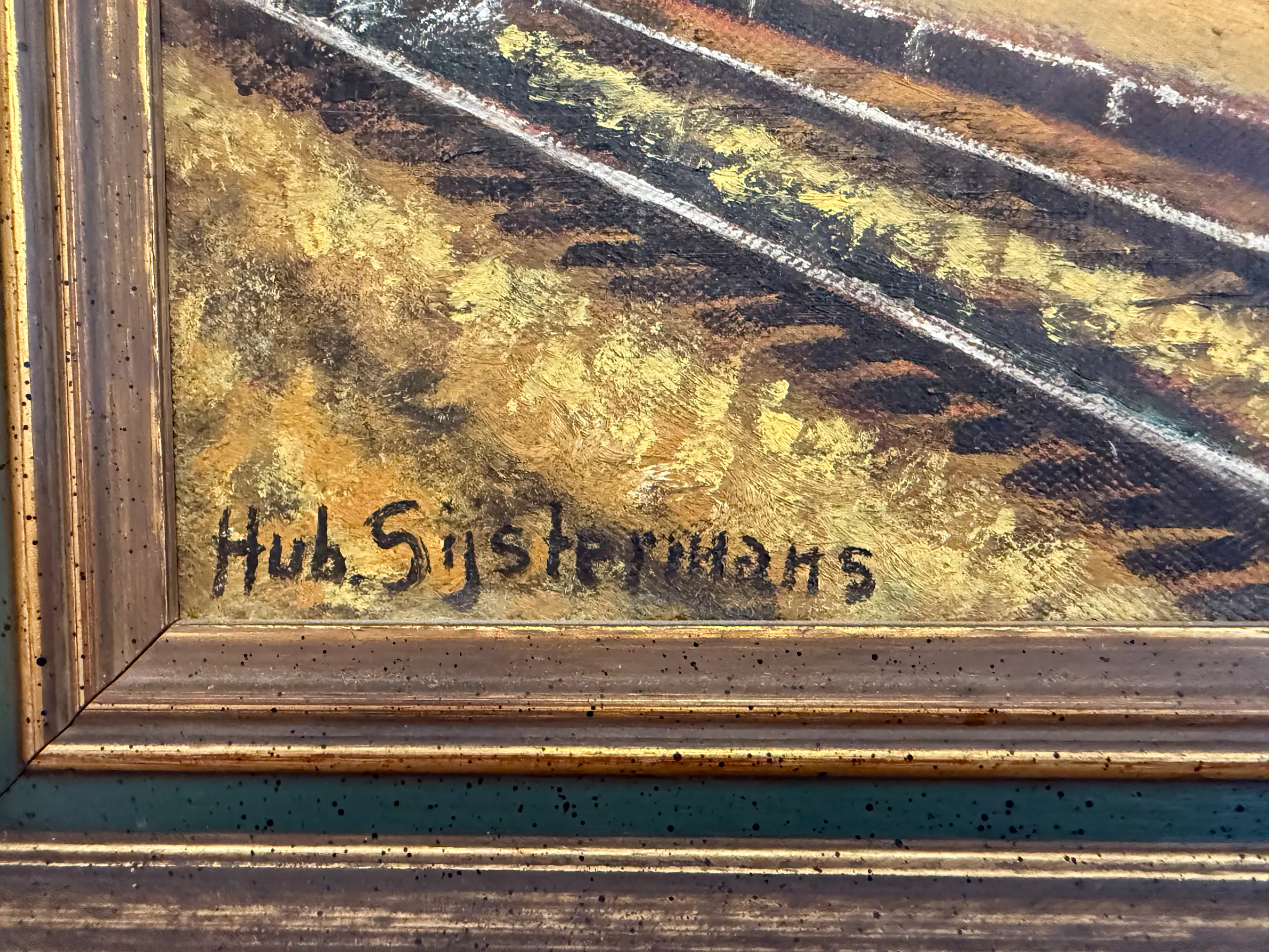 Geen gebreken; het schilderij heeft lange tijd in de kamer gehangen. Er kunnen lichte gebruikssporen aanwezig zijn.
