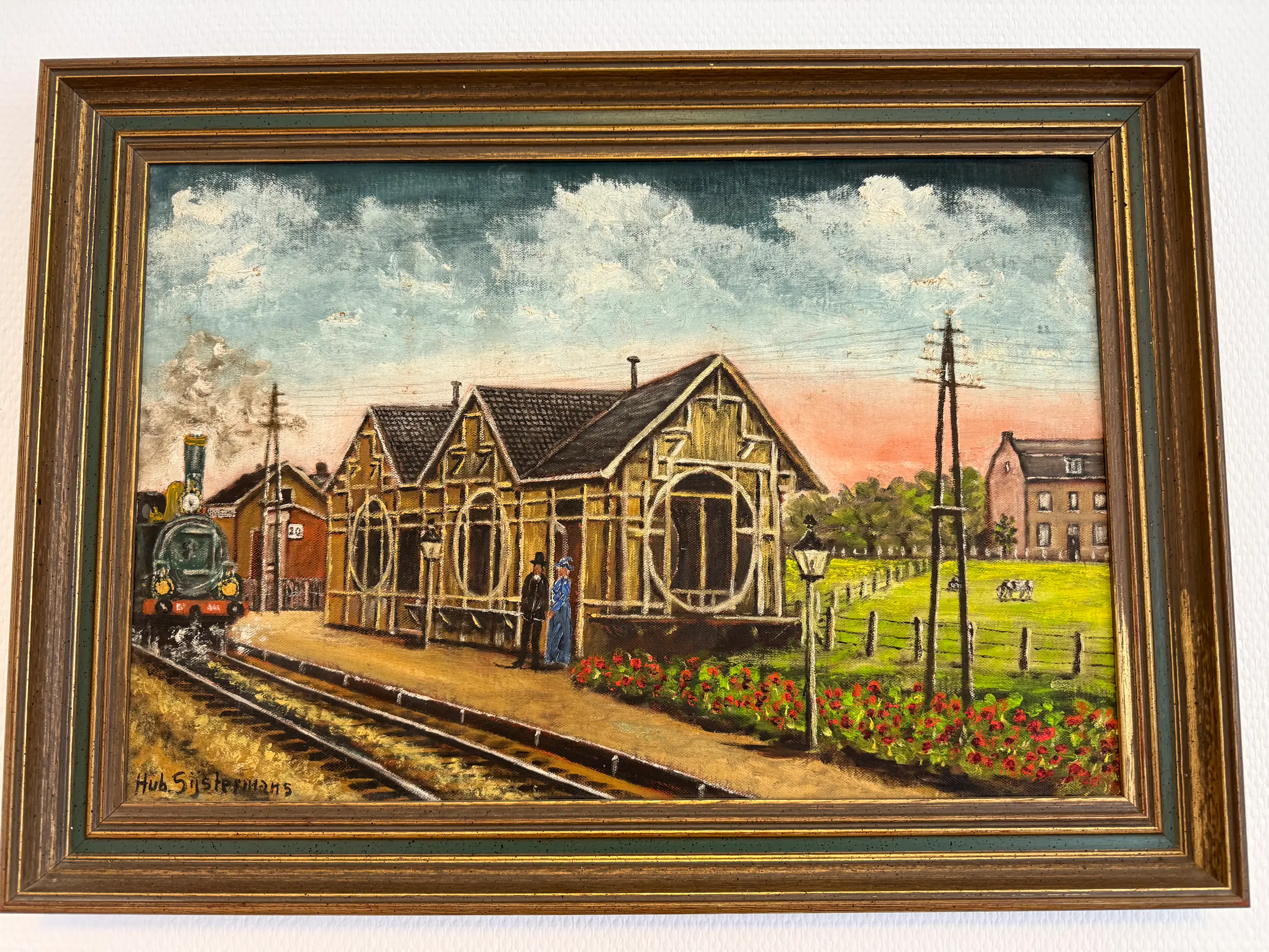 Te koop aangeboden: een gesigneerd en ingelijst olieverfschilderij van Hub Sijstermans. Het schilderij beeldt het oudste nog bestaande treinstation van Nederland af: Valkenburg (1853).