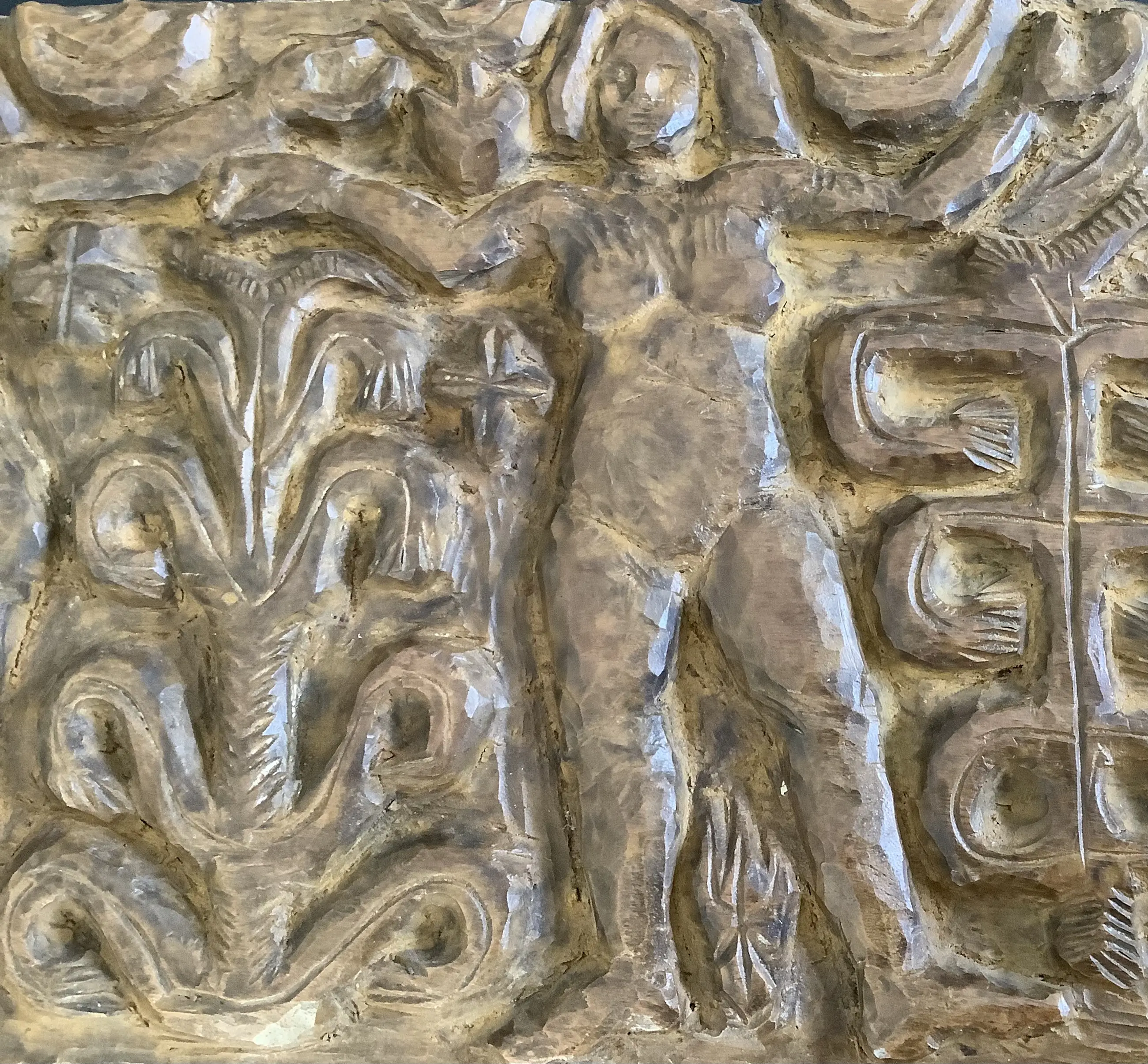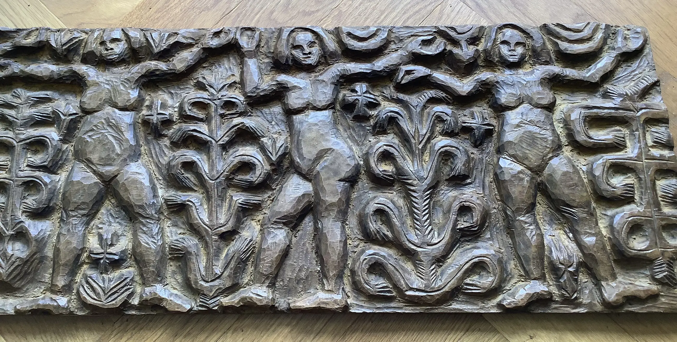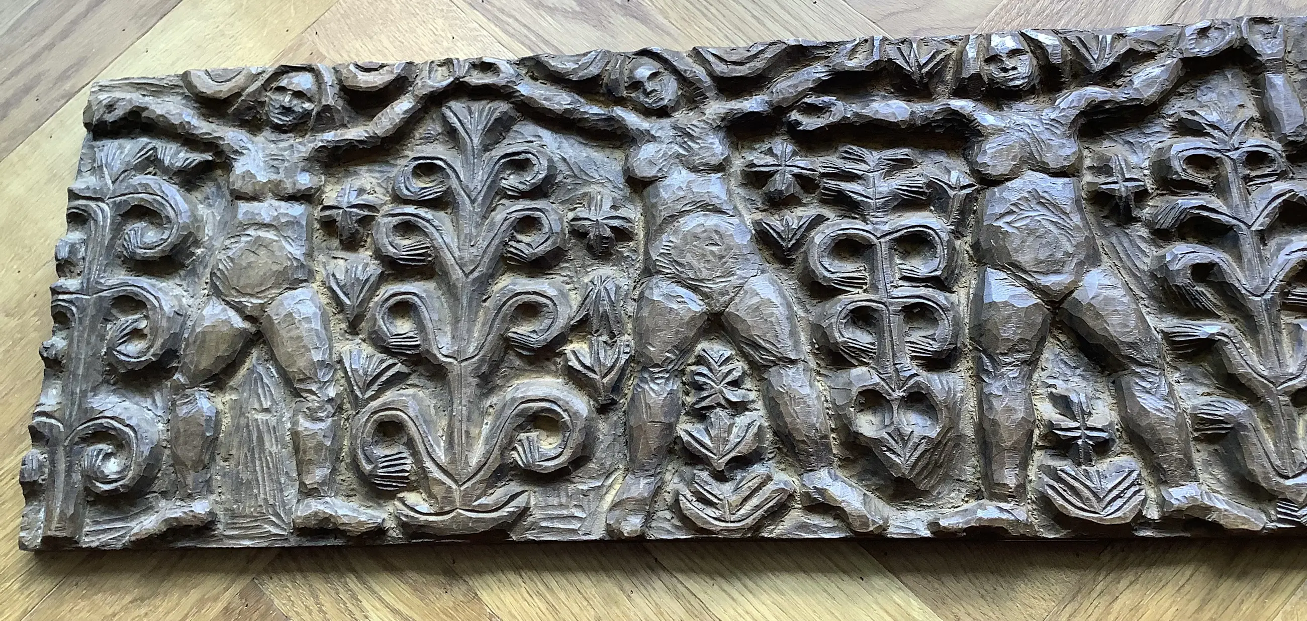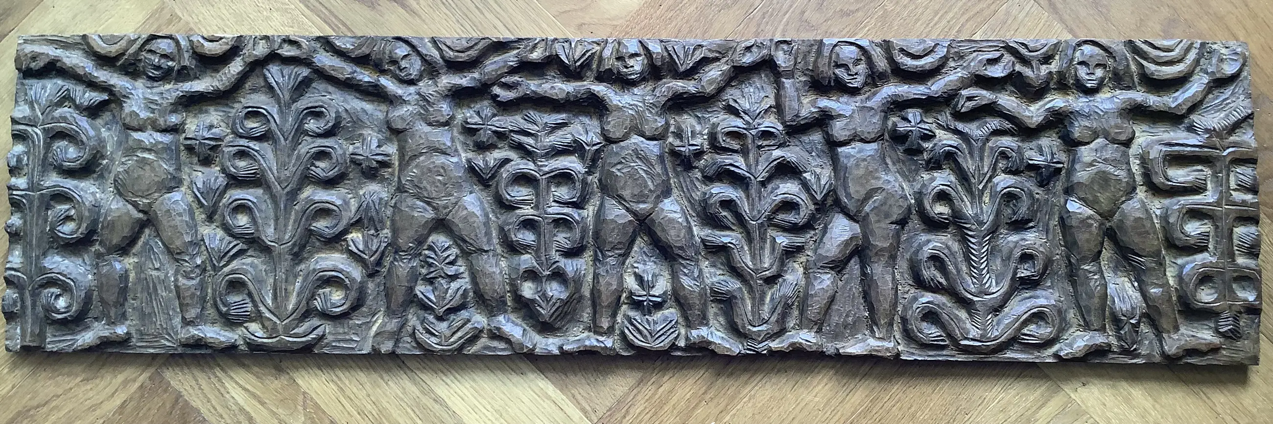Fraai en decoratief, typerende houtsculptuur van H. Bekman. Nieuwe Haagse School. Notenhout.