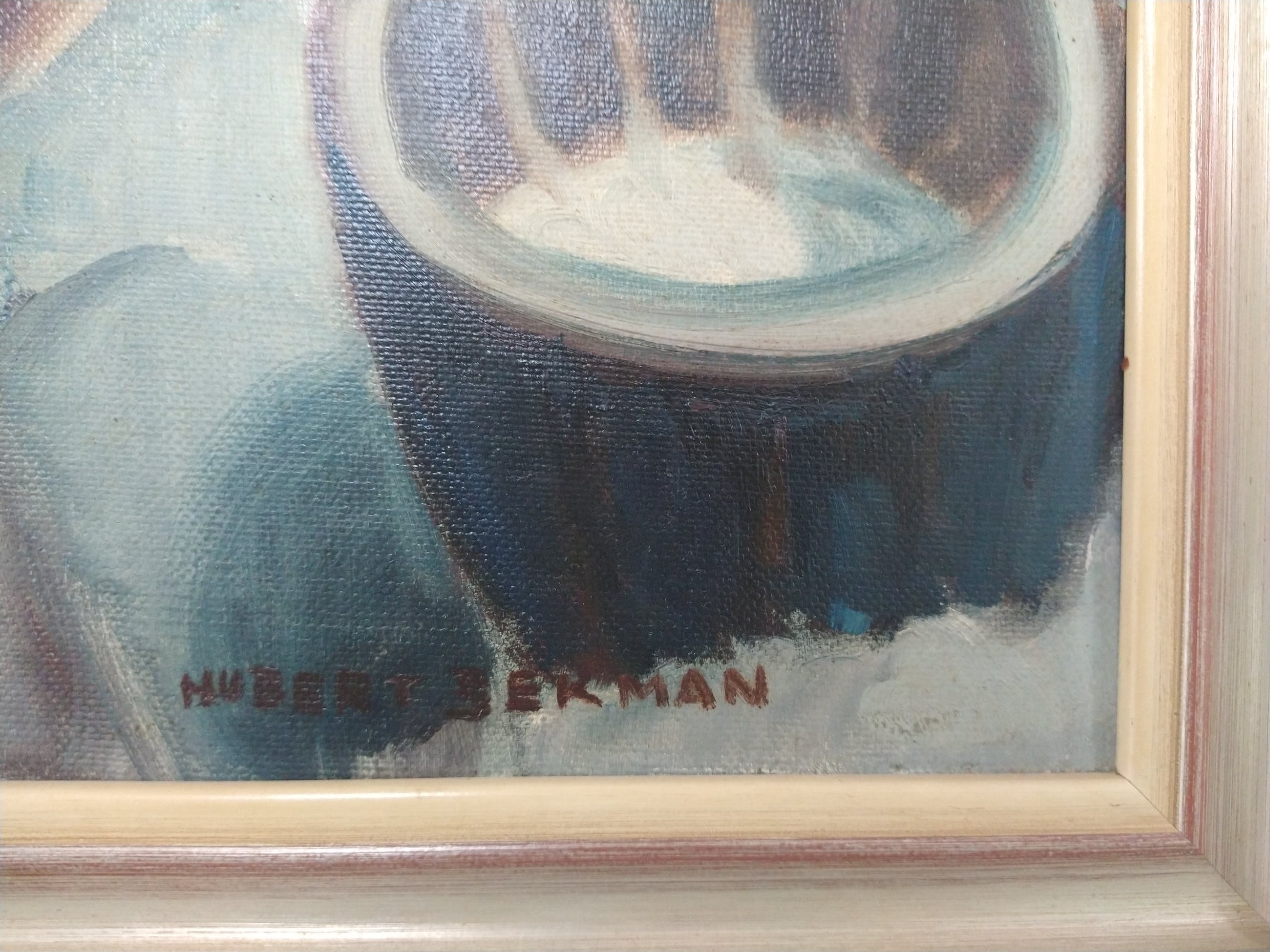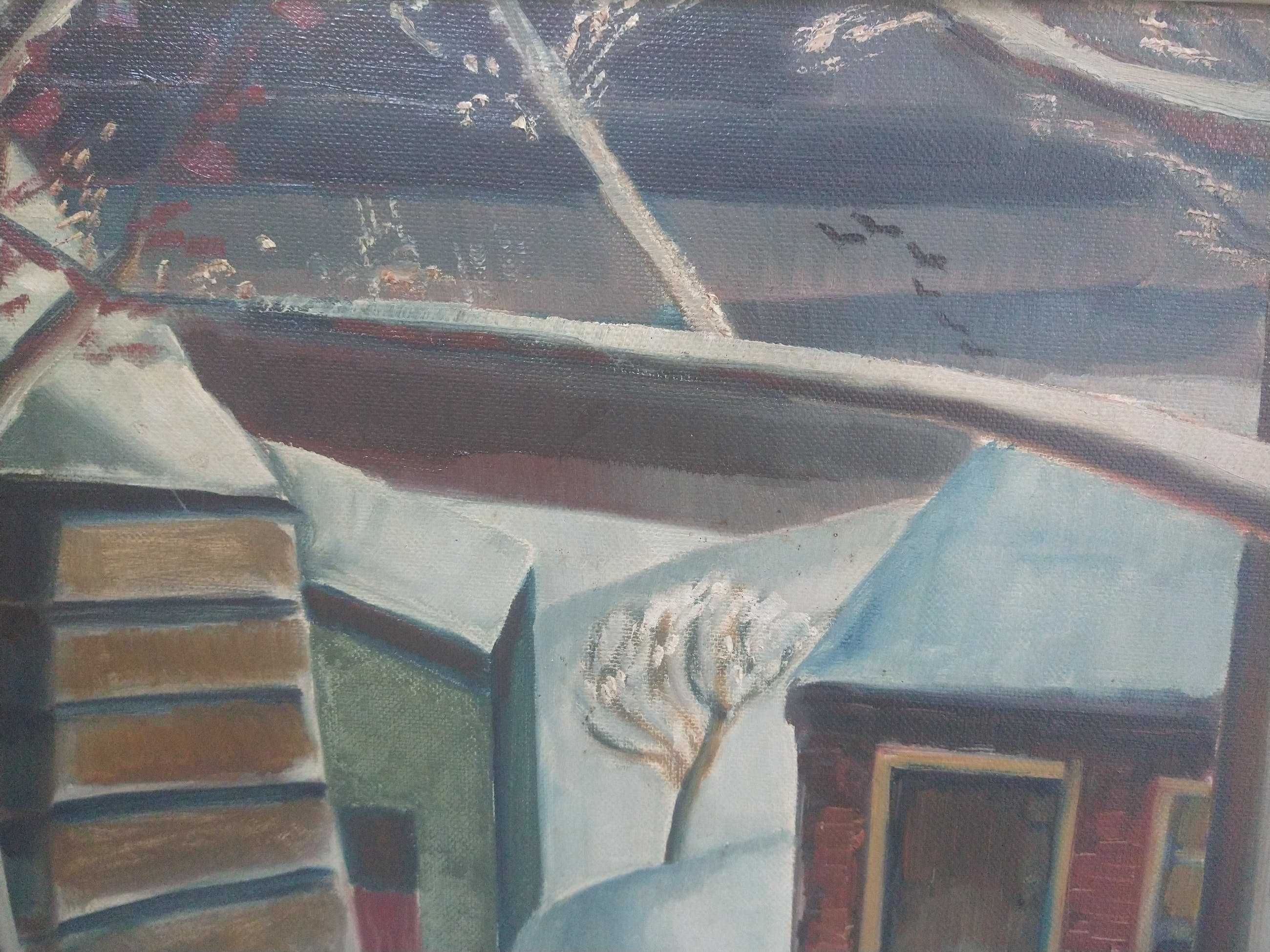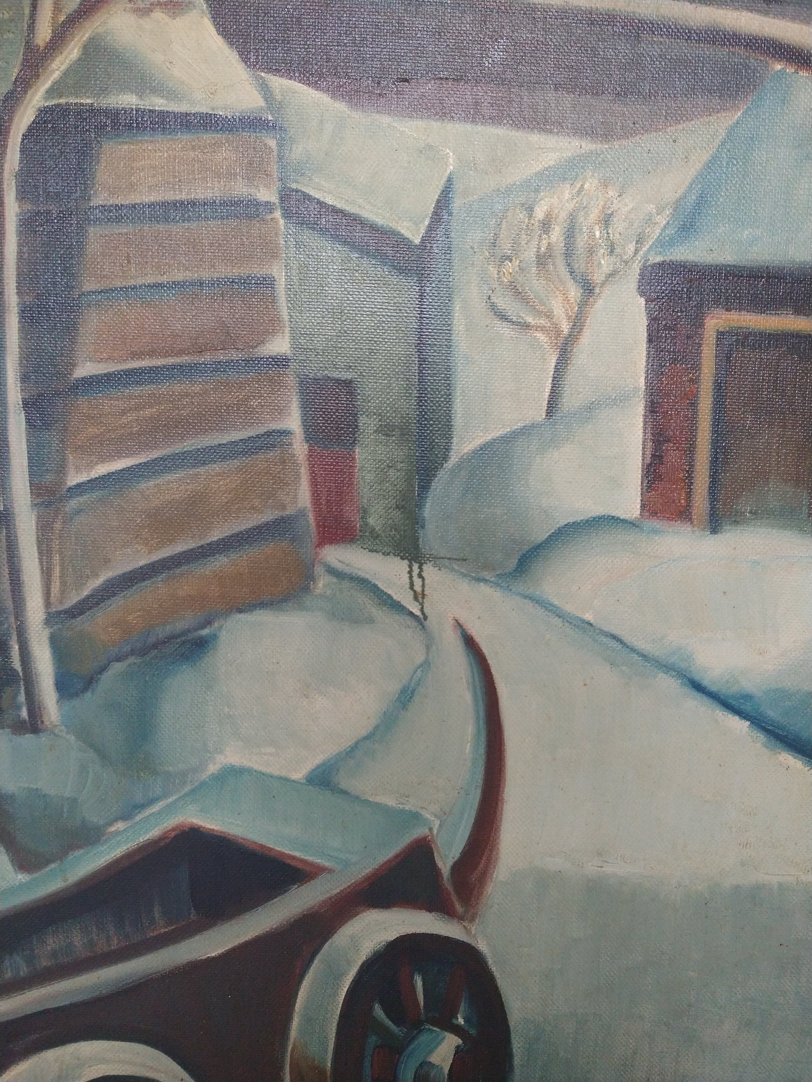 Boerenerf in de sneeuw door Hubert Bekman Betreft mogelijk Limburg Aan het spanraam en aan het doek te zien is dit een redelijk vroeg werk van Bekman. Ik vermoed zelf ergens rond 1930-1935