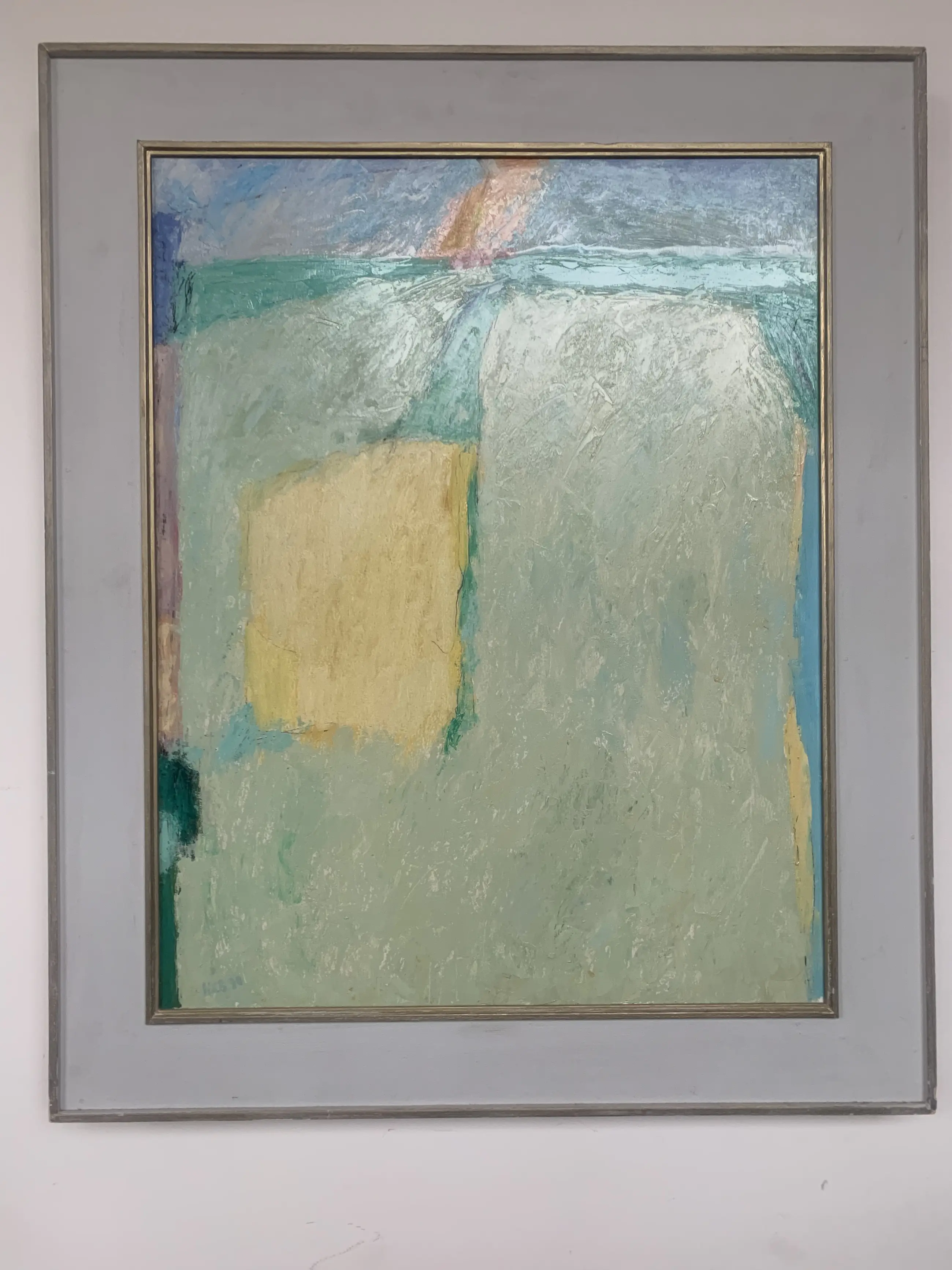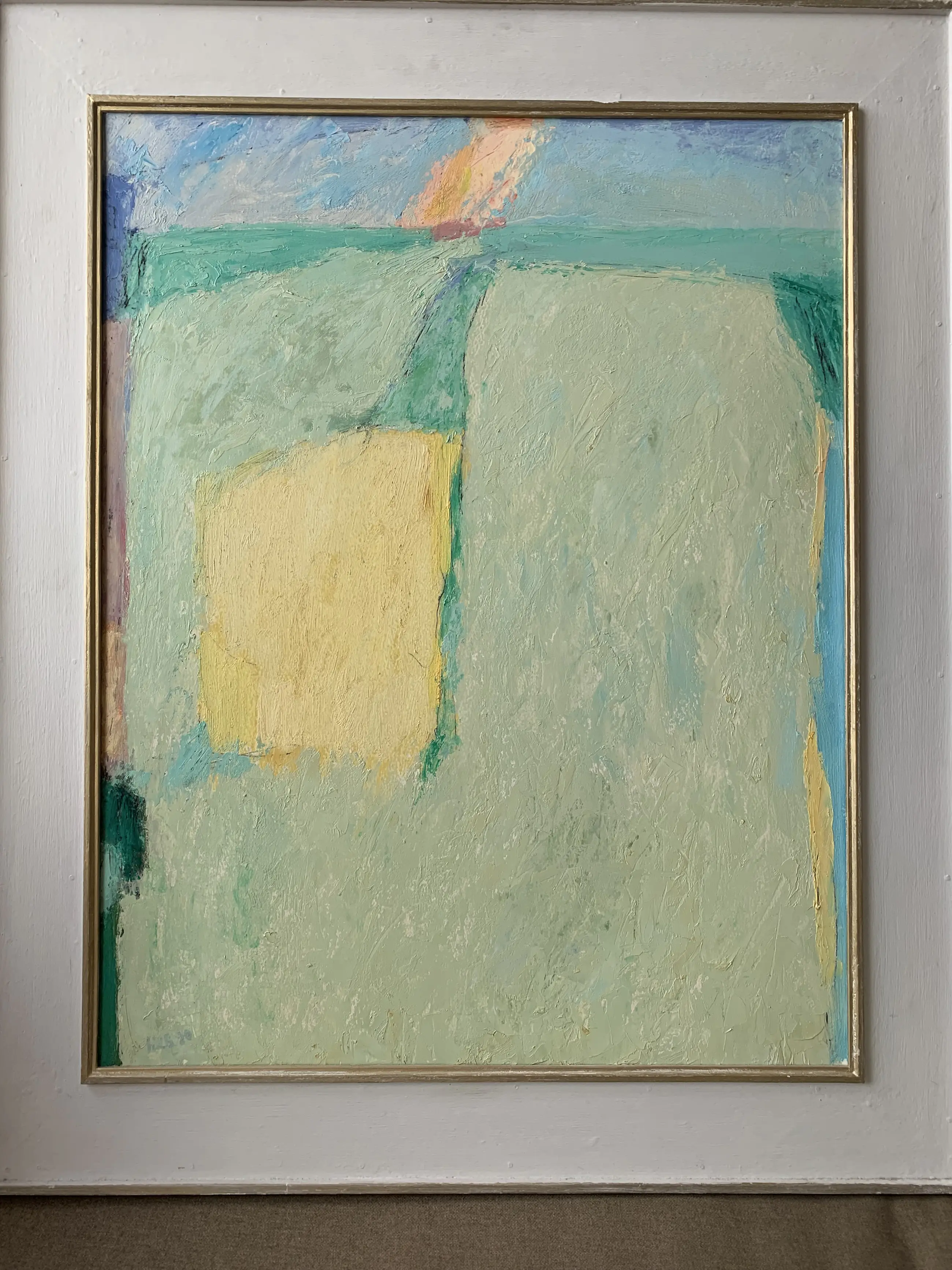 Landschappelijk geïnspireerd werk. De lijst is door de kunstenaar zelf vervaardigd.