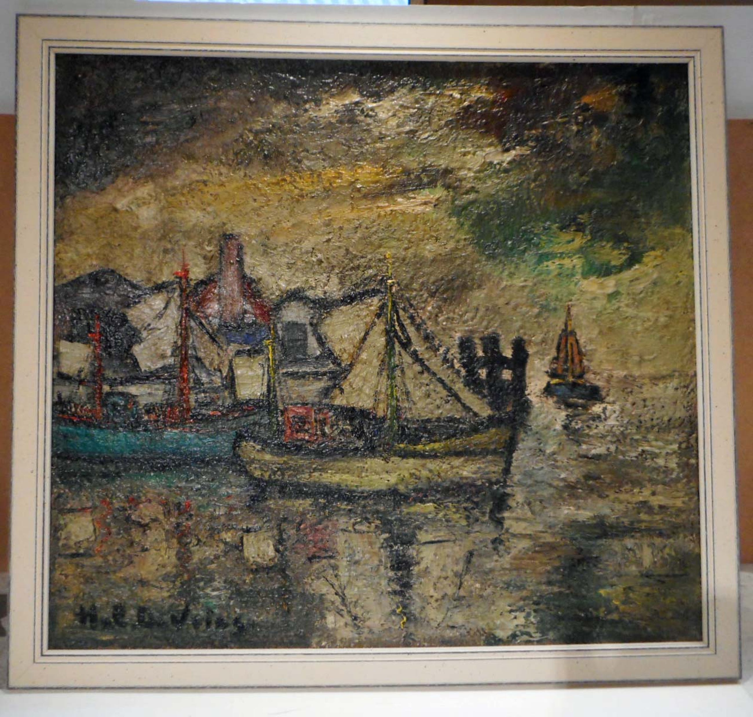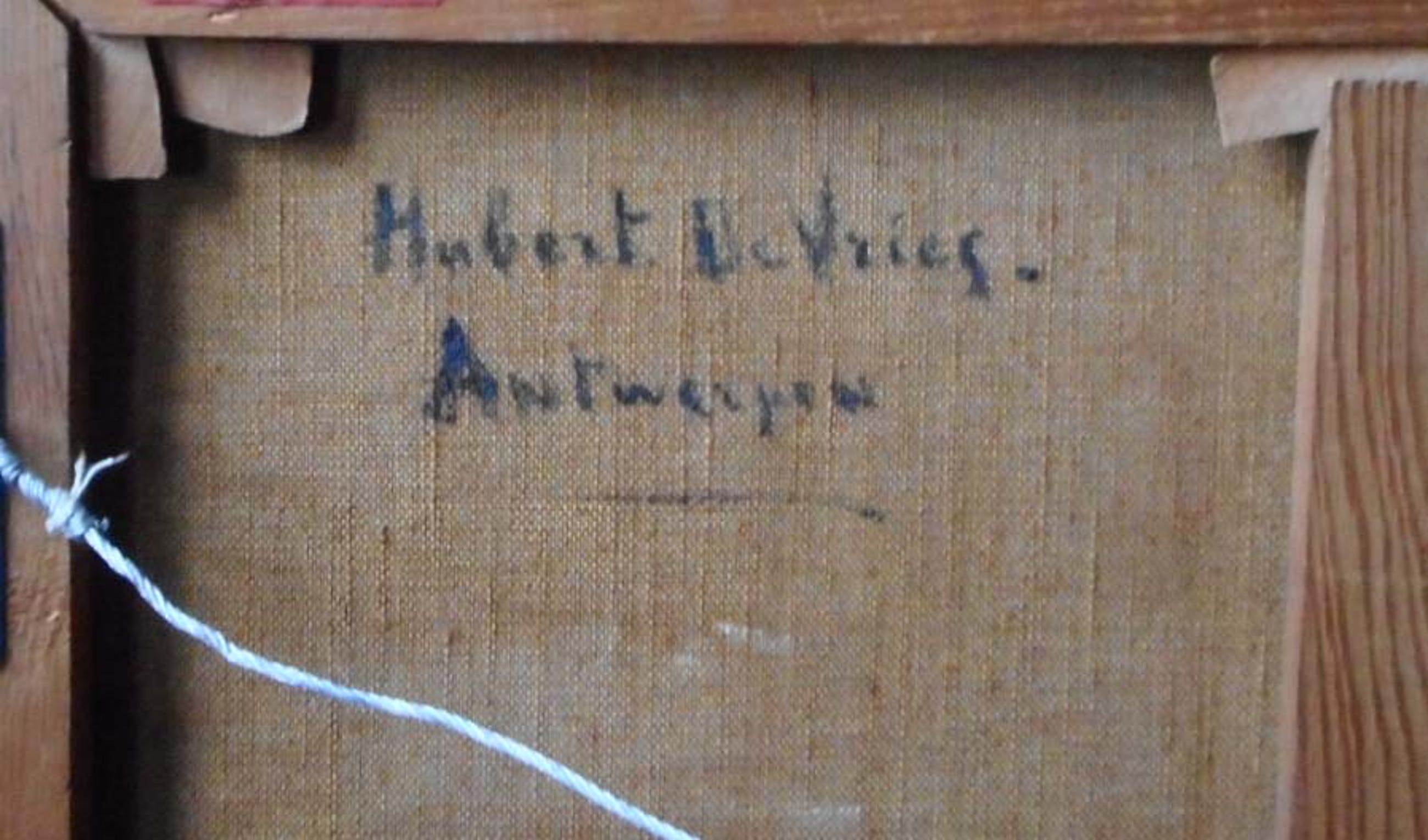 Mooie "zware" de Vries met pasteuse structuur een "levendig" schilderij. Hubert De Vries was een Belgische kunstenaar geboren te Antwerpen in 1899 en die gestorven is aldaar in 1979. Hij was een schilder. Bracht een groot deel van zijn jeugd door te Calais. Vanaf 1918 opleiding aan de Academie te Antwerpen o.l.v. Is. Opsomer en J. Creytens. Maakte kennis met Permeke, G. De Smet en A. Servaes en evolueerde al vlug naar expressionistische vormgeving en koesterde ook bewondering voor J. Smits. Realiseerde o.m. marines, figuren, portretten, clowns, religieuze onderwerpen. De klonterige verfpasta en het mystieke licht waarin sommige werken baden herinneren aan Jakob Smits. Vermeld in BAS I en Twee eeuwen signaturen van Belgische kunstenaars. (PIRON)