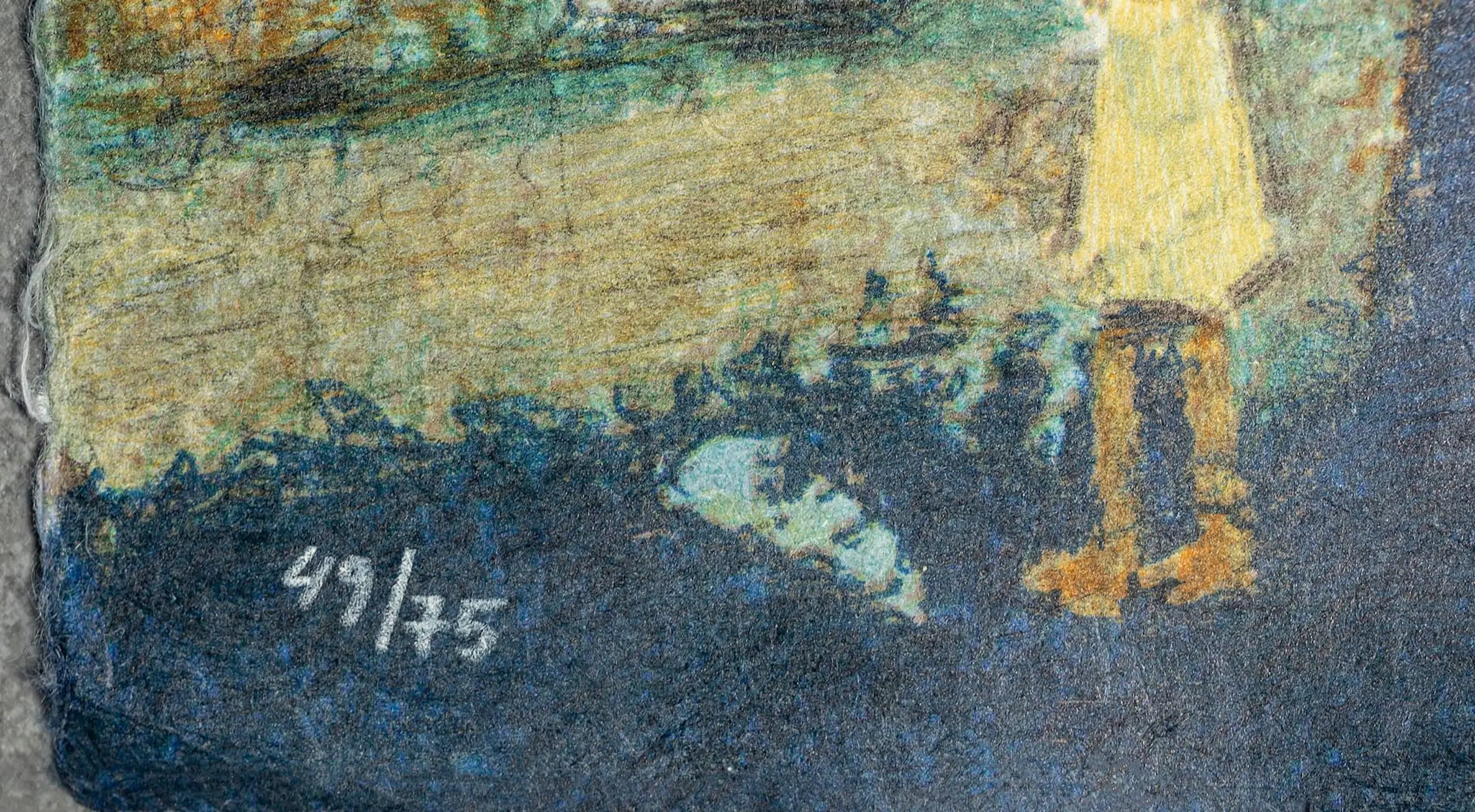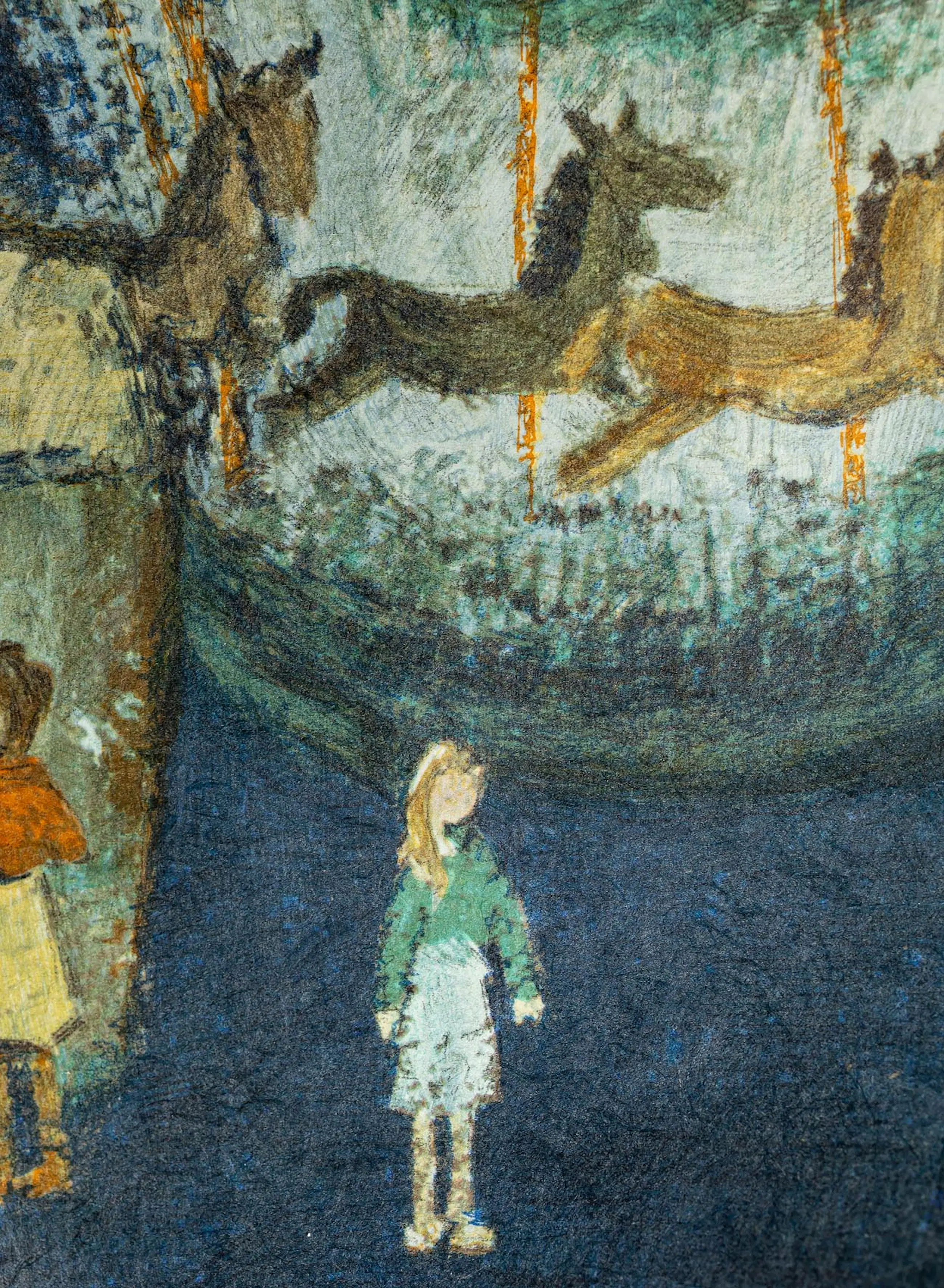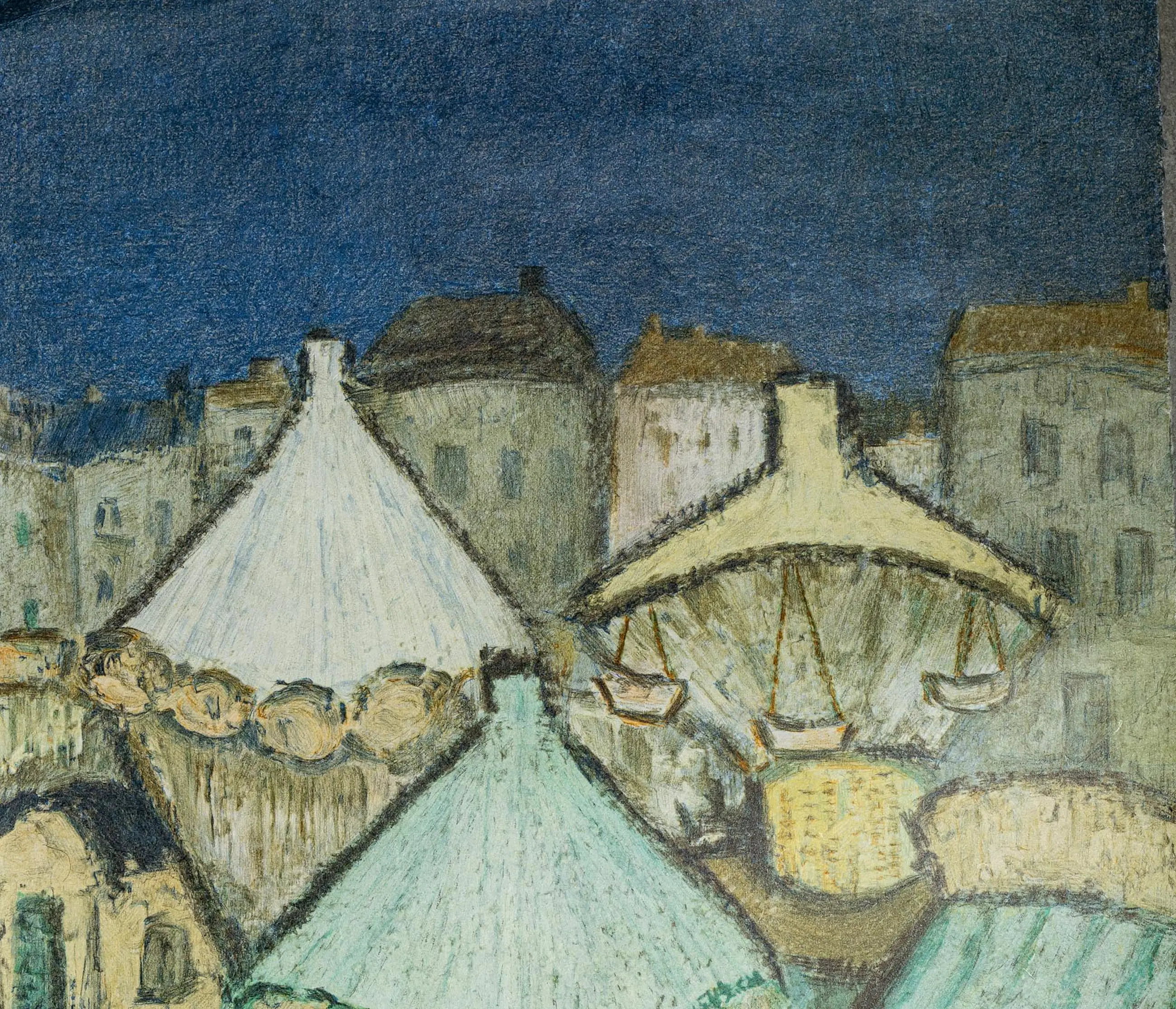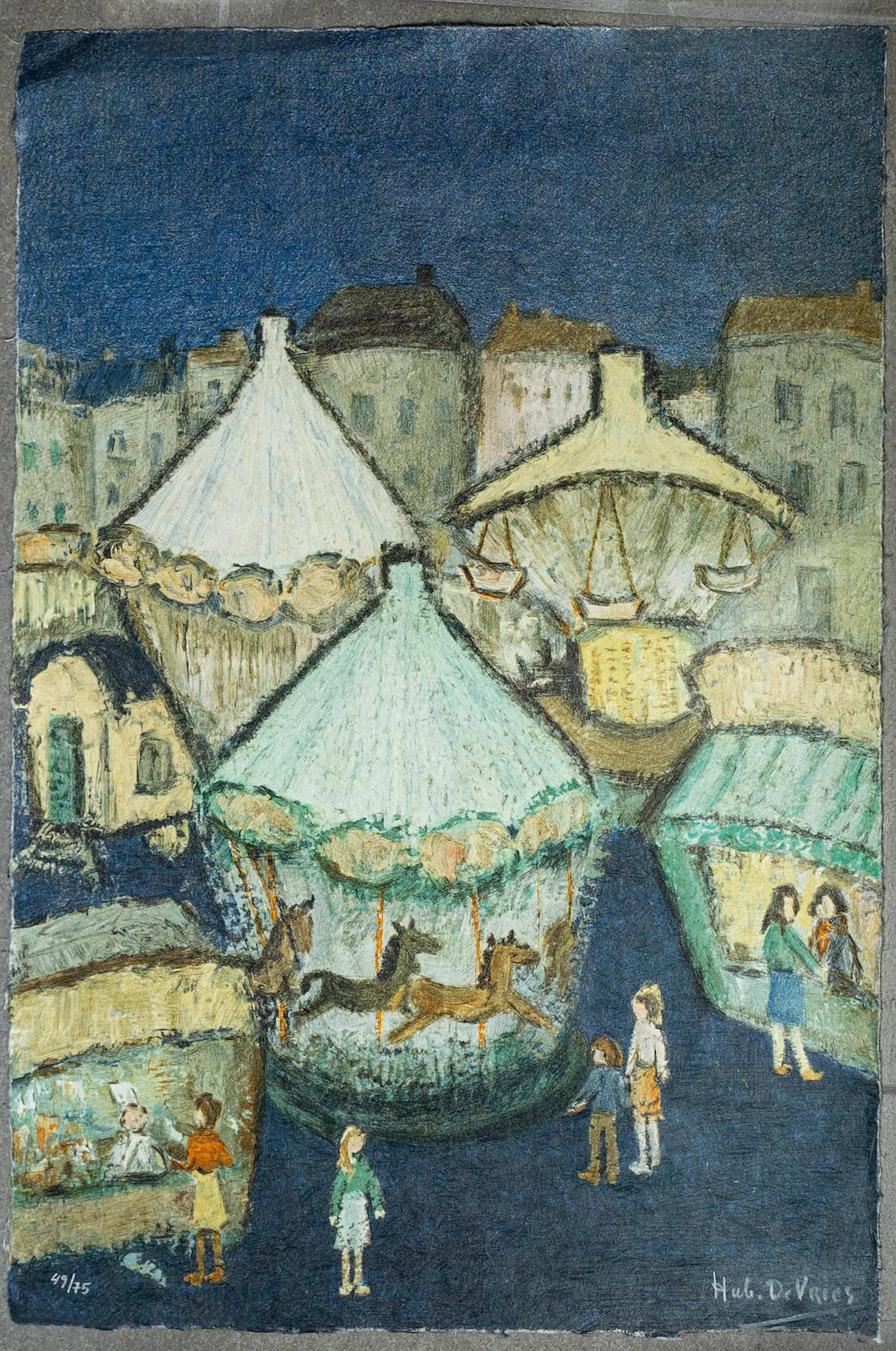 Een prachtig en karakteristiek werk van de bekende Antwerpse kunstenaar Hubert De Vries (1905-1994). Dit werk toont een levendige kermisscène met een draaimolen en diverse figuren, uitgevoerd in de herkenbare, dromerige stijl van de kunstenaar. Het werk is gedrukt op een bijzondere ondergrond, Japans papier of vezelrijk rijstpapier, wat de kleuren een zachte en organische uitstraling geeft. De textuur van het papier is duidelijk zichtbaar en draagt bij aan de artistieke waarde van het stuk.