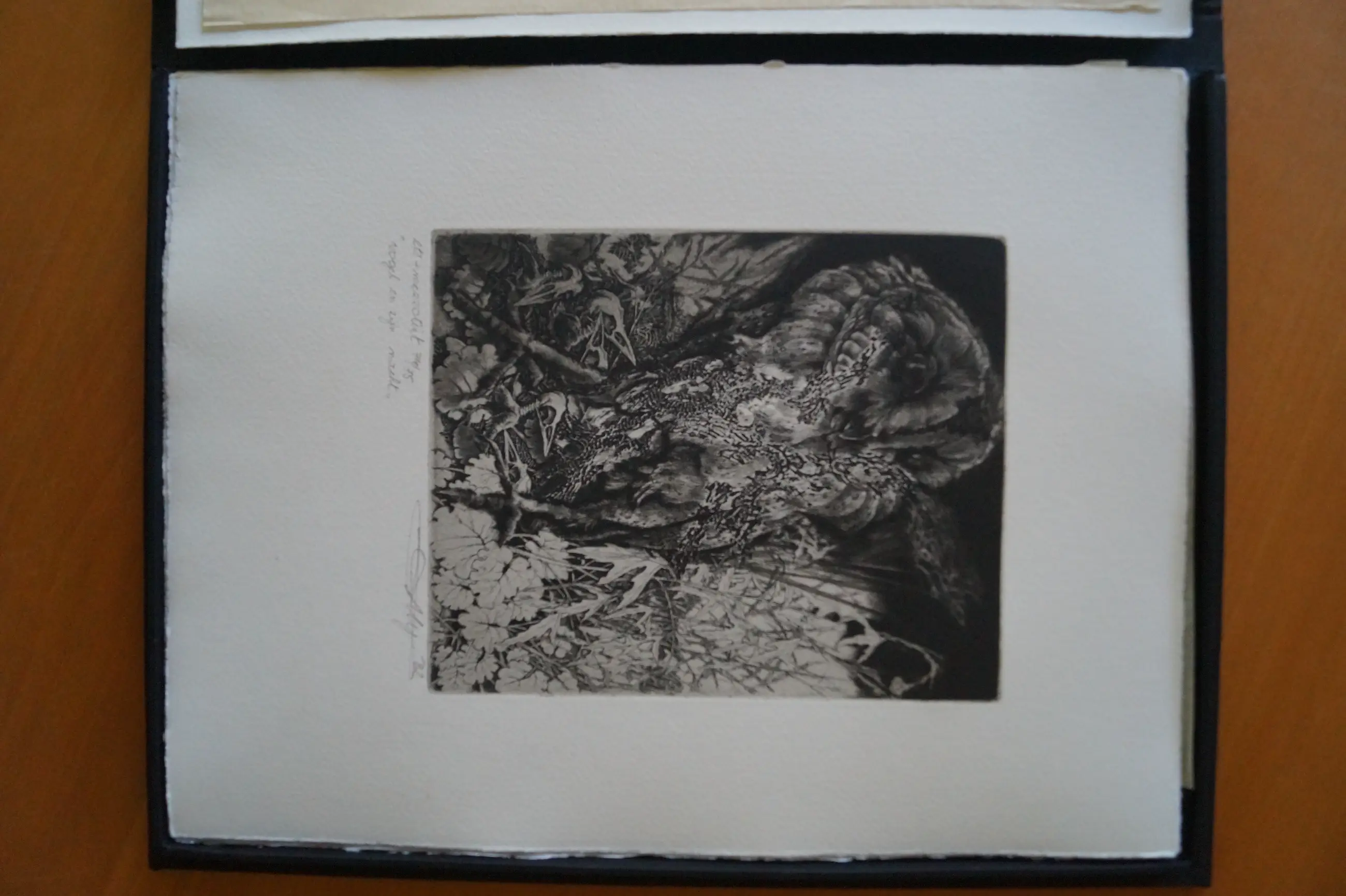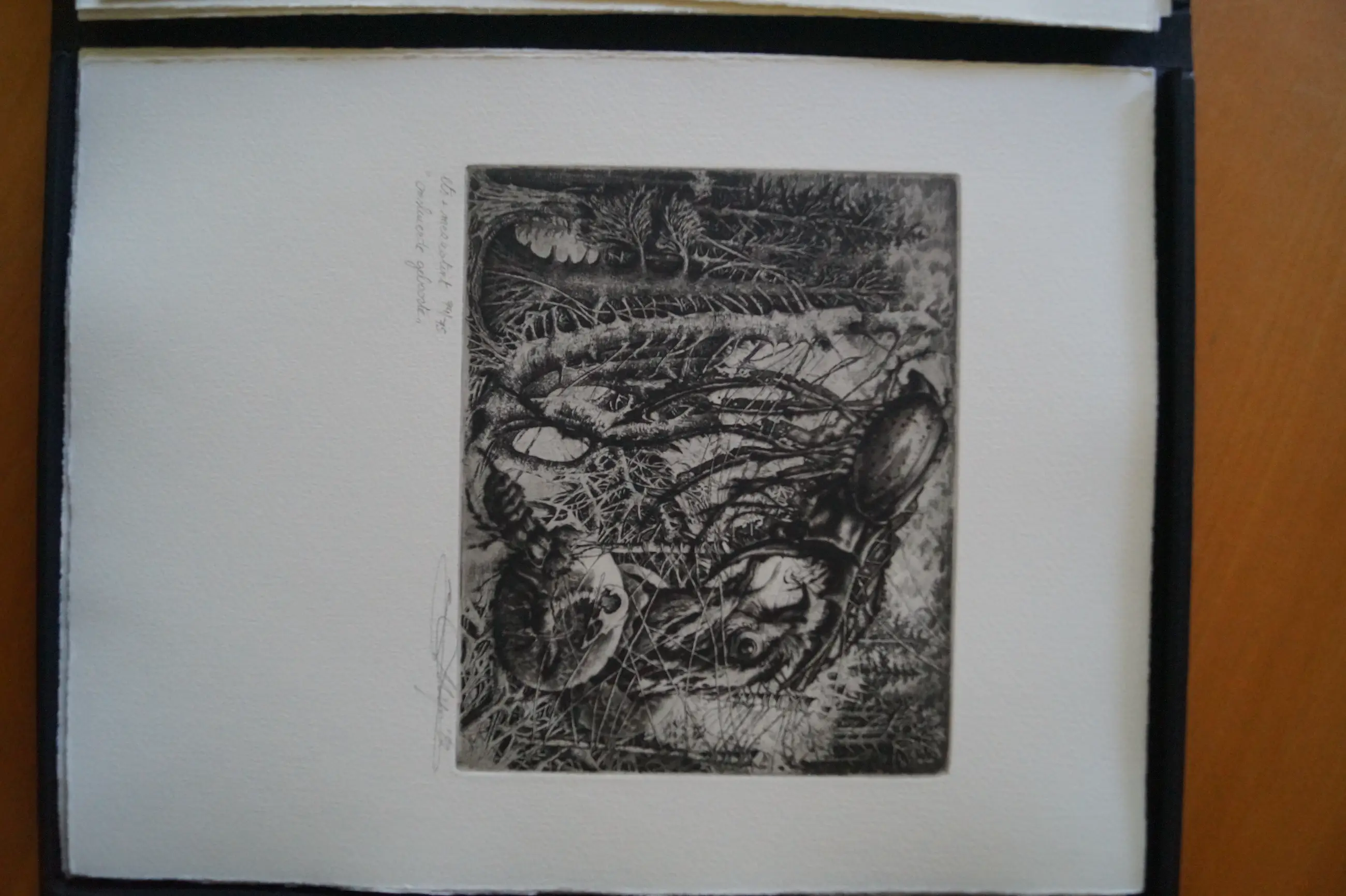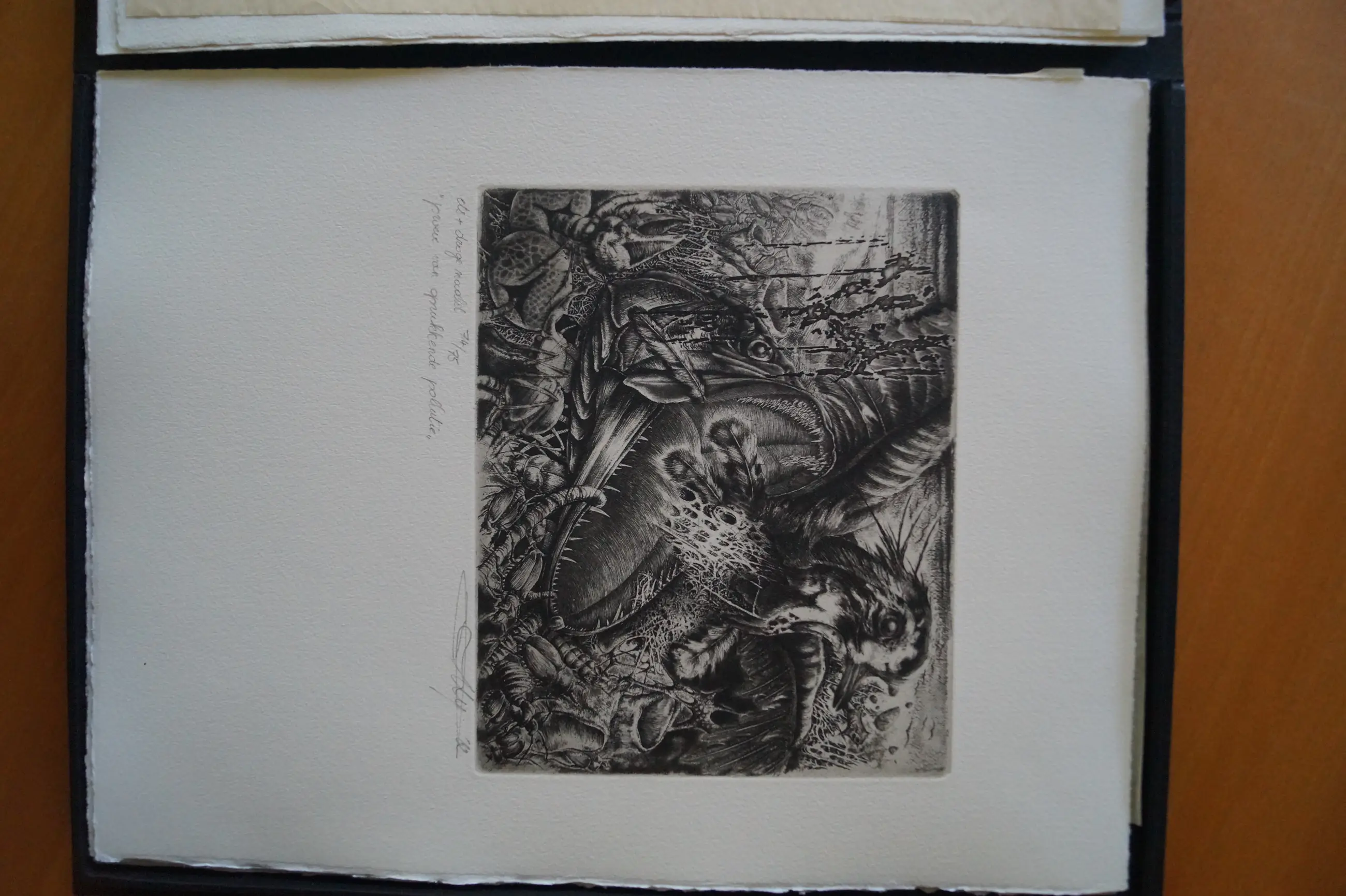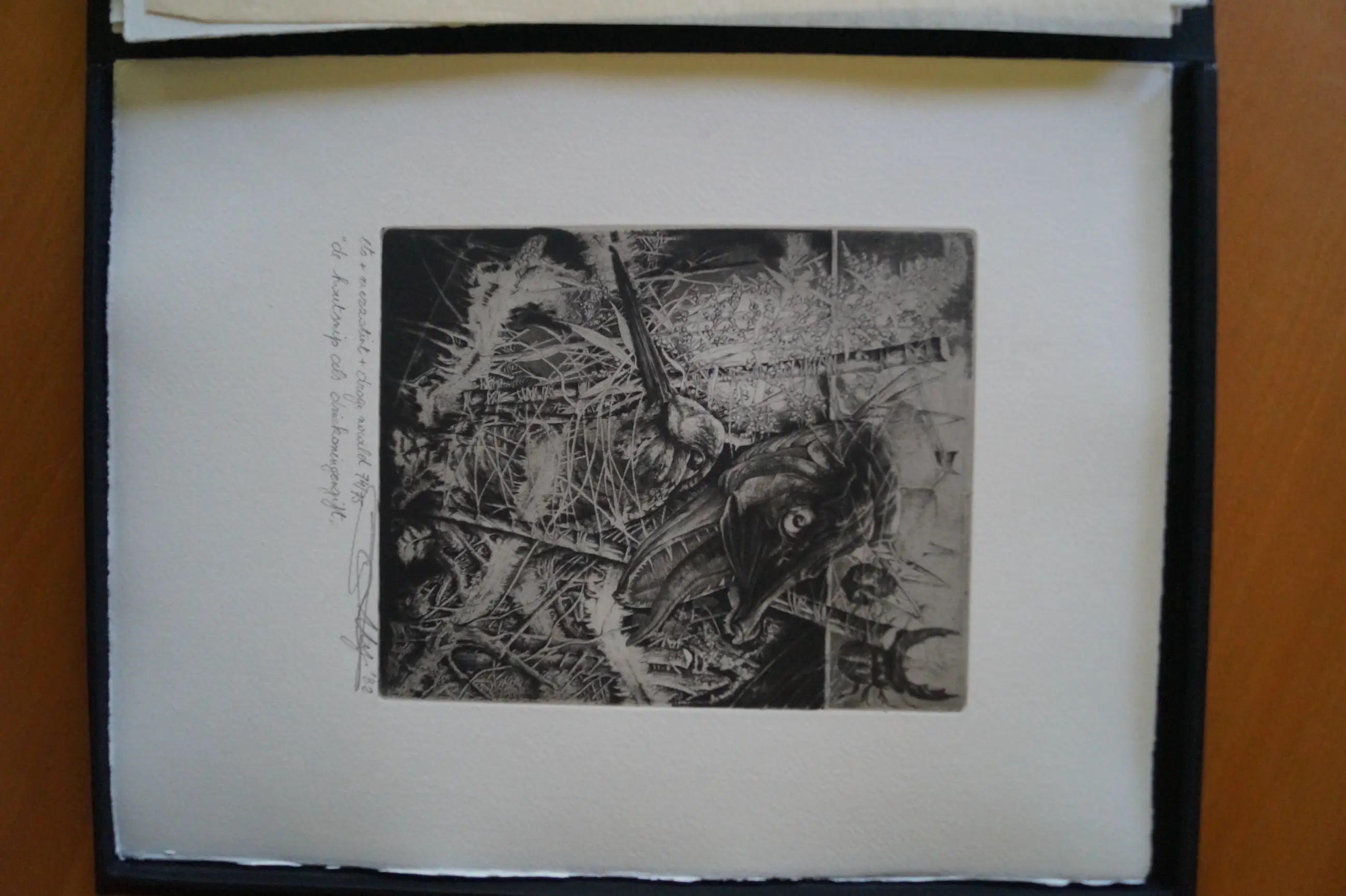 Linnen doos. Met 6 etsen. Oorspronkelijk bevatte de doos 7 etsen. Met los bijgevoegde brochure met tekst van Gilbert Verschooten in het Nederlands, Frans, Duits en Engels – Editie: 100 – dit is nummer 74 – Linnen doos met: Titelblad met kleine ets – Voorwoord door Johan De Muynck [gesigneerd] – Opdracht – Verantwoording + 6 etsen: 2 – Generiek – 3 – Omsluierde geboorte – 4 – De houtsnip als Driekoningengift – 5 – Proeve van oprukkende pollutie – 6 – Vogel en zijn nacht – 7 – Museum van leven en dood.