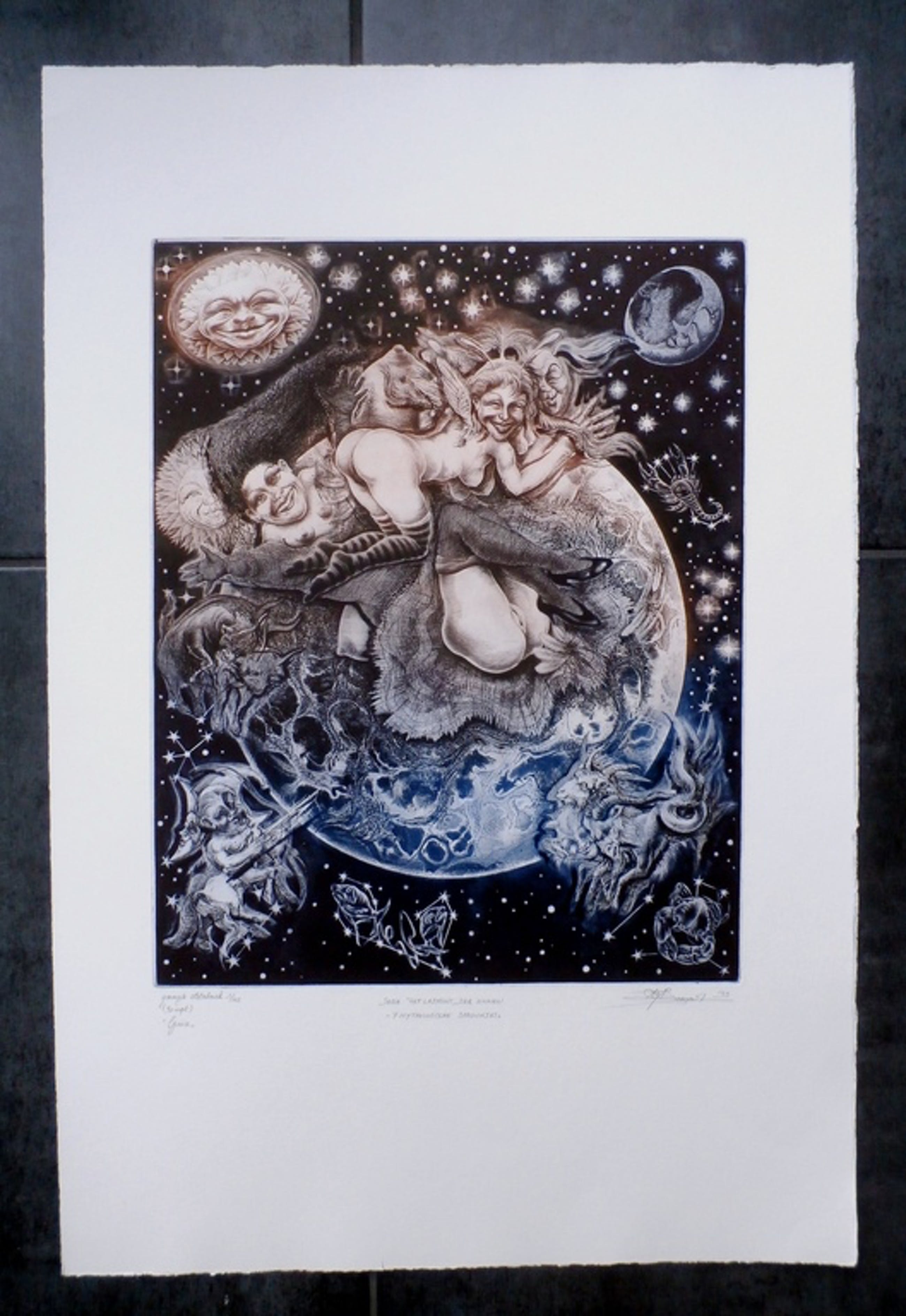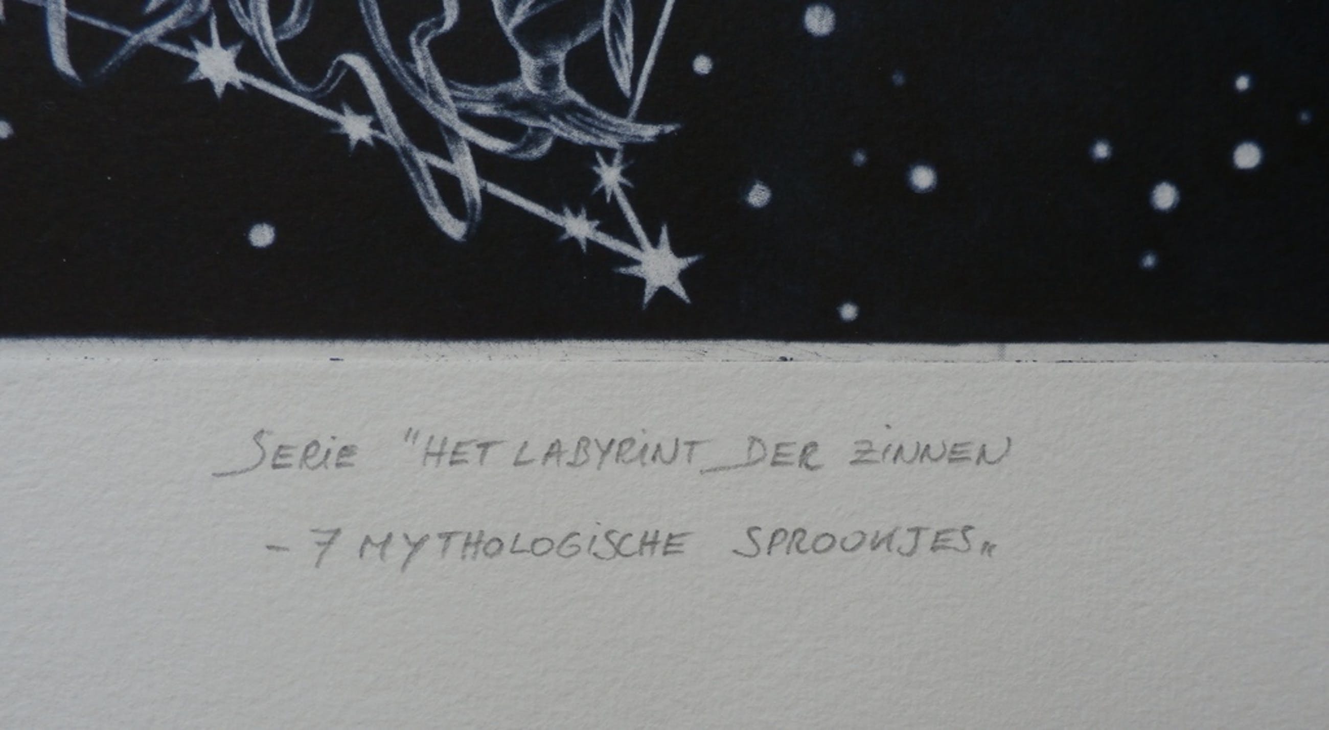 Ets van Hugo Besard uit 1993. Gemengde ets techniek. Nummer 3/45. Titel: "Gaia". Serie: Het labyrint der zinnen - 7 mythologische sprookjes. Rechtsonder gesigneerd door de kunstenaar. Afmetingen blad: H79 x b43 cm. Afmetingen voorstelling H49 x b39. De authenciteit van dit werk wordt volledig gegarandeerd. Een certificaat van echtheid kan, op verzoek, worden meegeleverd. Conditie: in goede staat.