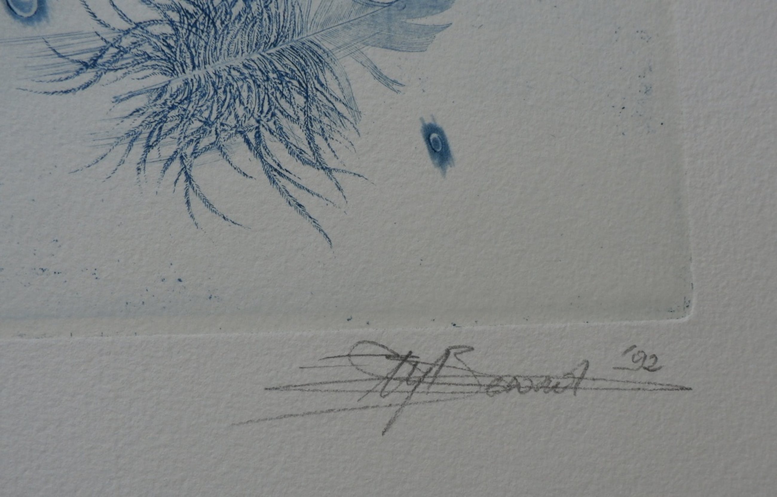 Ets van Hugo Besard uit 1992. Gemengde ets techniek. Nummer 3/45. Titel: "Thisbe". Serie: Het labyrint der zinnen - 7 mythologische sprookjes. Rechtsonder gesigneerd door de kunstenaar. Afmetingen blad: H79 x b43 cm. Afmetingen voorstelling H49.5 x b38 De authenciteit van dit werk wordt volledig gegarandeerd. Een certificaat van echtheid kan, op verzoek, worden meegeleverd. Conditie: in goede staat