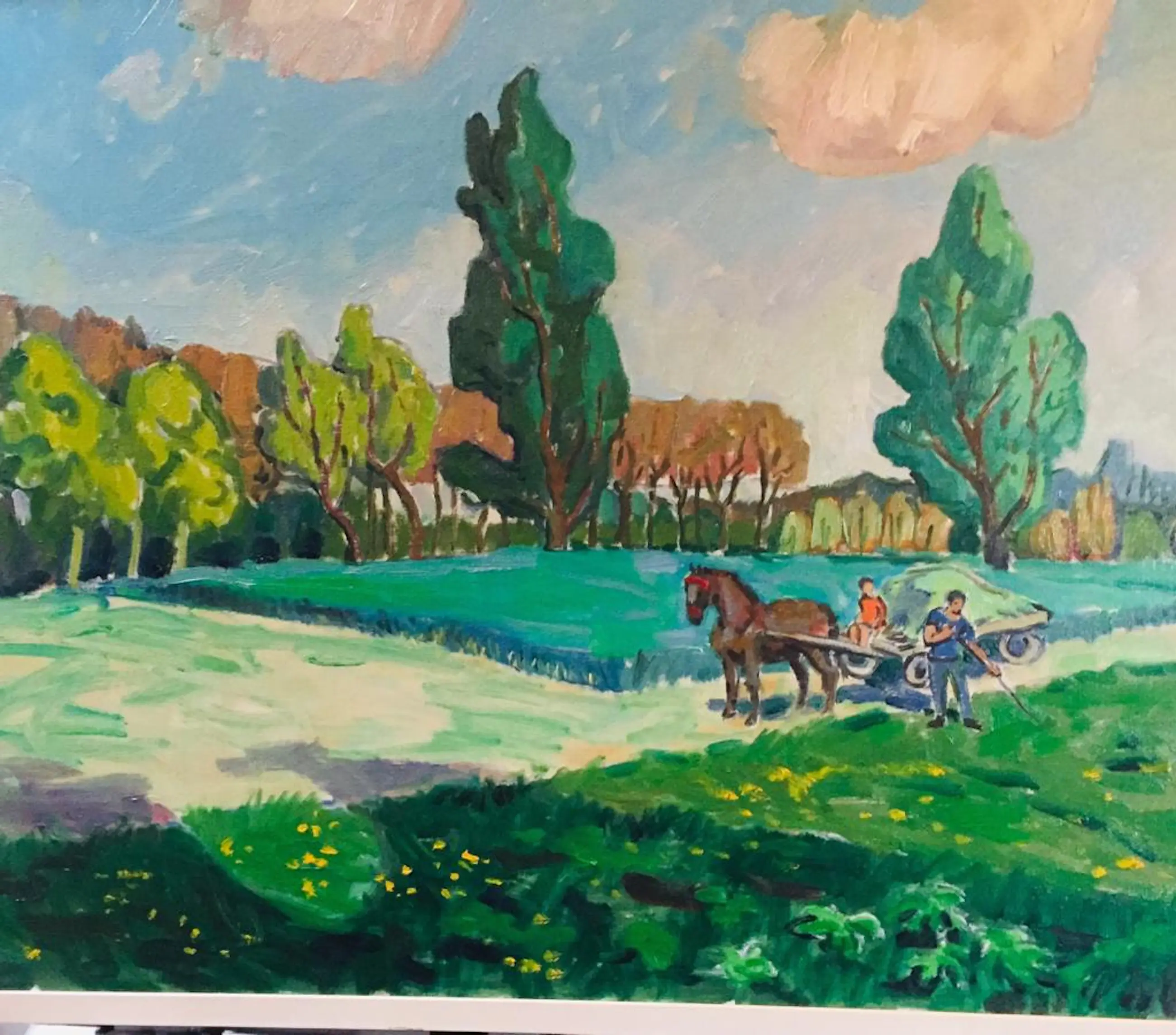 Boer met paard en wagen op het land aan het werk. Kind kijkt toe.