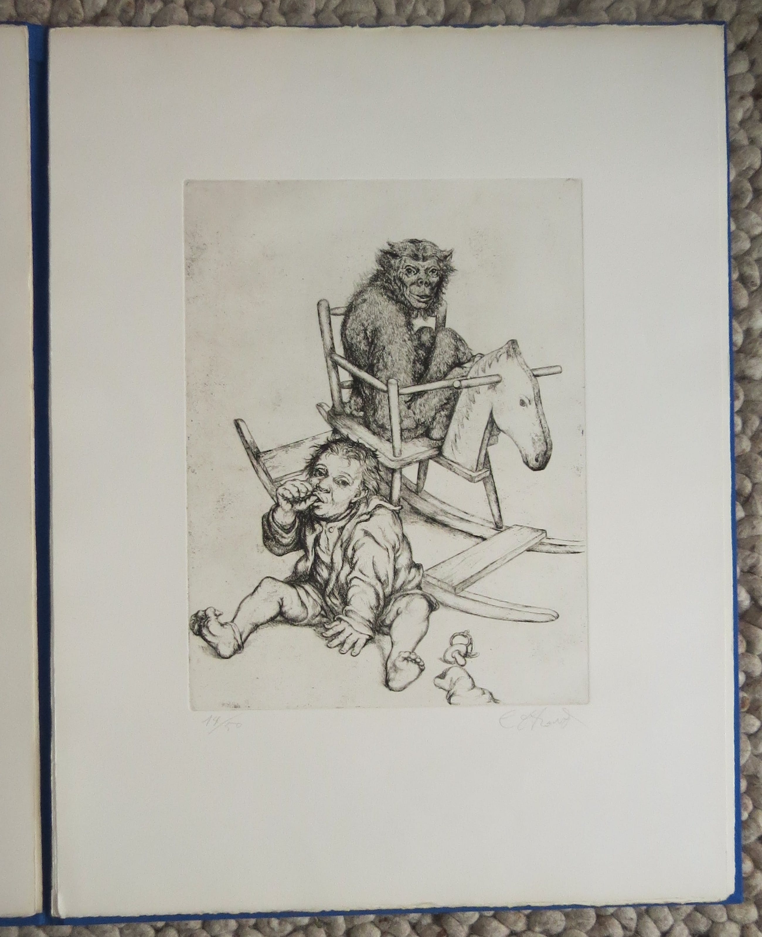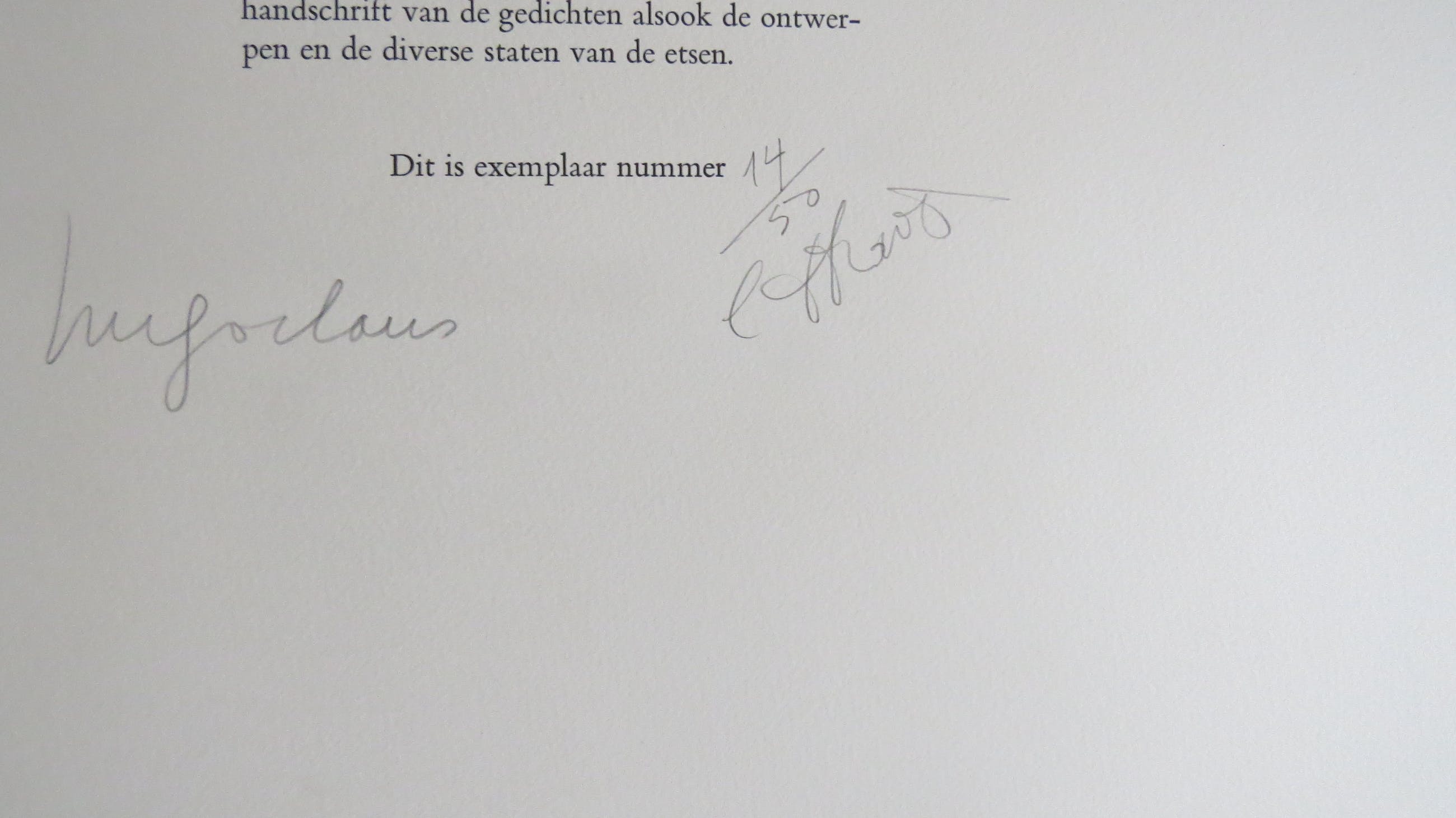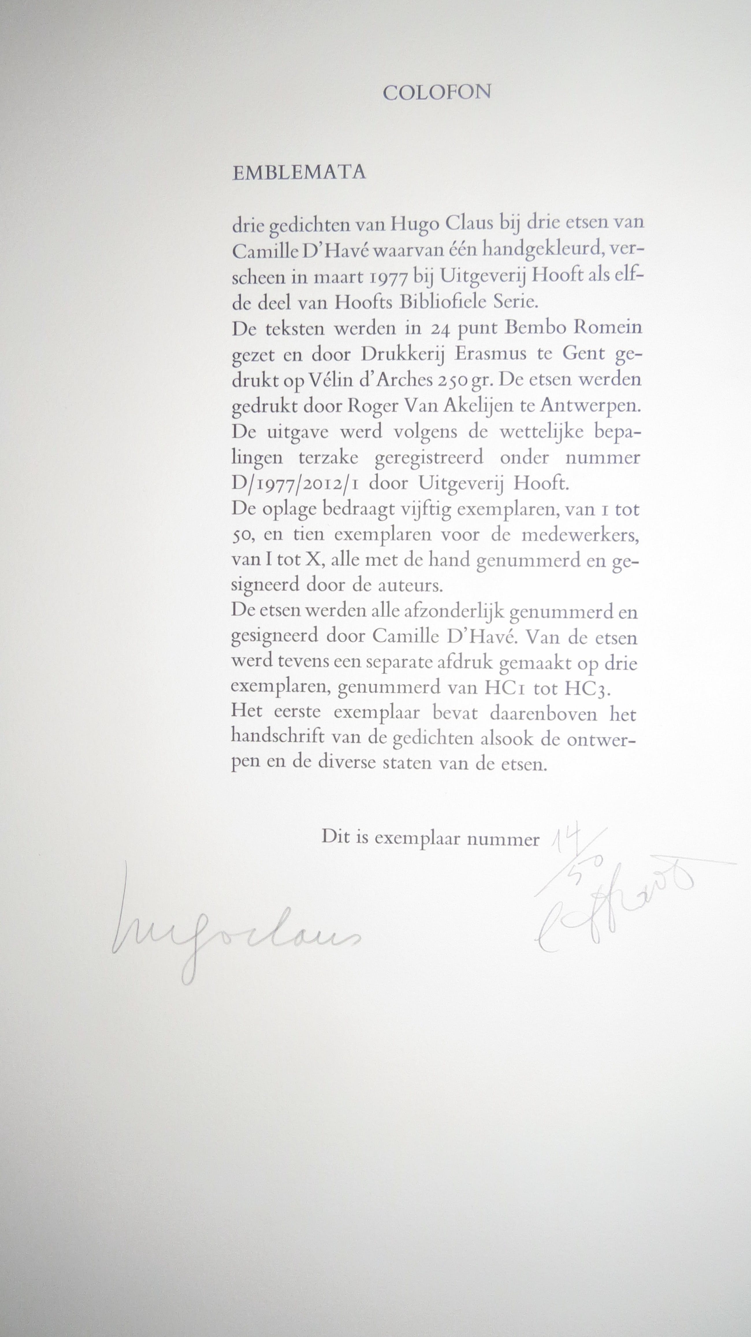 Drie nieuwe gedichten van Hugo Claus bij (drie) originele etsen van Camille D’Havé. Opgelet: de eigenhandig ingekleurde ets ontbreekt uit de set. De complete originele set bevat drie etsen, de actuele set bevat 2 ipv 3 etsen.