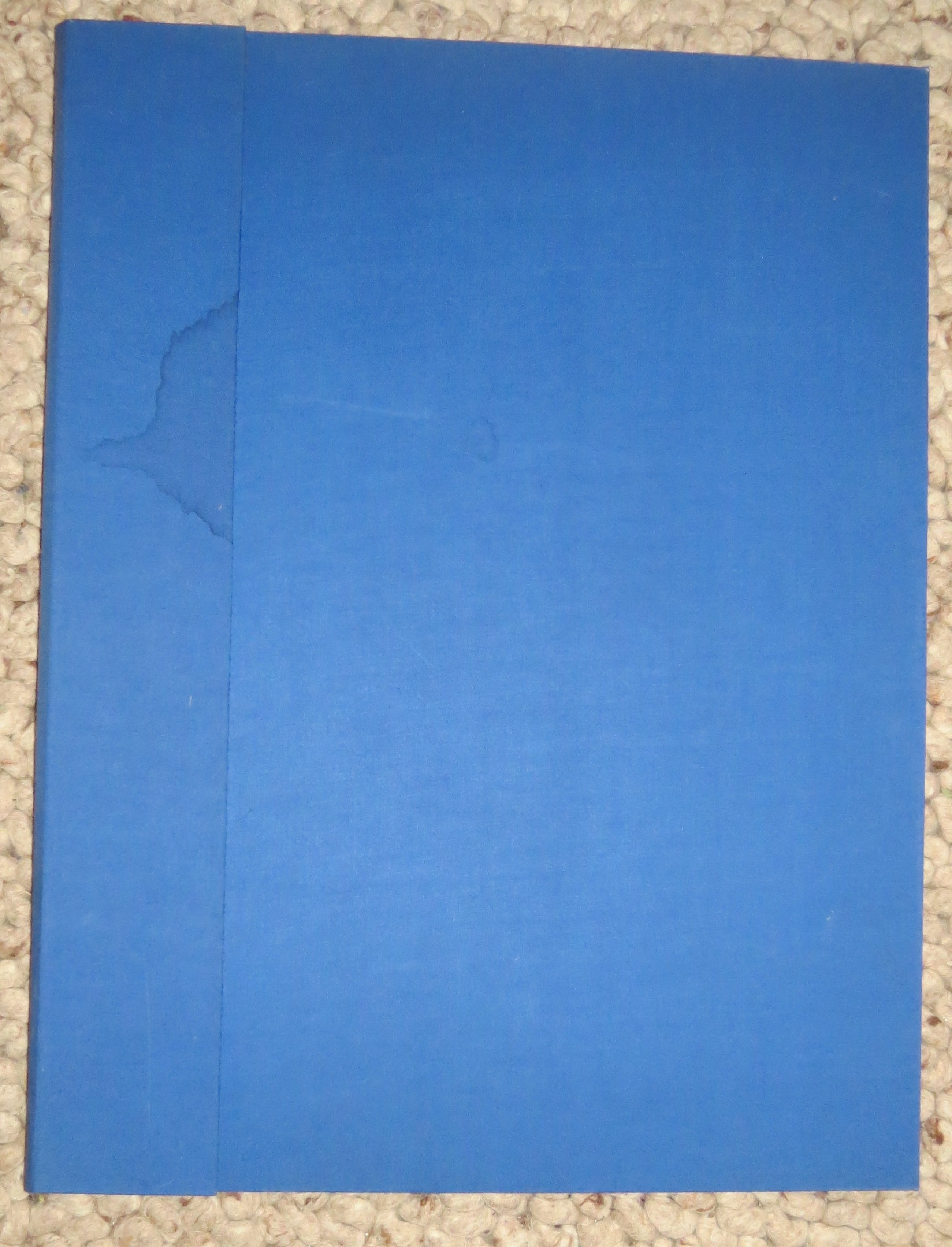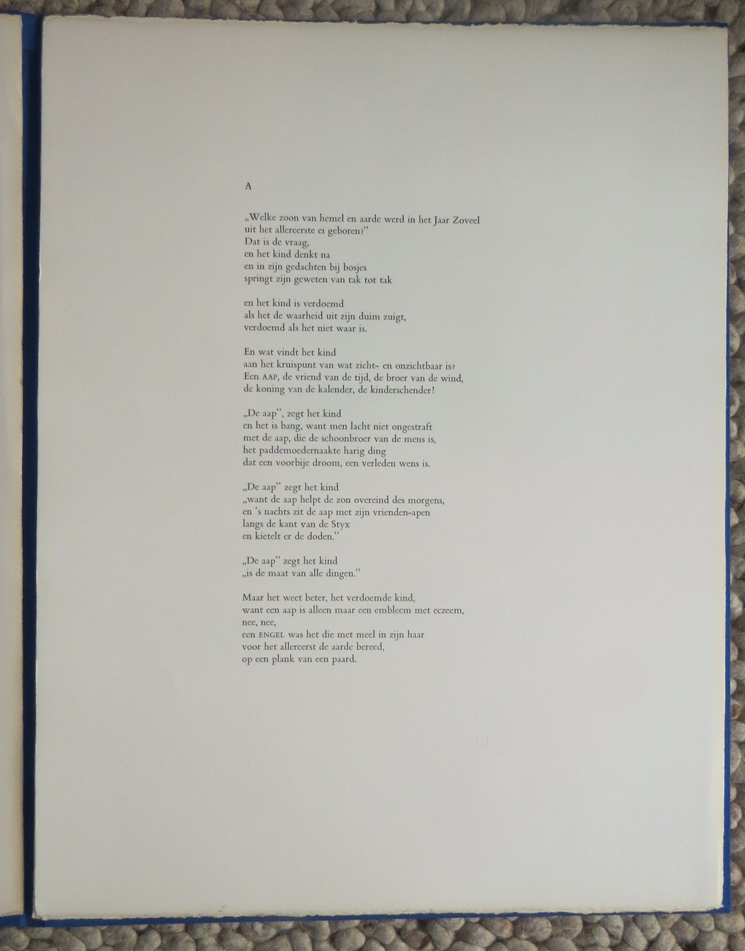 Acht (zeven) eenzijdig bedrukte bladen in linnen map. Handgeschept papier niet afgesneden. Gezet in 24 punt Romein Bembo en gedrukt door Erasmus (tekst) en Roger Van Akelijen (etsen) op Vélin d’Arches 250 gr. in een oplage van 50 exemplaren. Geïllustreerd.
