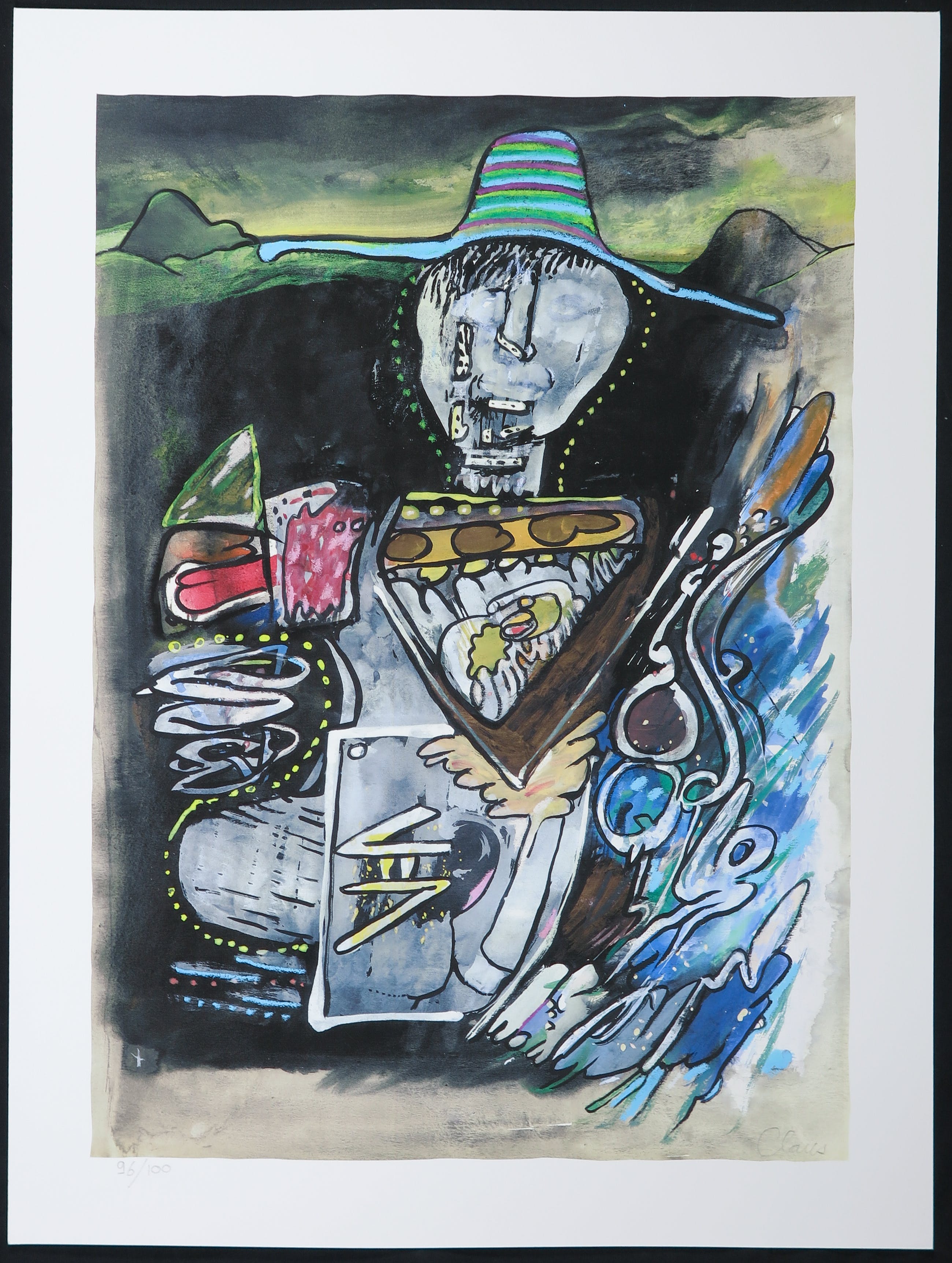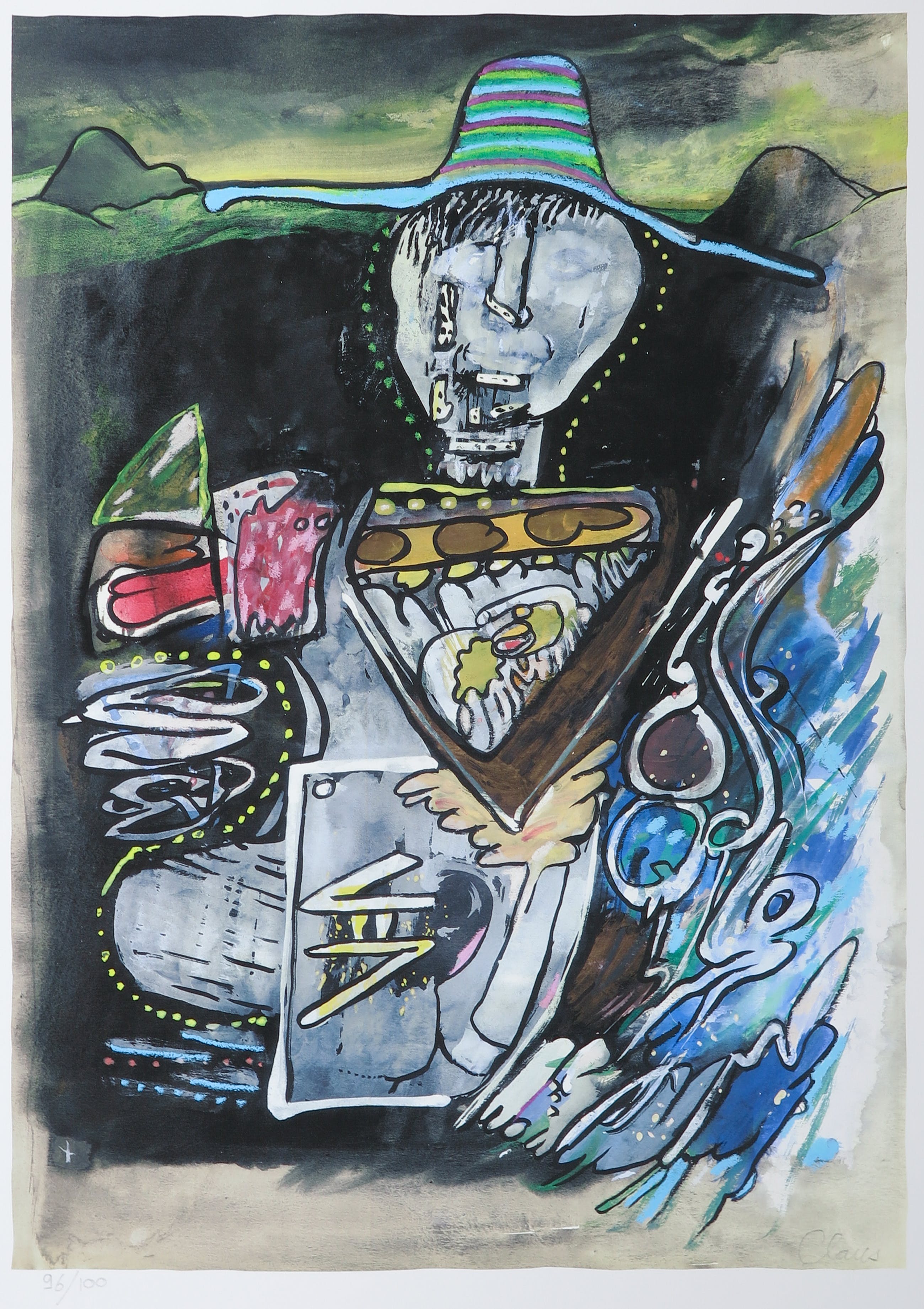 Ludieke litho van de Vlaamse auteur en kunstenaar Hugo Claus. Claus trok veel op met de leden van de CoBrA-beweging, wat resulteert in deze bijzondere stijl.