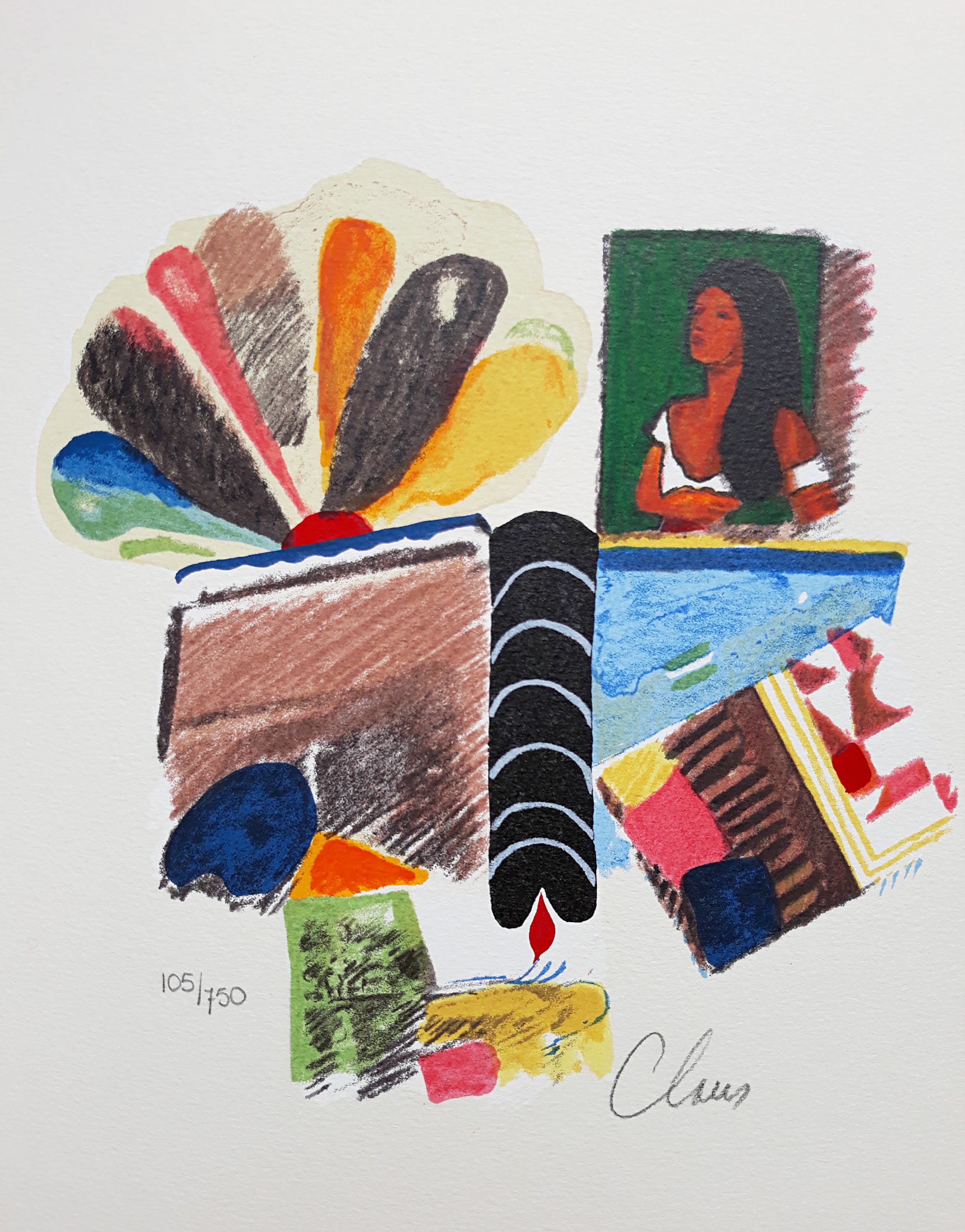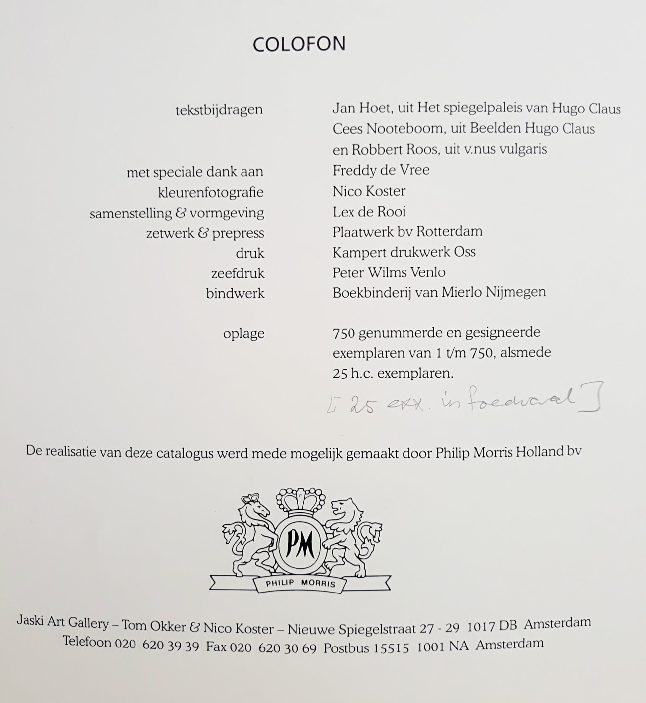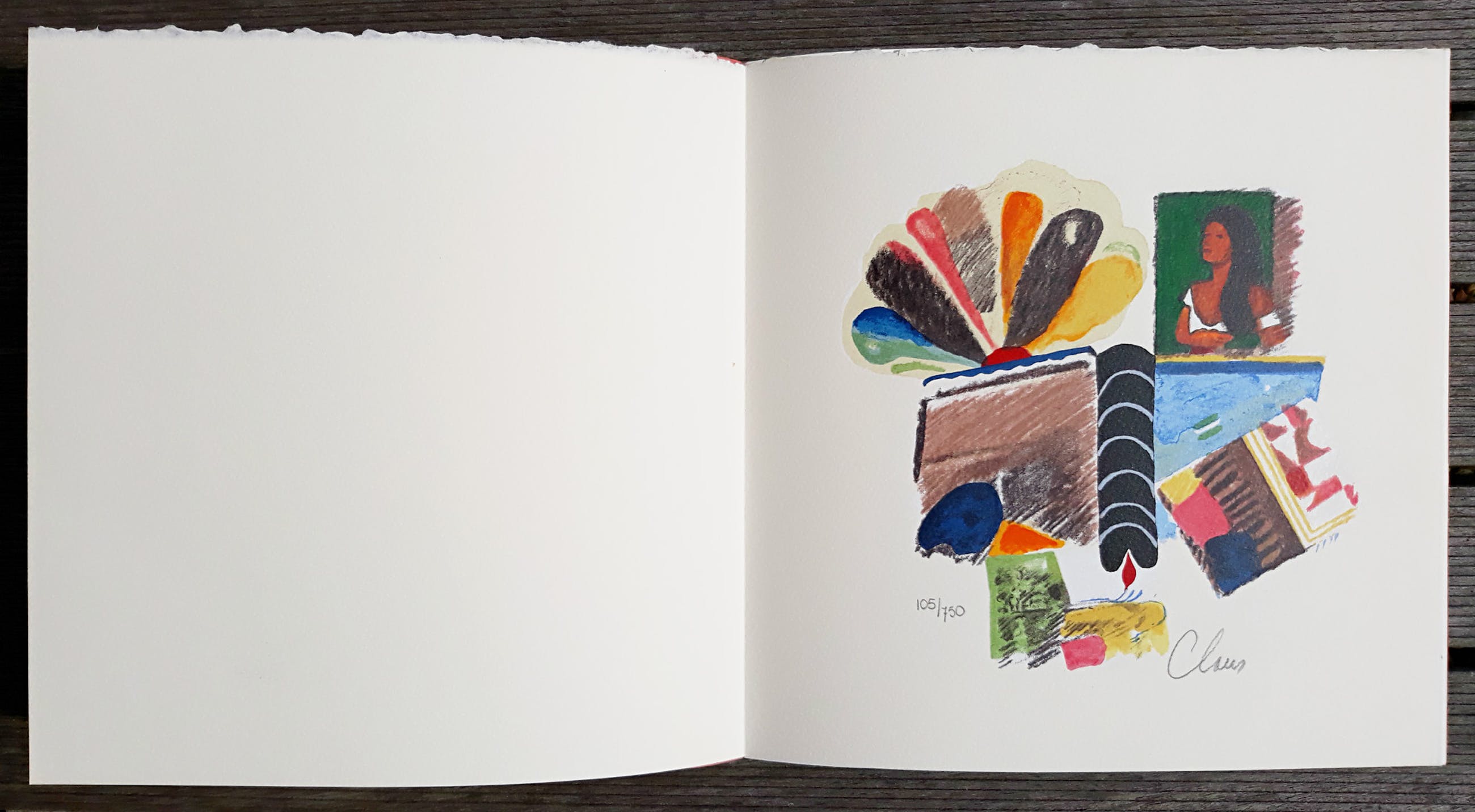 Complete uitgave van Jaski Art Gallery met een door Claus gesigneerde en genummerde zeefdruk. De uitgave bevat reproducties van werk van Claus en gesprekken van Robbert Roos en Cees Nooteboom met Claus en een beschouwing over hem door Jan Hoet (zie ook Colofon). De oplage bedroeg 750 exemplaren, dit is nummer 105. Alles in zeer goede conditie, alleen de omslag is wat verkleurd. De uitneembare zeefdruk is in mint conditie.