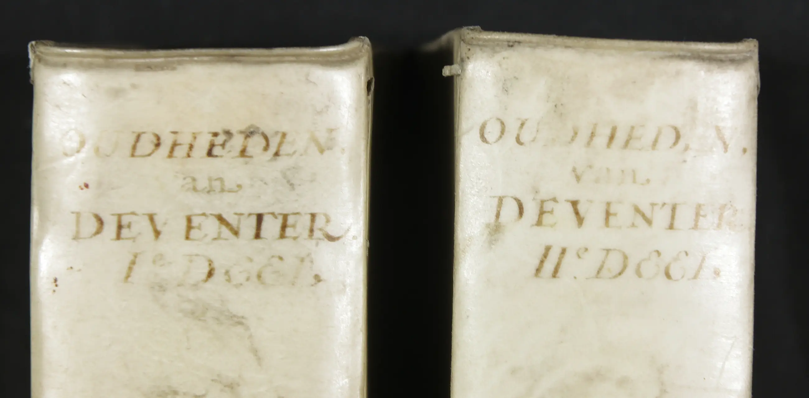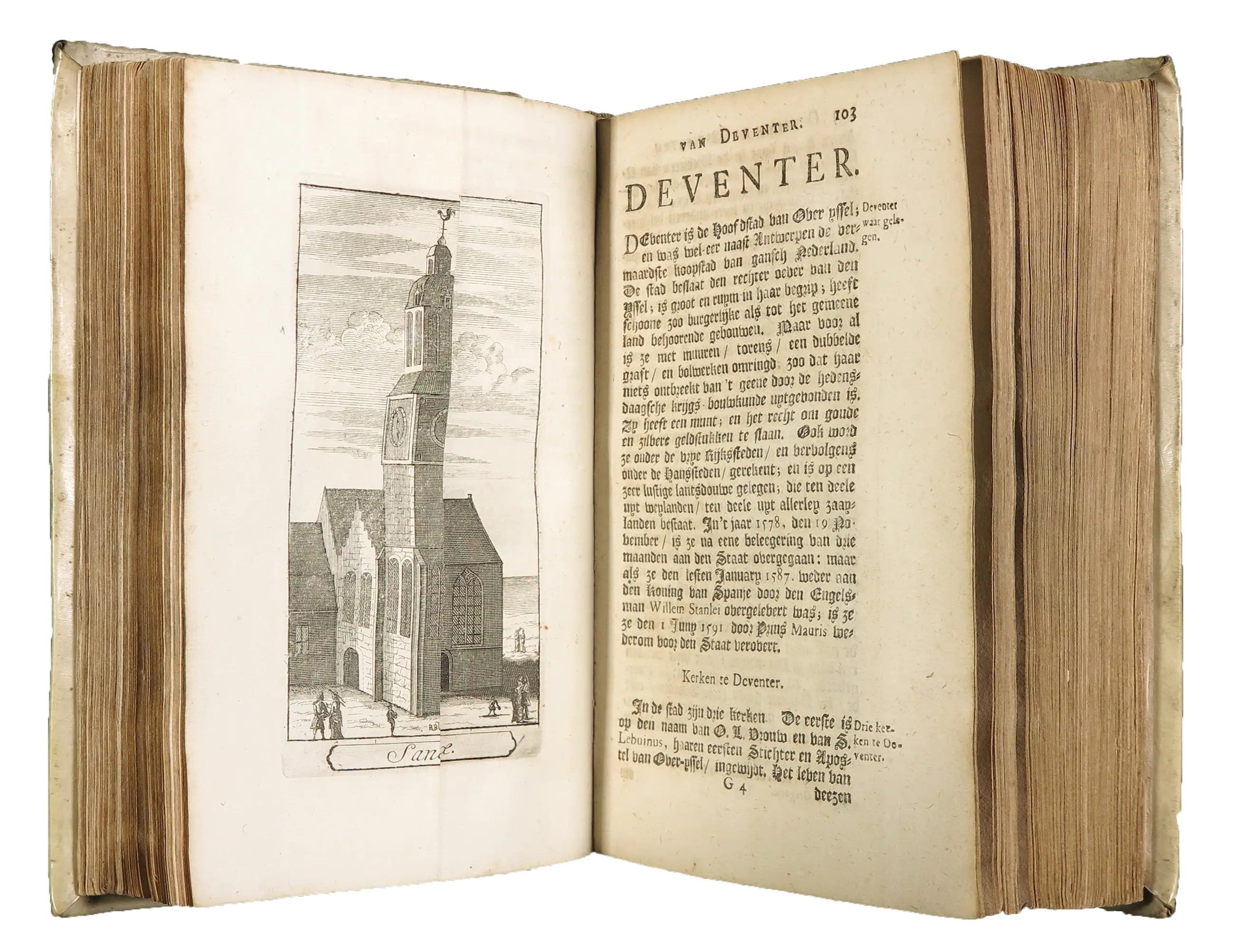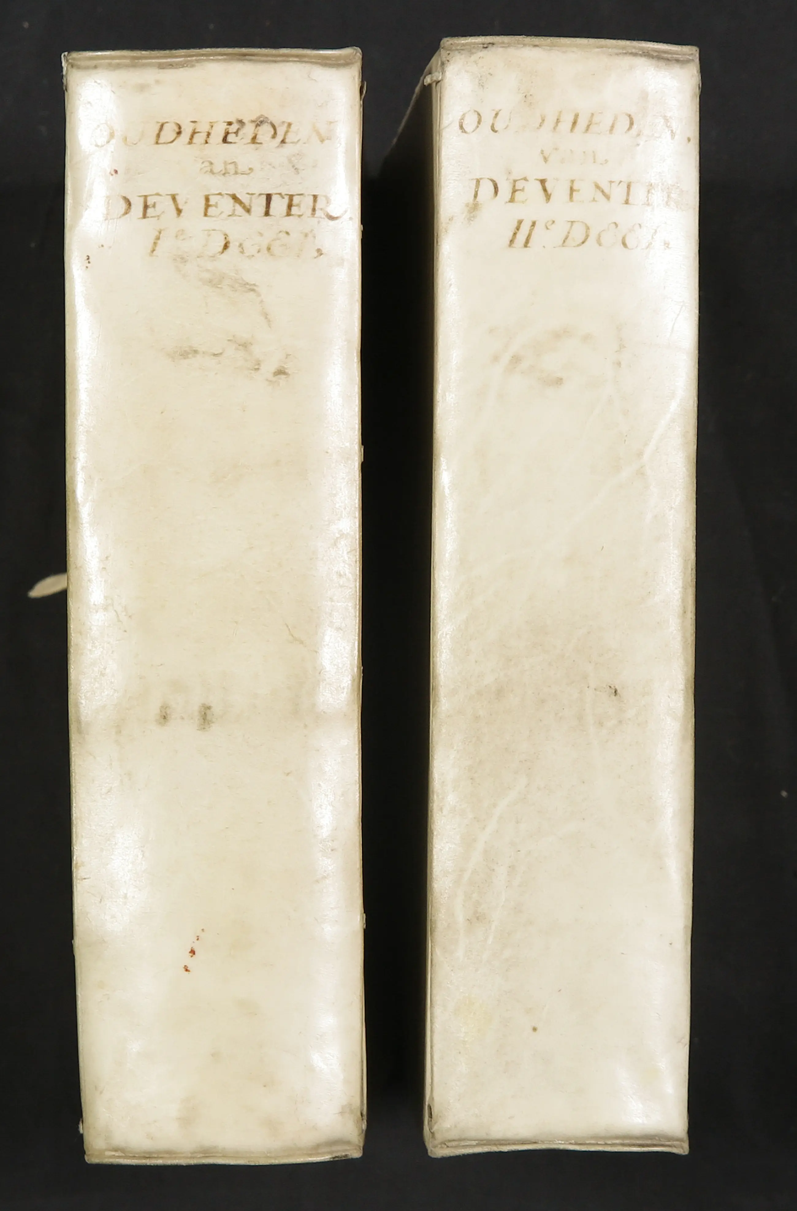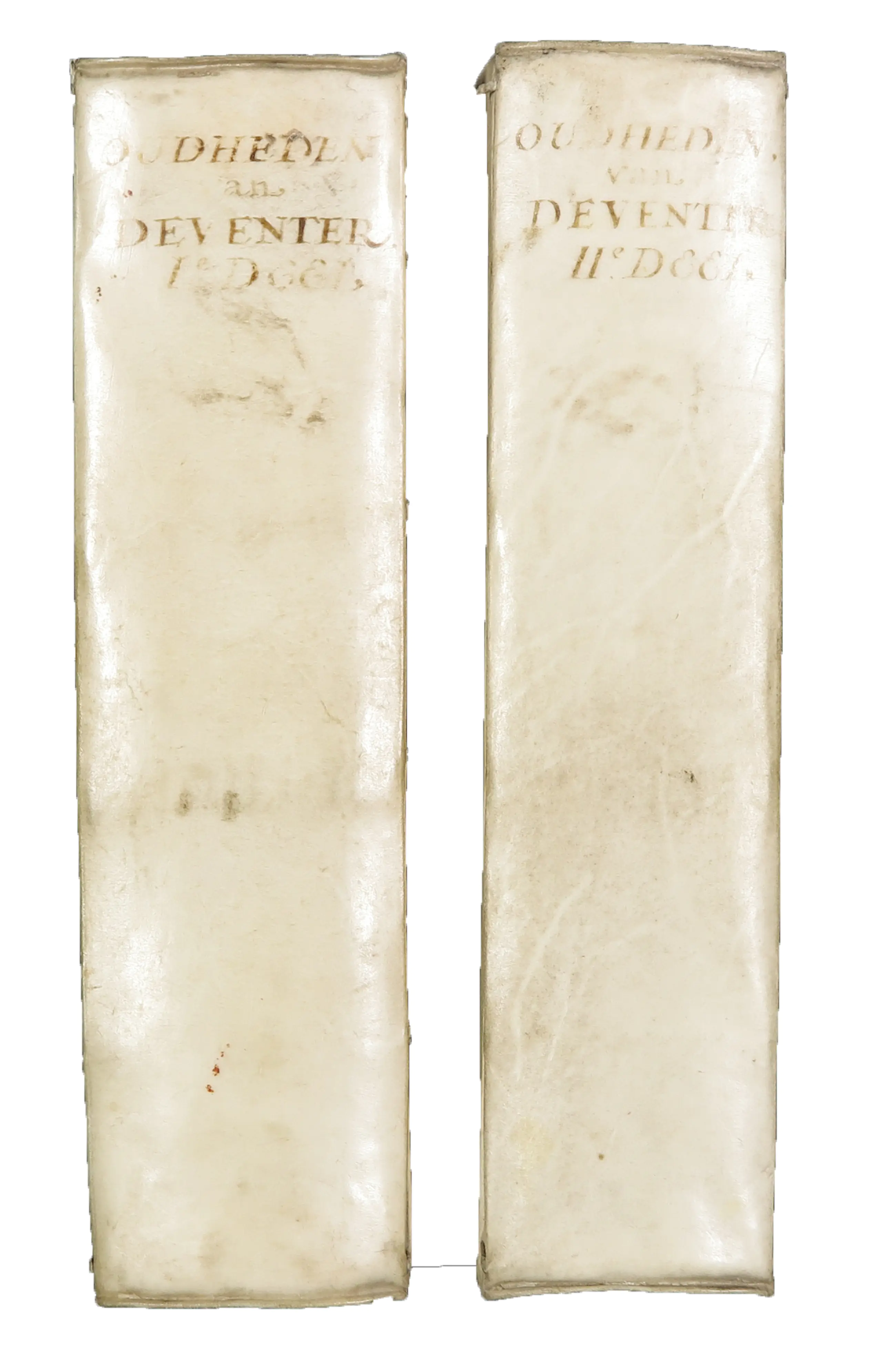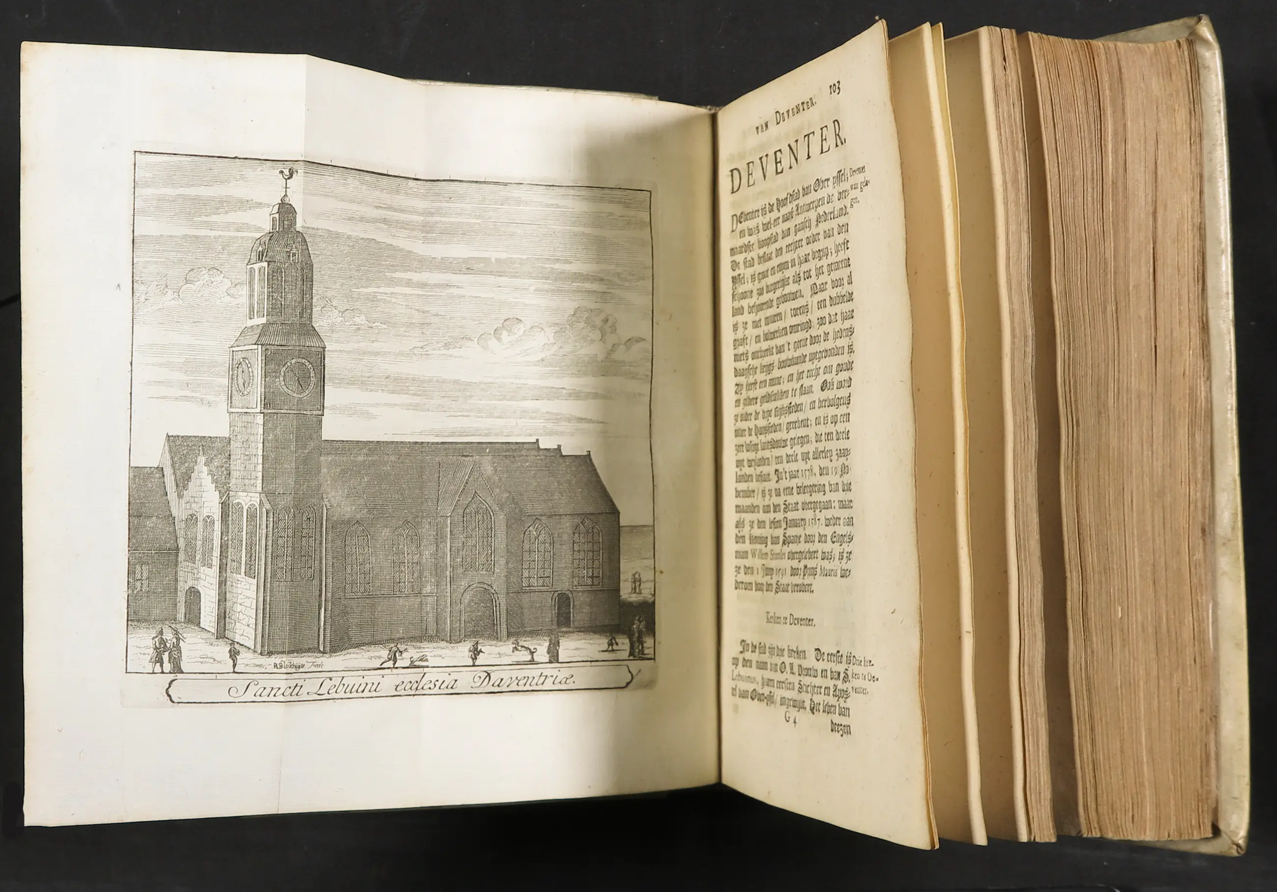 Deel I en II van Oudheden en Gestichten van het Bisdom van Deventer, geschreven door Hugo Franciscus van Heussen en vertaald door Hugo van Rijn. Uitgegeven door S. Luchtmans en D. Haak in 1725 te Leiden.