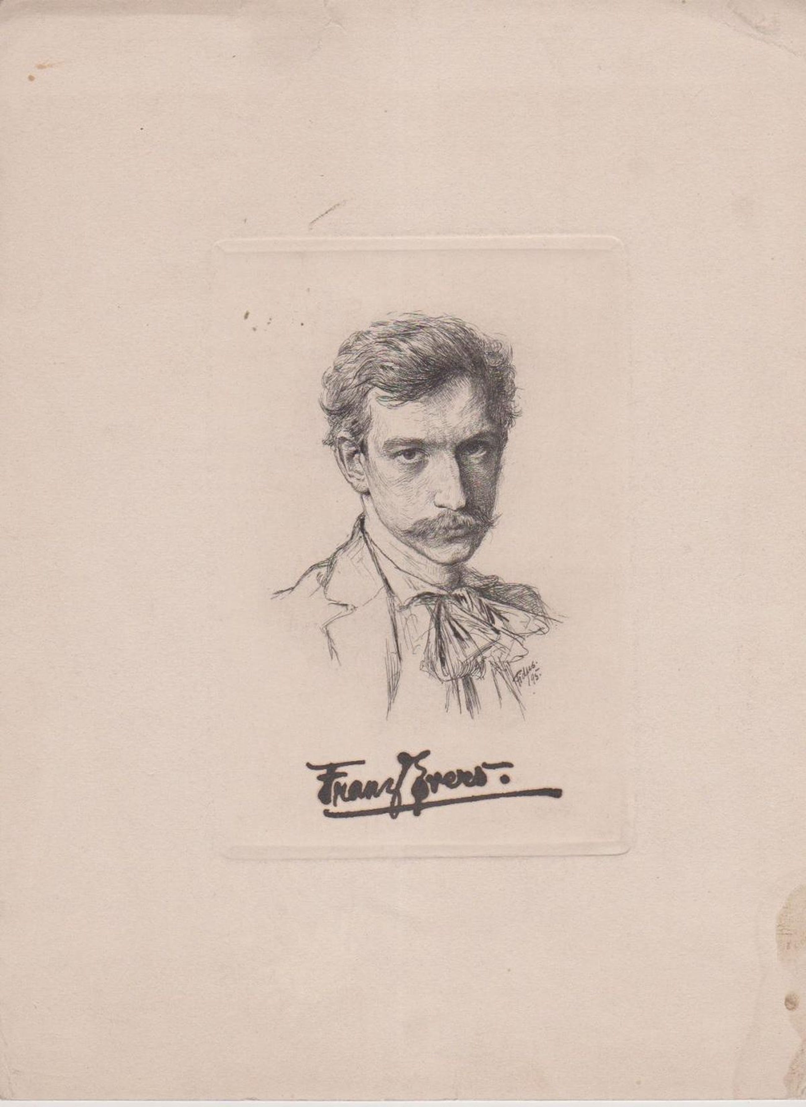 Porträt des Dichters Franz Evers (1871 - 1947) von Fidus - signiert Fidus 1895 - Größe des Blattes: 21 cm x 28 cm - wohl Radierung - Blatt außerhalb des Porträts etwas angeschmutzt (siehe Scan)