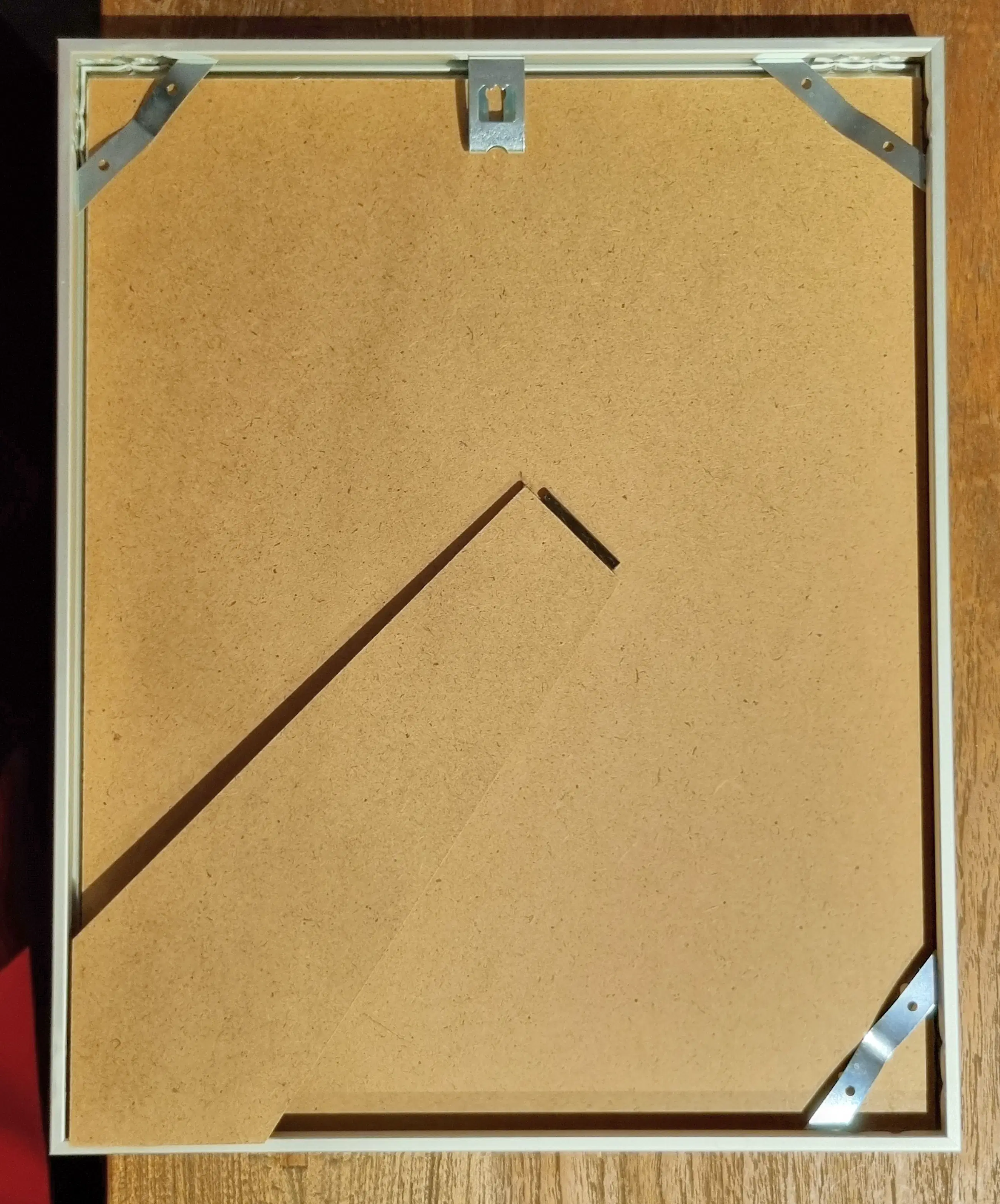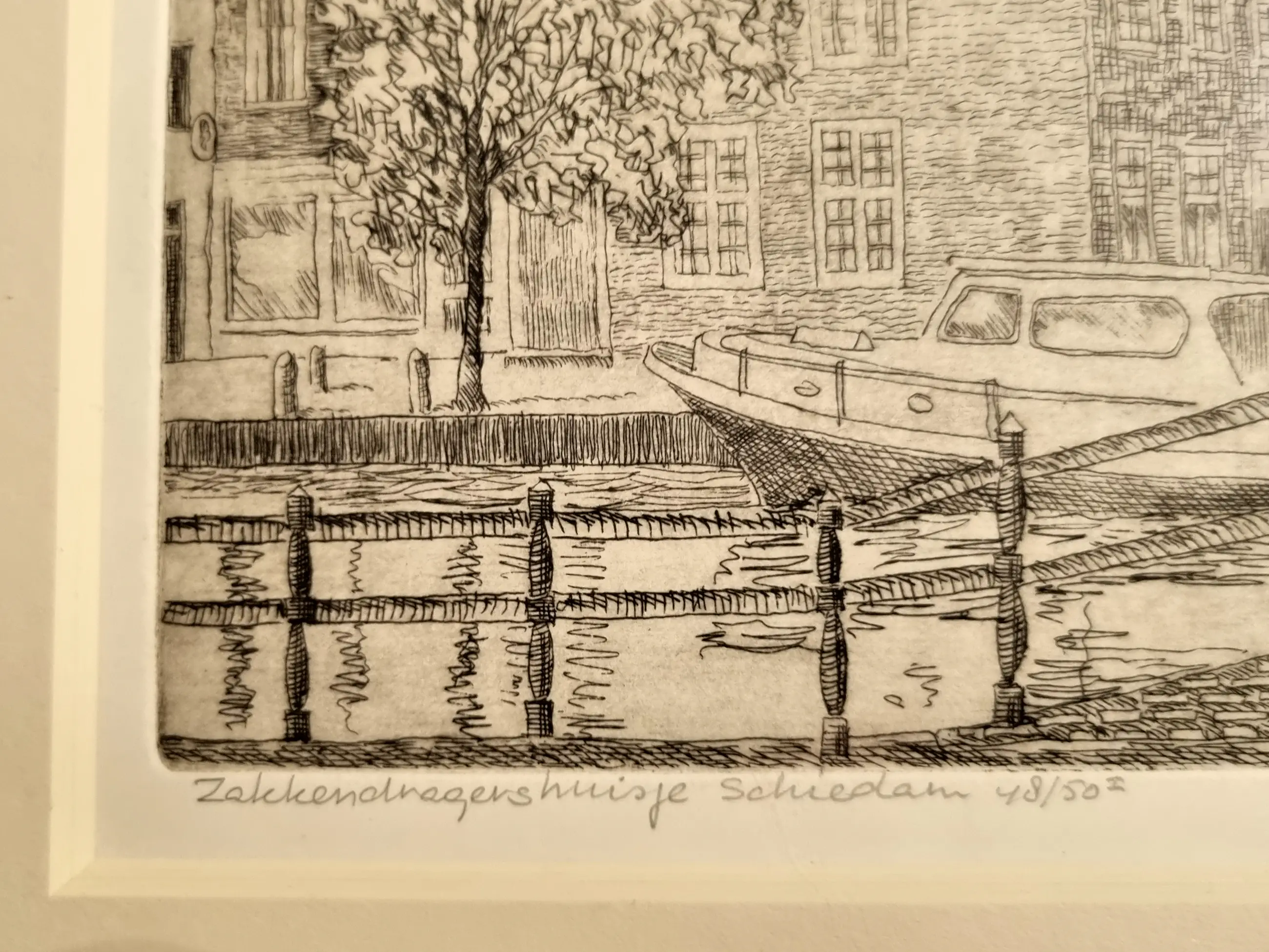 Na verkrijging door Rijnmond Toen is de ets gereinigd en opnieuw ingelijst achter een zuurvrij Artique 3 mm passe partout in een aluminium lijstje.