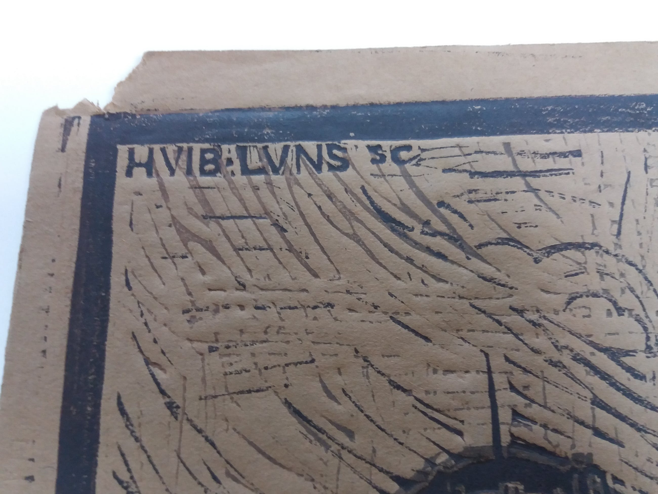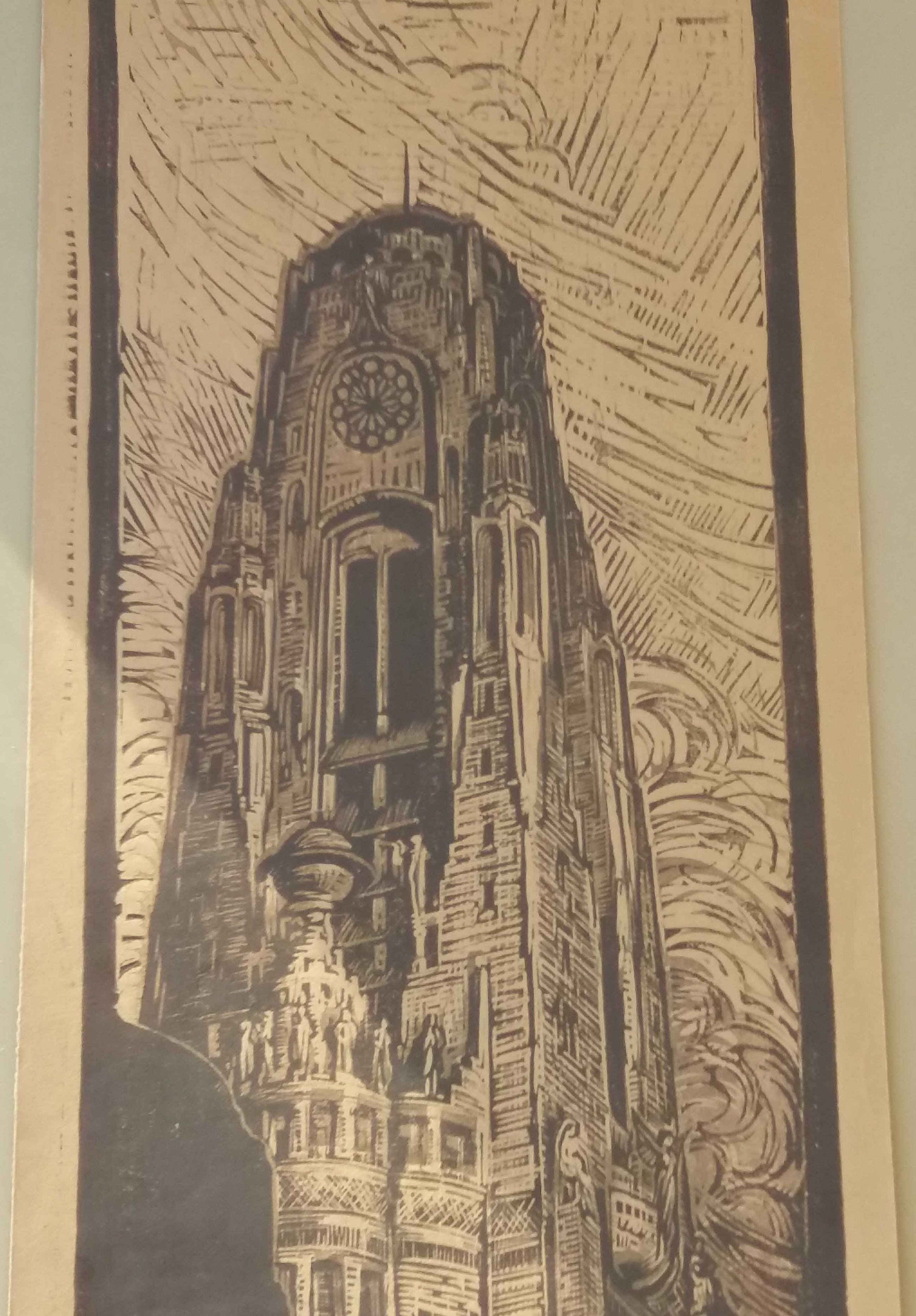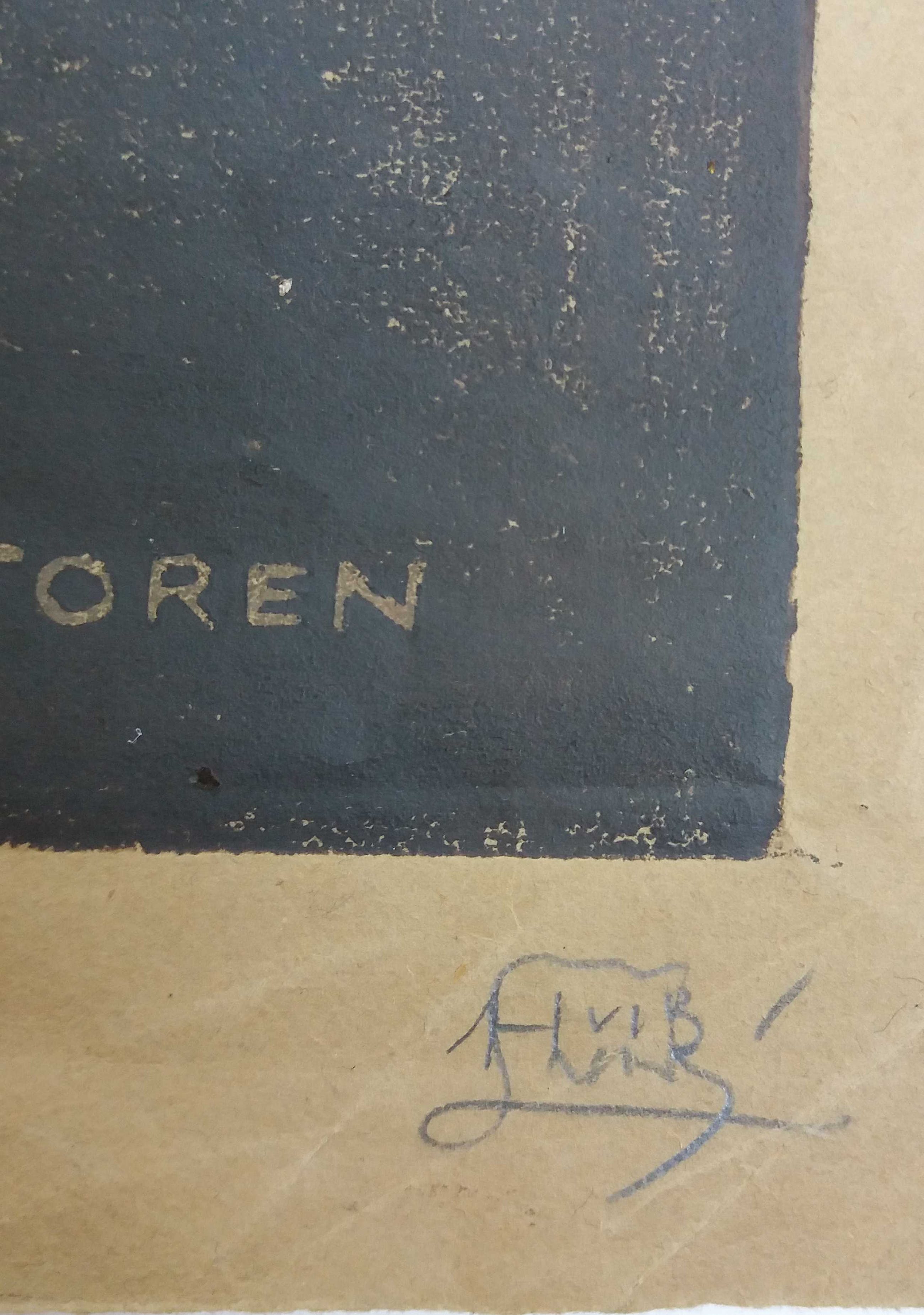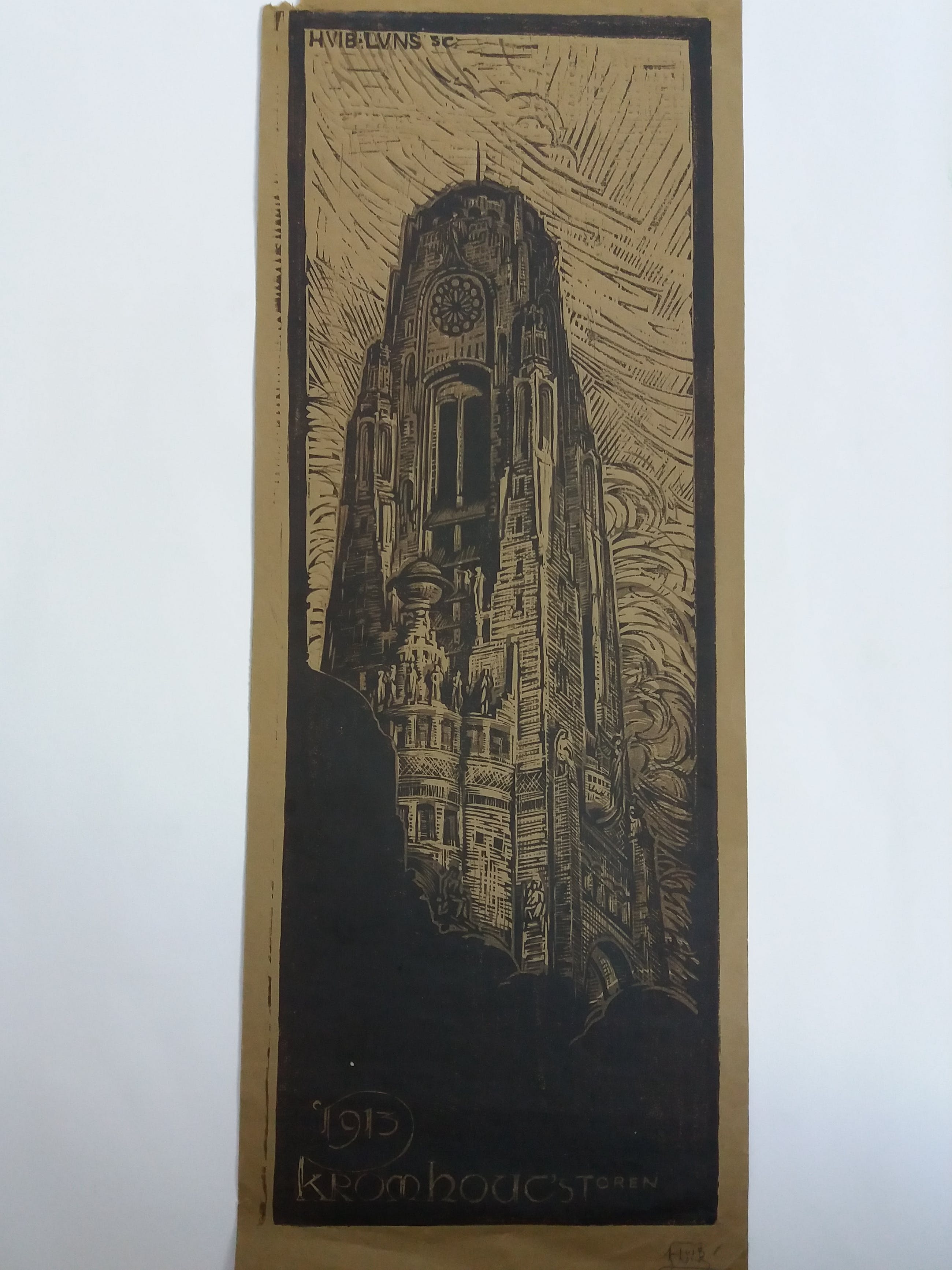 Met potlood rechtsonder gesigneerd en de naam Huib Luns is in de lino meegedrukt (linksboven). De titel Kromhout's toren is gebaseerd op een prijsvraag ontwerp van de architect Willem Kromhout voor het Raadhuis in Rotterdam. Het ontwerp is niet uitgevoerd. Er bestaat wel een maquette van het ontwerp (zie laatste foto)