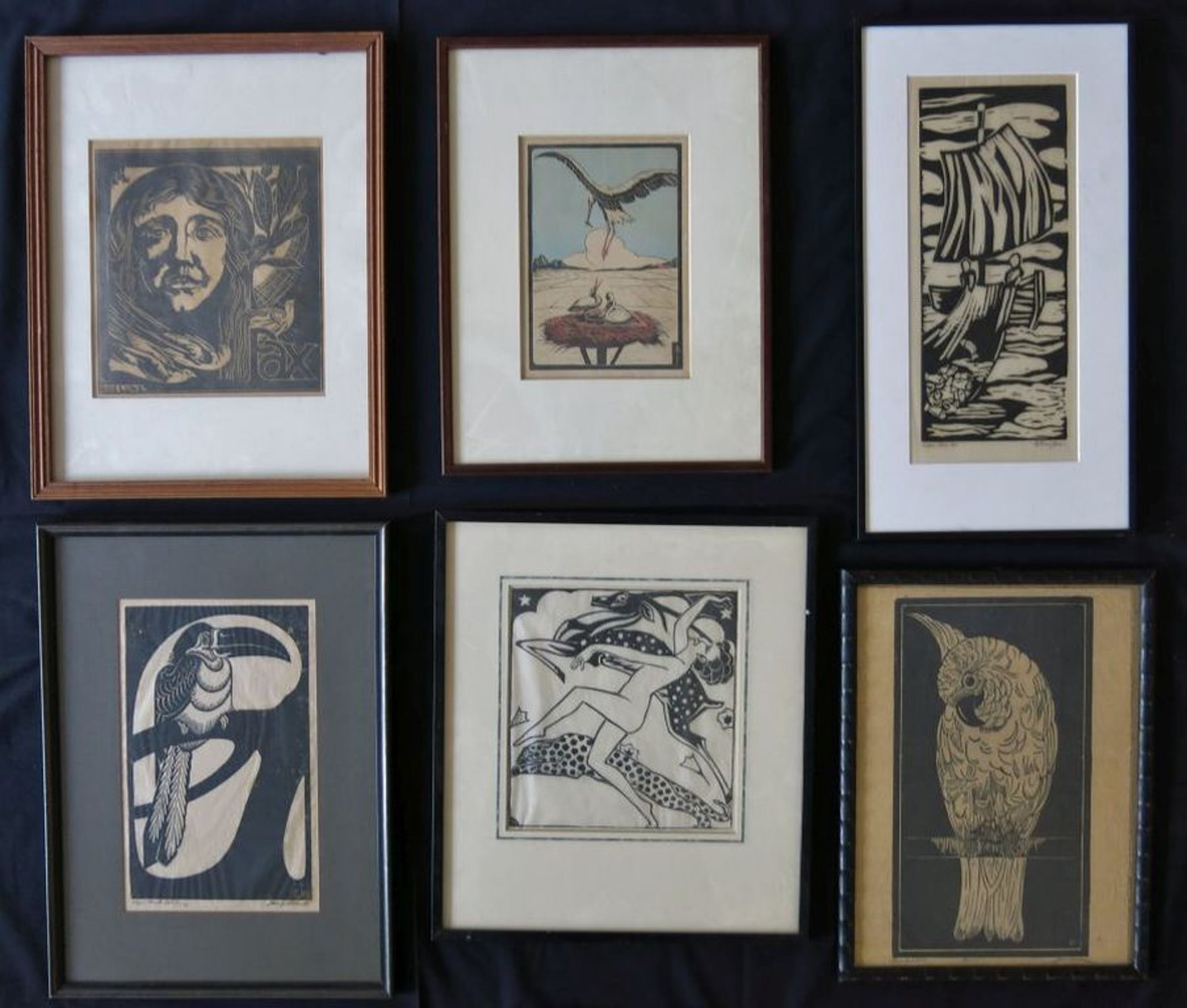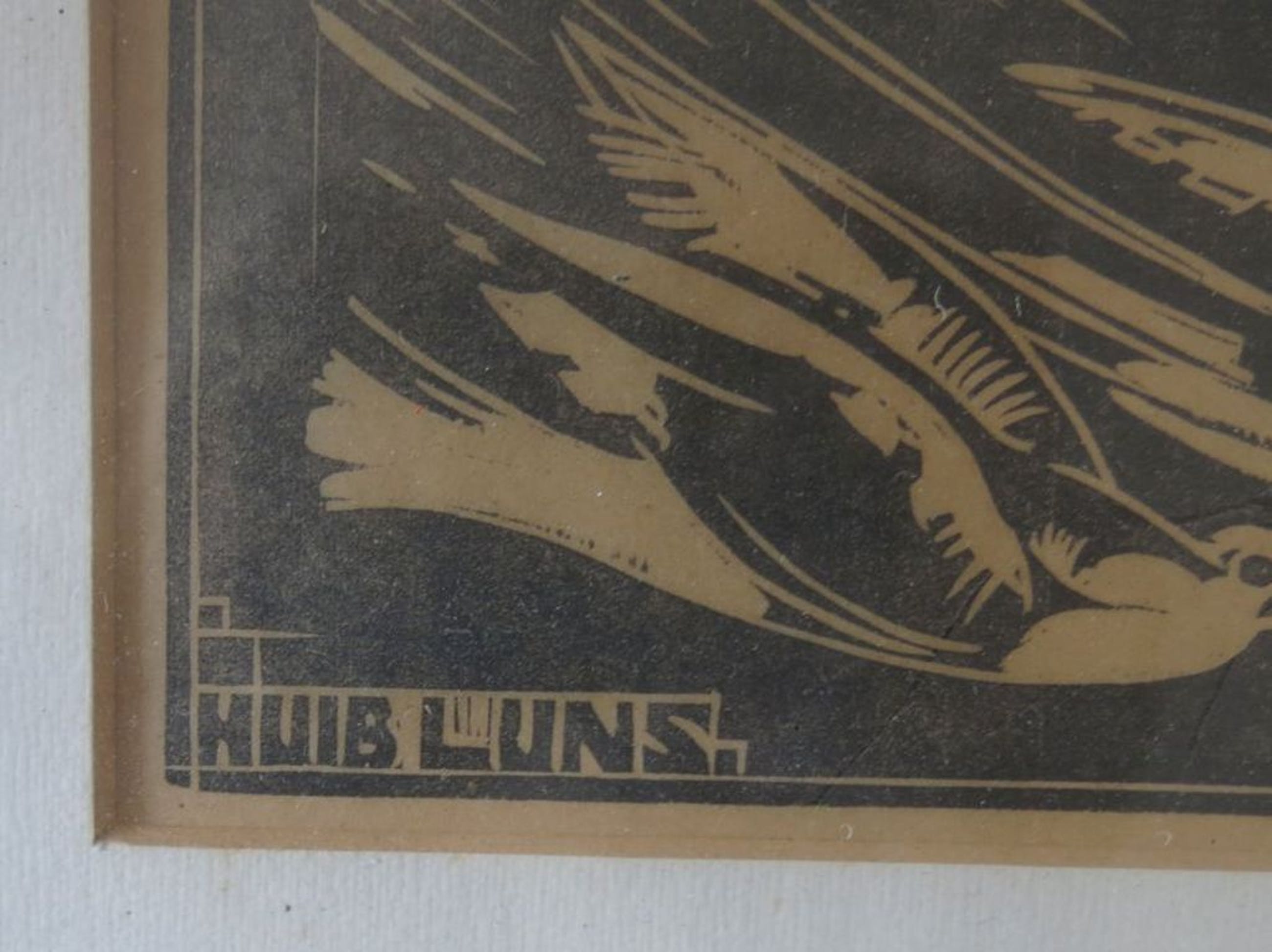 Lot met 6 ingelijste en gesigneerde werken, een aantal signaturen zijn voor ons helaas onbekend. Eén van de werken is van Huin Luns: