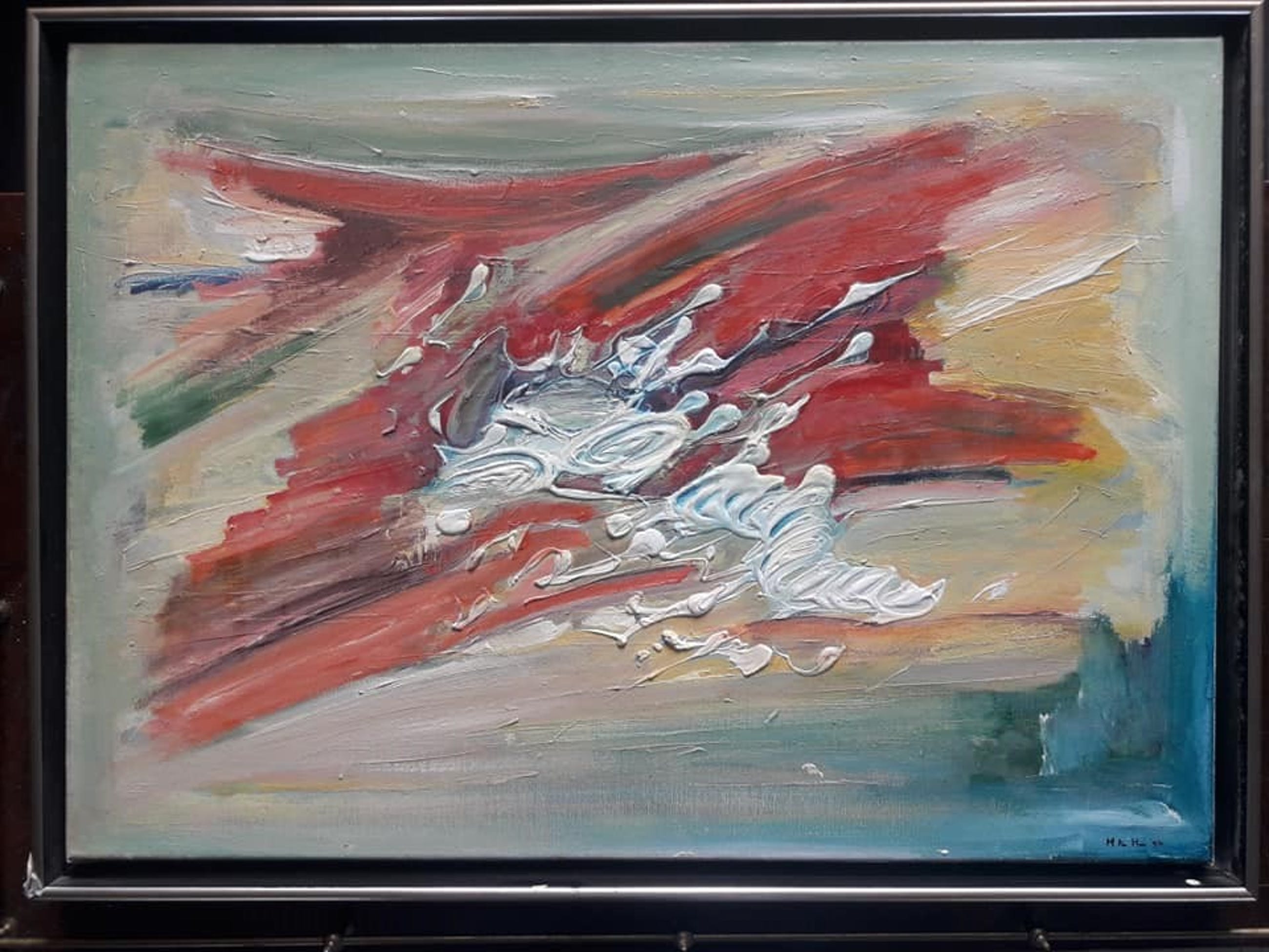 Bijzonder werk van een bijzondere man. Huib ter Haar was zowel een vooraanstaand psycholoog als ook begenadigd kunstschilder.Onderstaande link van een artikel in de Elzevier verteld het verhaal. https://www.elsevierweekblad.nl/algemeen/article/2015/08/huib-ter-haar-1935-2015-een-intutieve-psycholoog-2677155W/ Het strookje met daarop de naam van het schilderij en de prijs van 3750,- gulden vond ik in de lijst.Er worden nog 2 werken van deze schilder aangeboden in de huidige veiling.Bij verzending zal het worden verpakt in een op maat gemaakte kist om beschadiging te voorkomen. Afhalen kan ook in IJmuiden of Bodegraven.