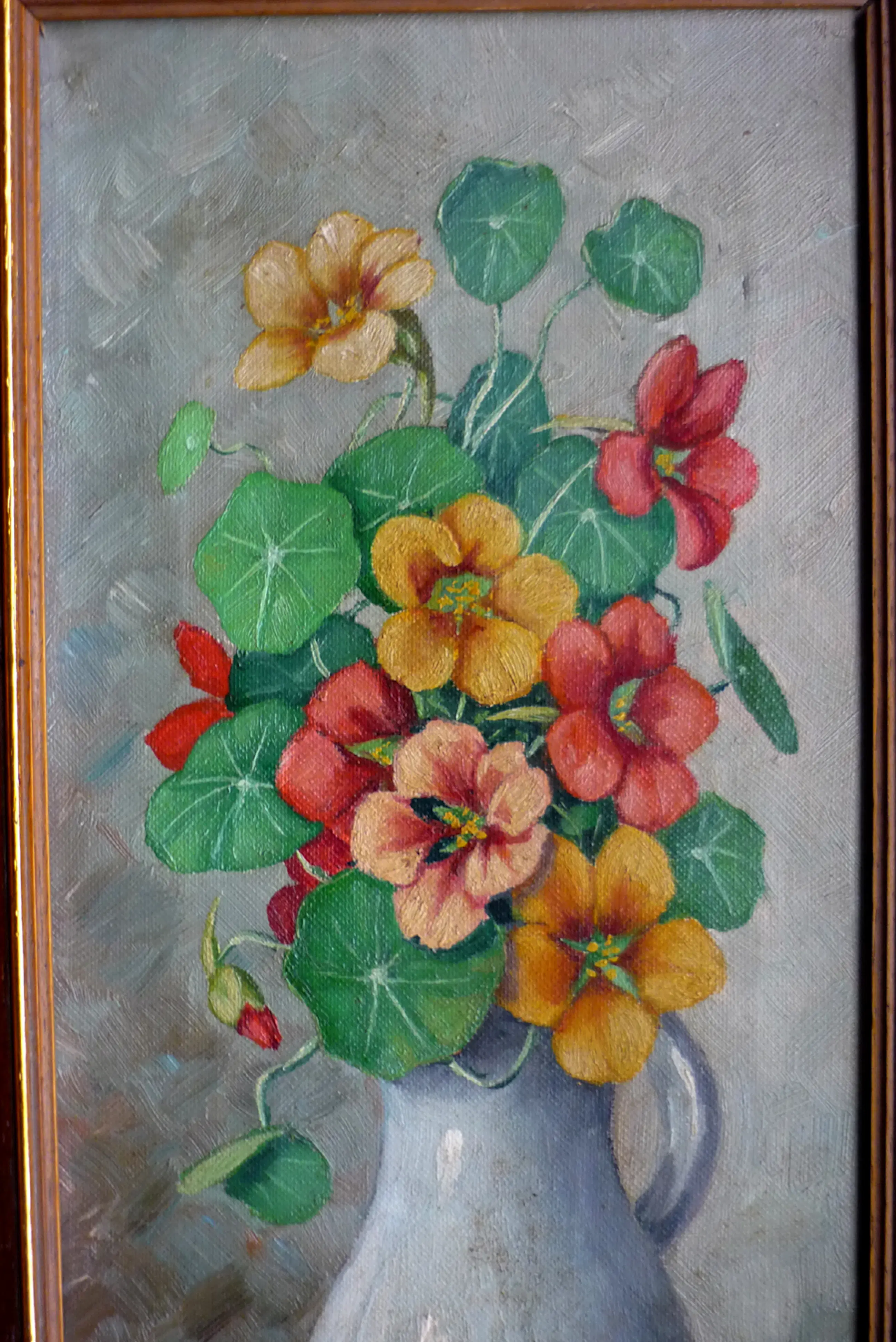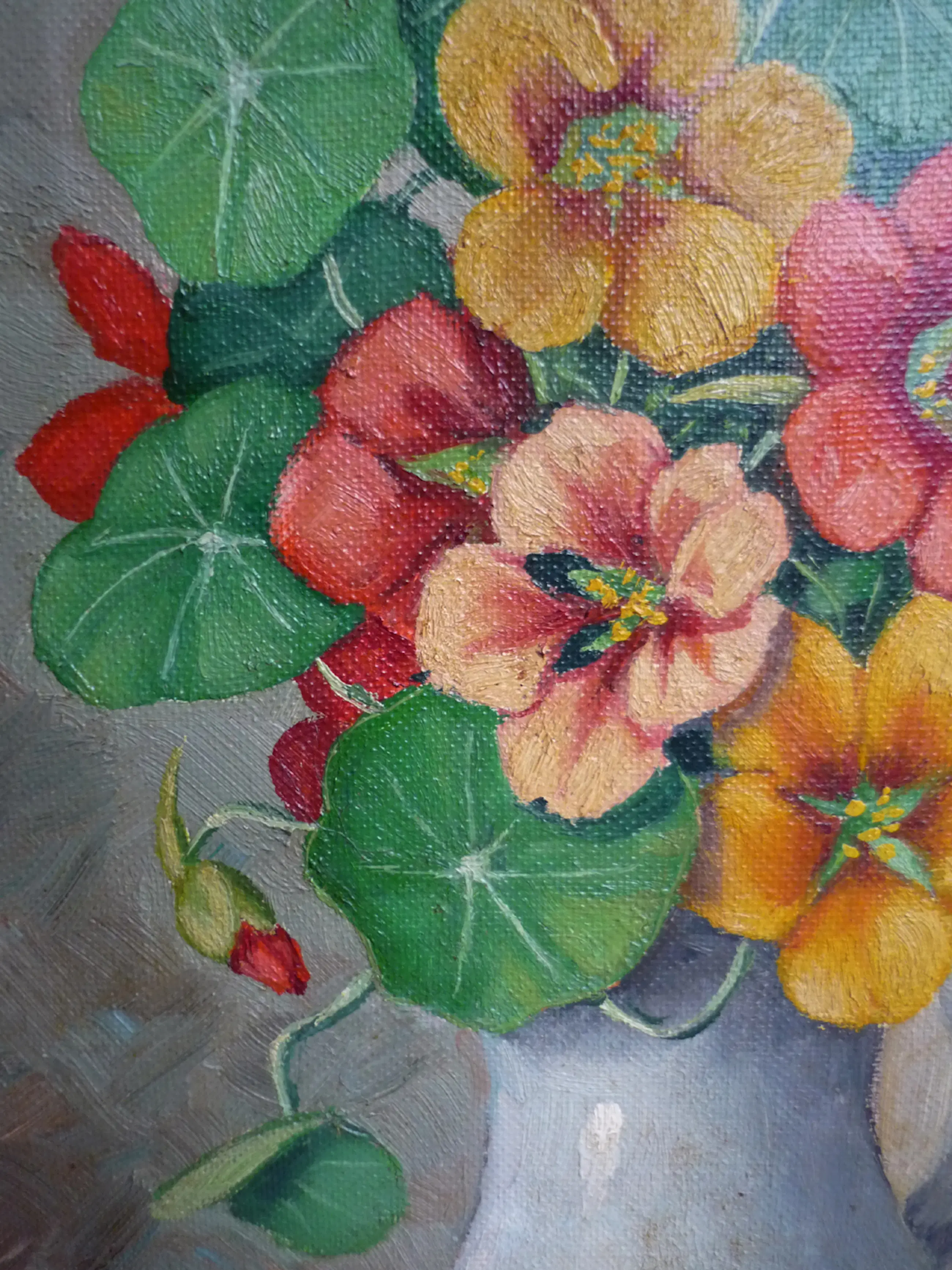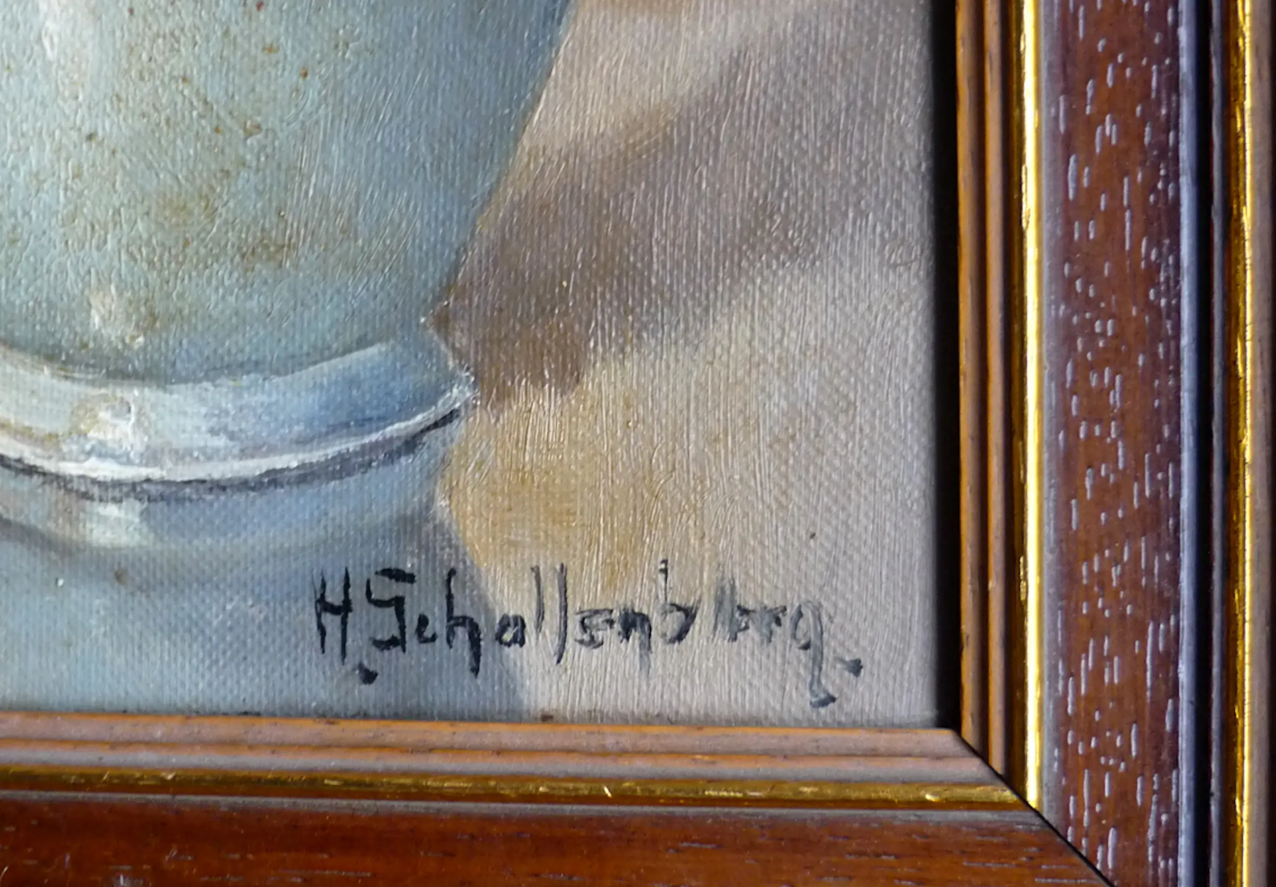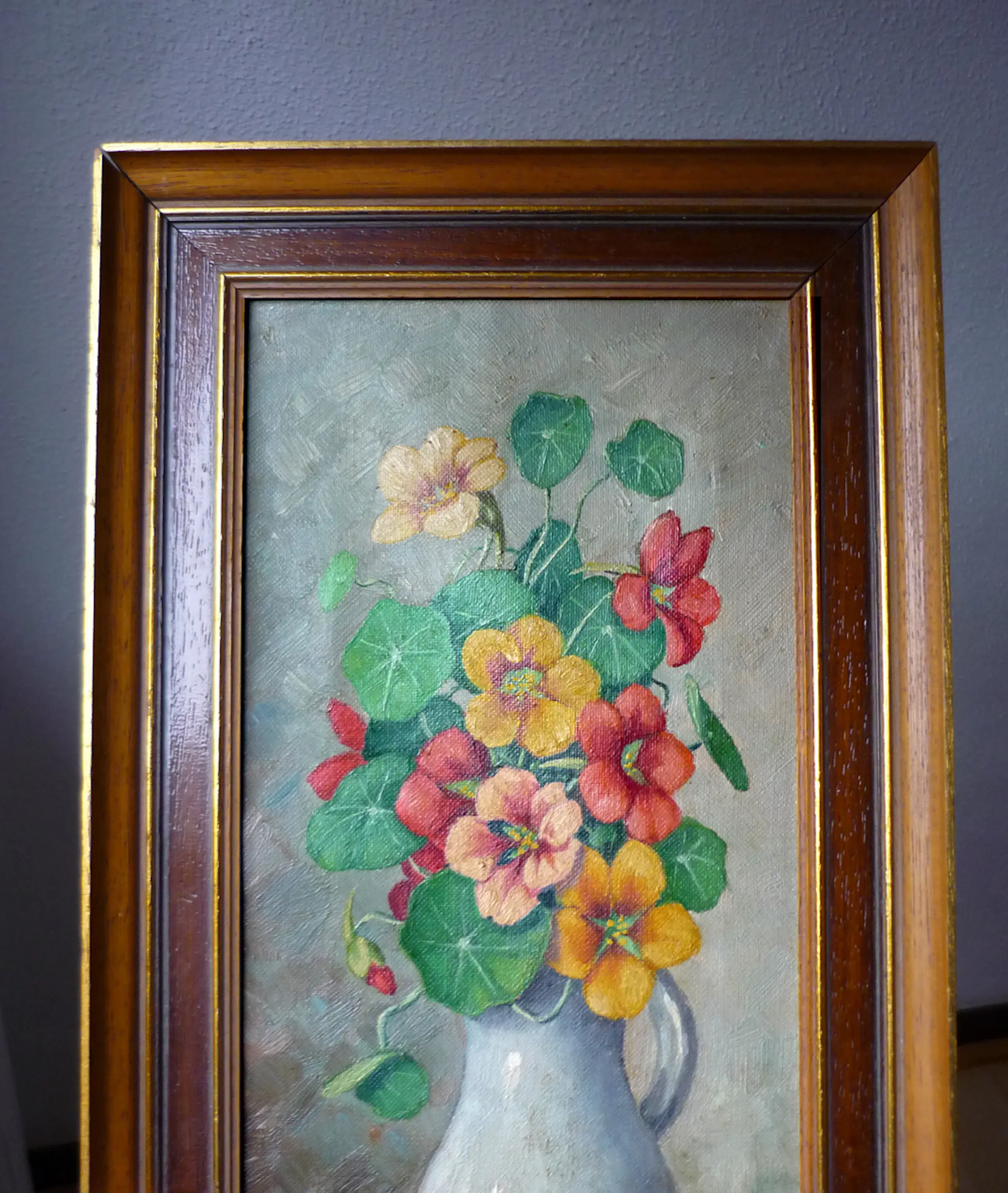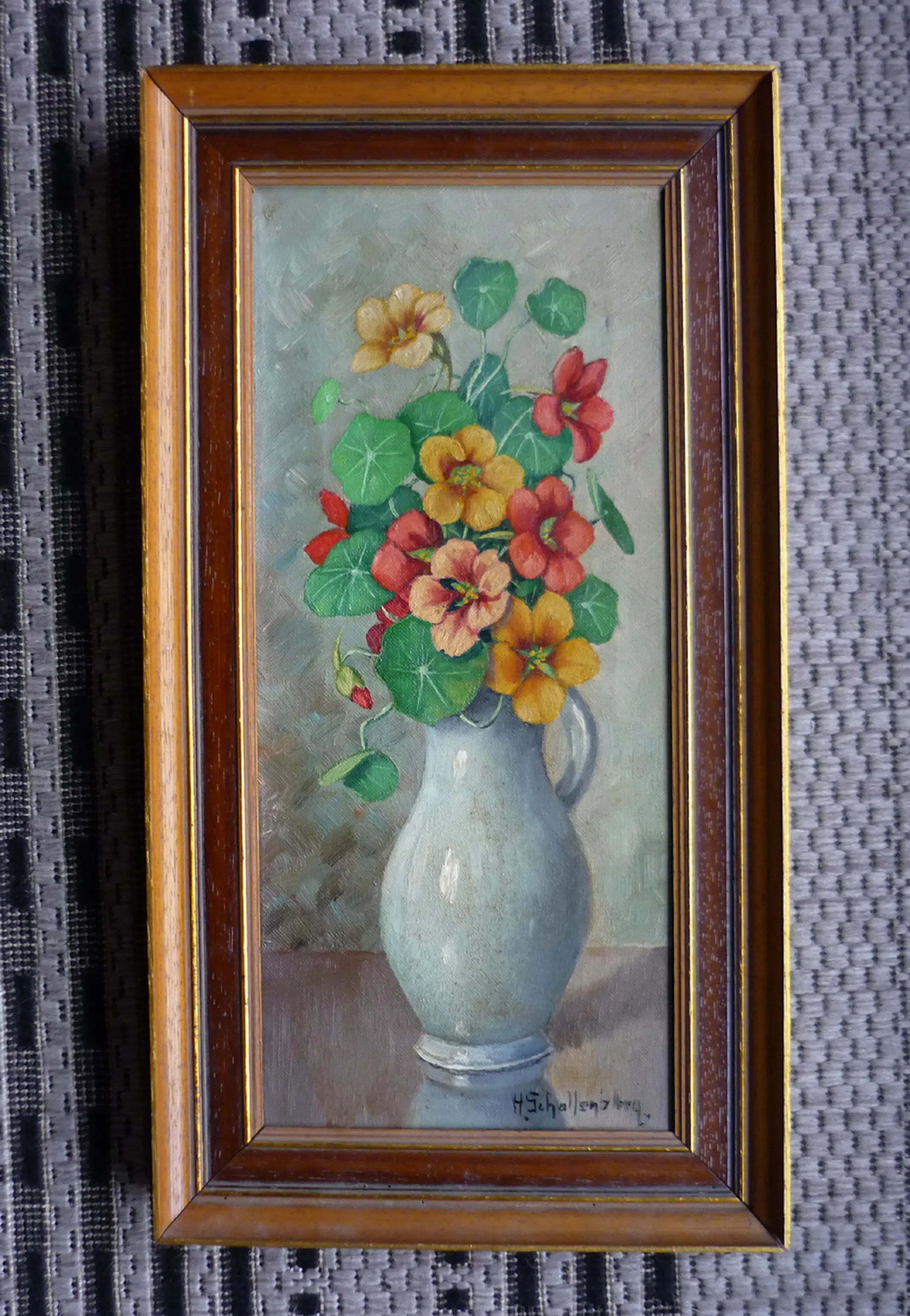 Ter veiling wordt aangeboden dit prachtige botanische schilderij van de Nederlandse kunstenaar Huibert Schallenberg (1883-1981). Hij was een botanisch schilder, maar schilderde ook landschappen en stillevens. Het zwierige karakter en speelse kleuren van de Oost Indische kers maakt dit schilderij extra aantrekkelijk. Met het originele label van de kunsthandel om achterzijde. Zijn werken zijn zeer gezocht onder de kunstverzamelaars.