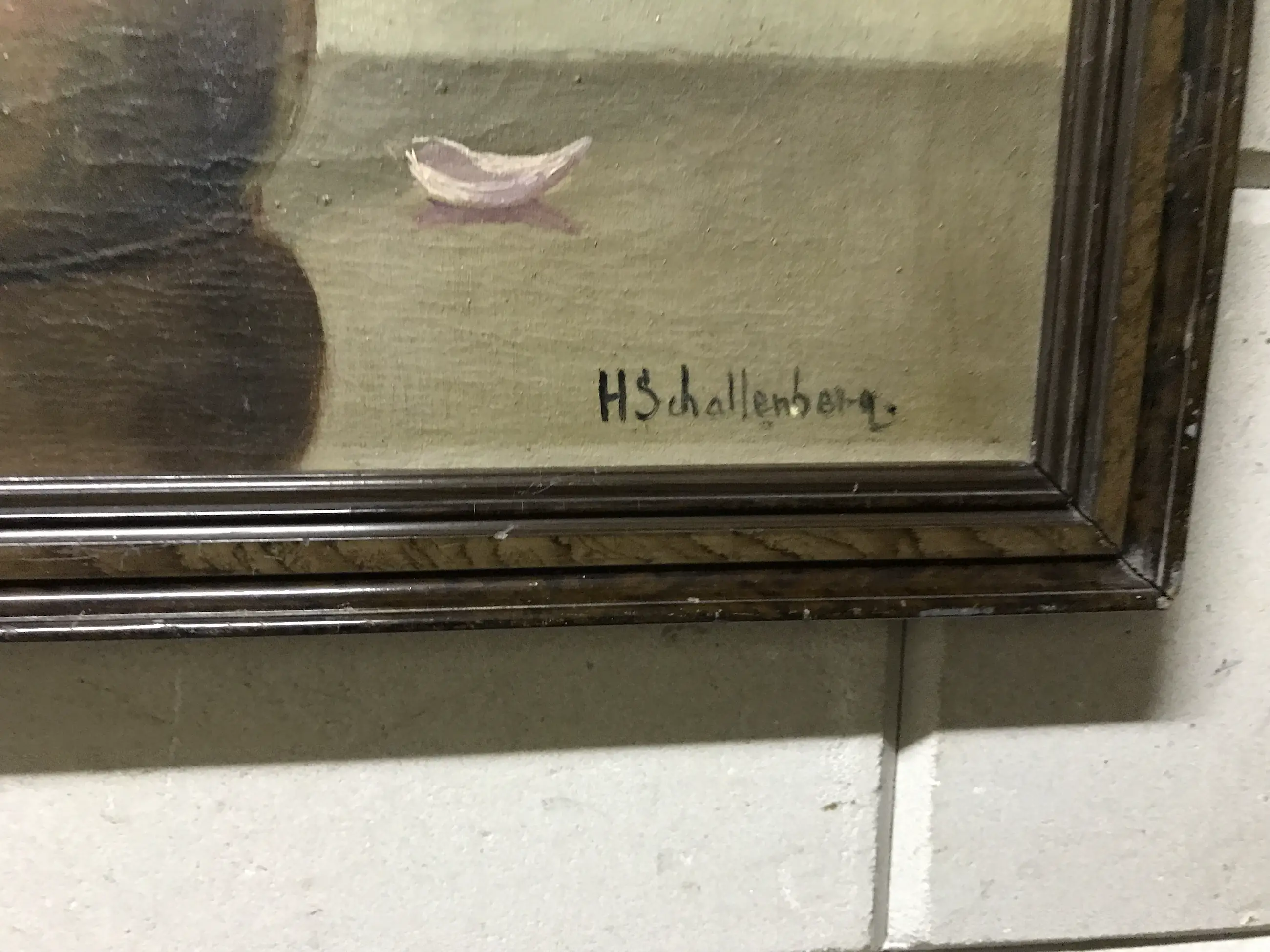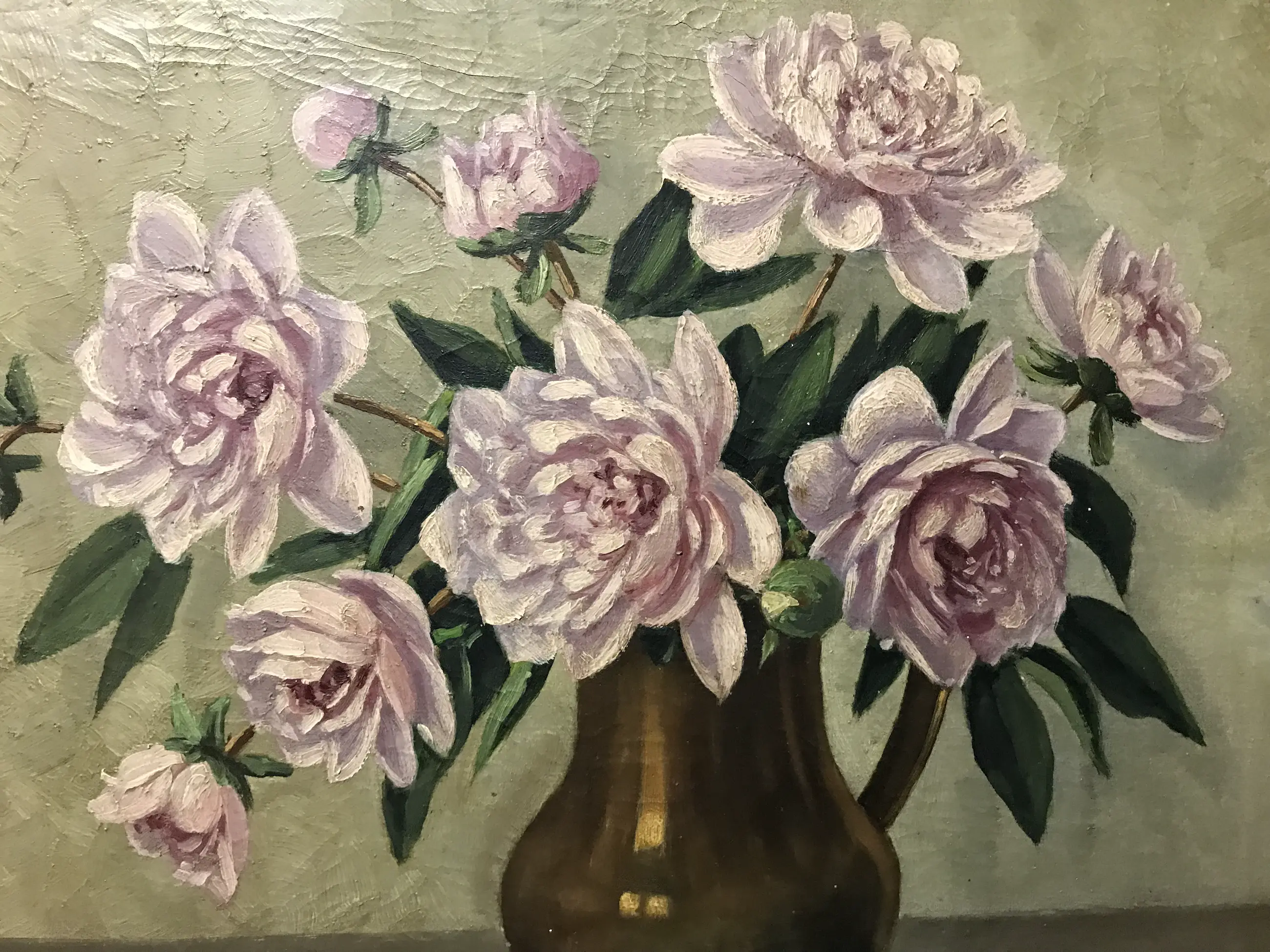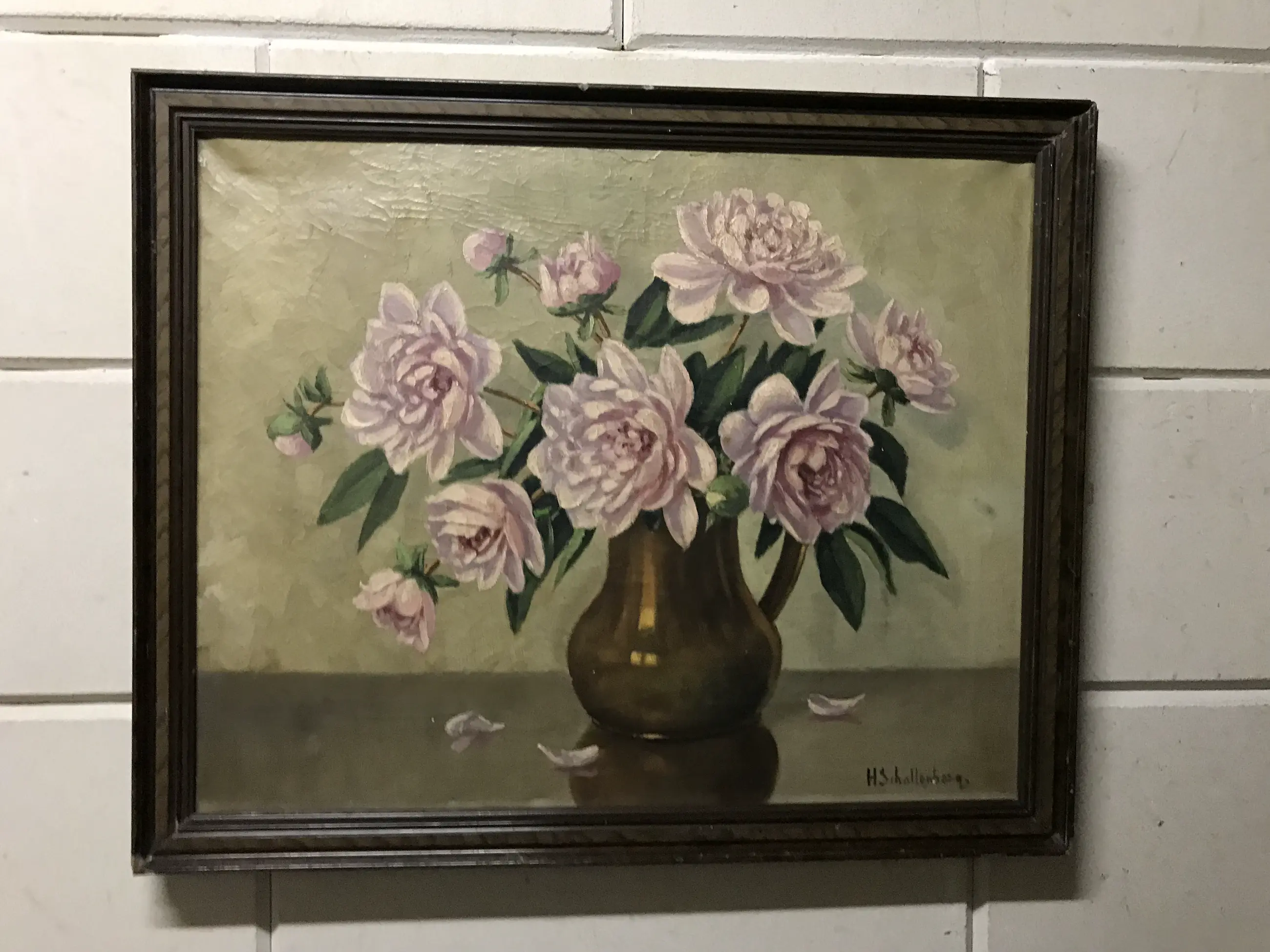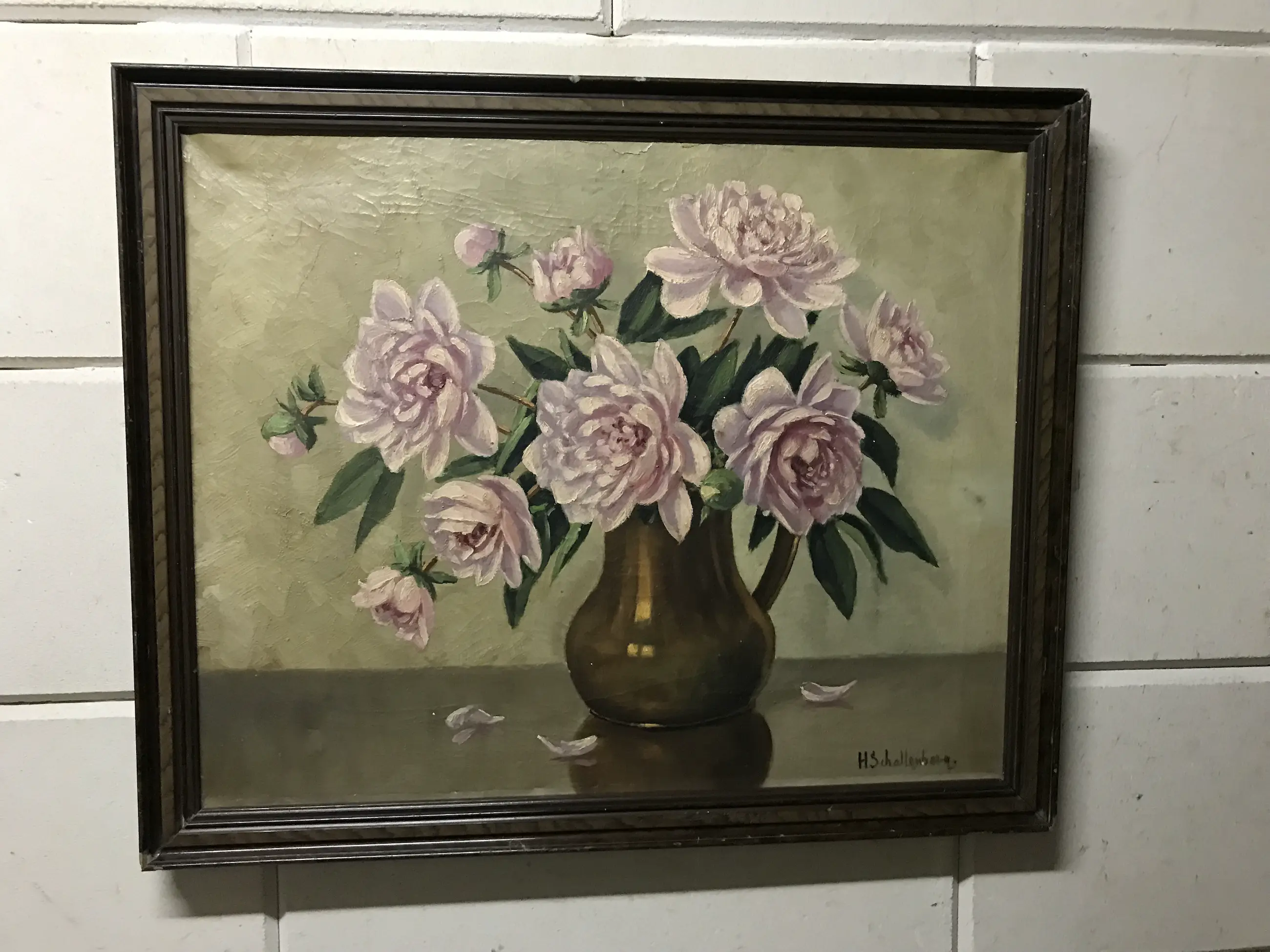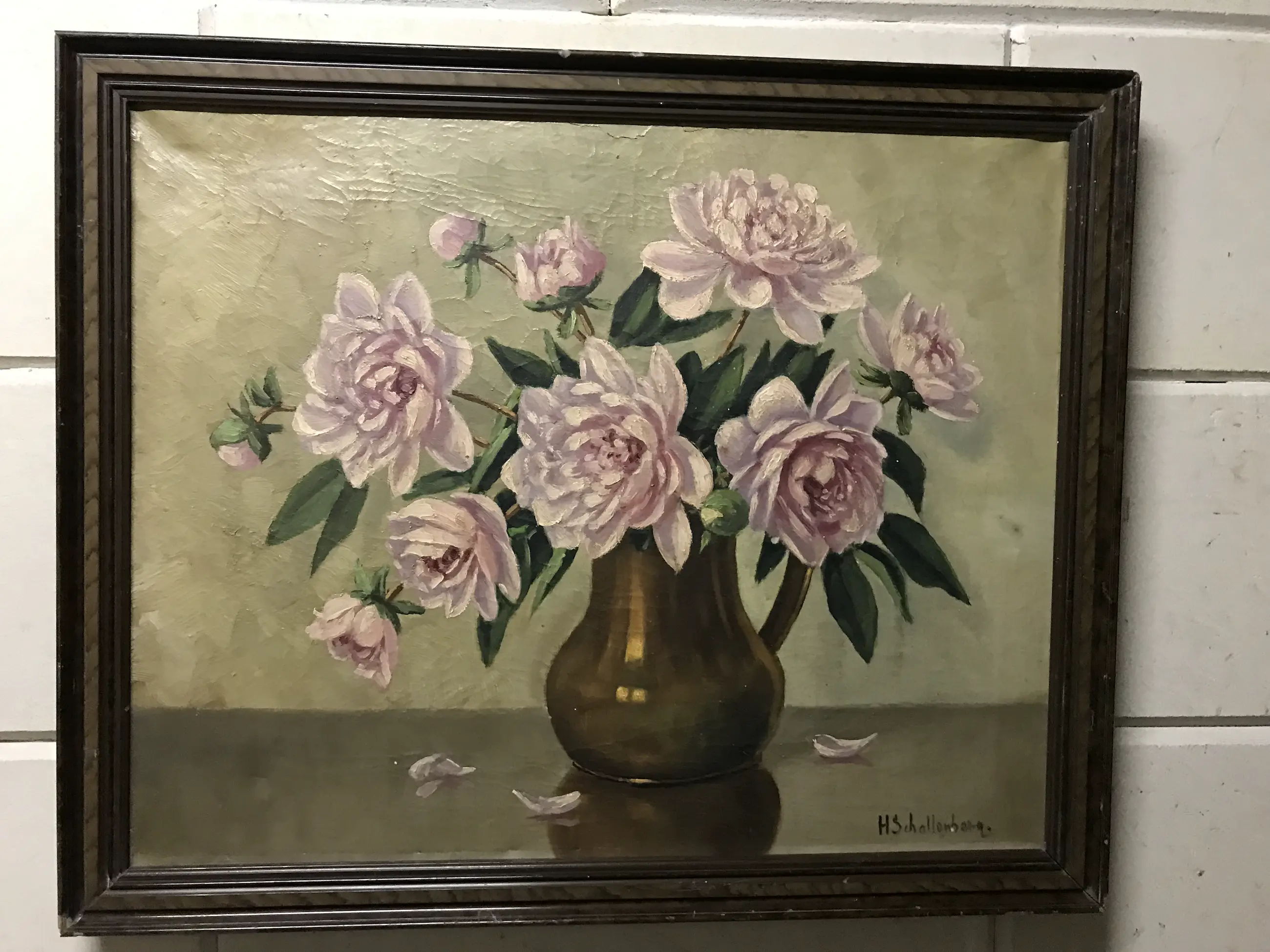 Een mooi schilderij op doek met een vaas met Pioenrozen Maat met lijst is 45 bij 55 Gesigneerd H Schallenberg .