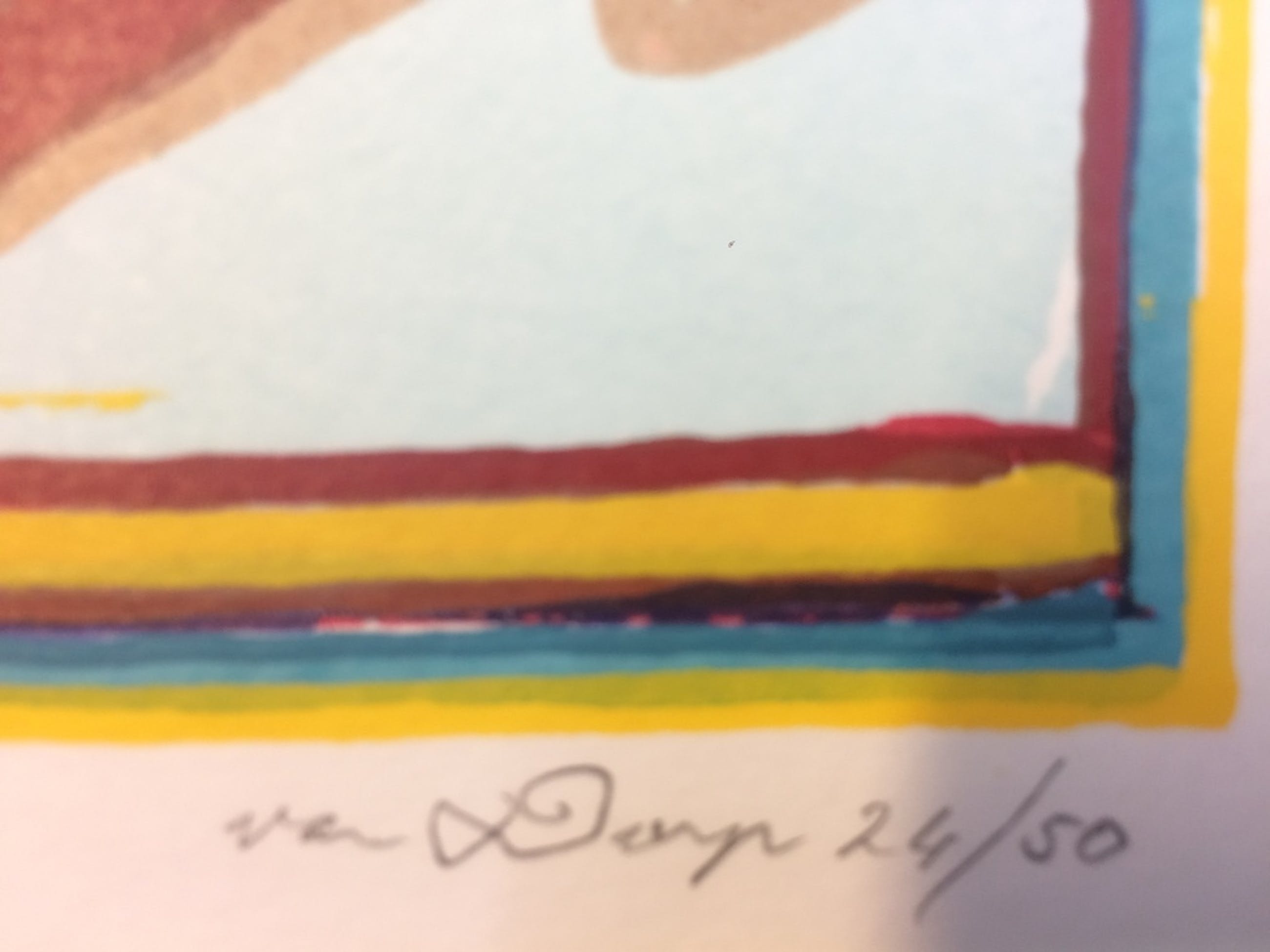 Mooi kleurrijke zeefdruk van Huibert van Dorp, prentmaat 40 x 50 cm en met passe partout 50 x 58 cm. Verkeert in perfecte staat. Gedrukt in een oplage van 50 exemplaren, dit is nummer 24. Kan worden afgehaald met passe partout in onze galerie in Arkel of verzonden worden zonder passe partou tper aangetekende post in een stevige kartonnen verpakking.