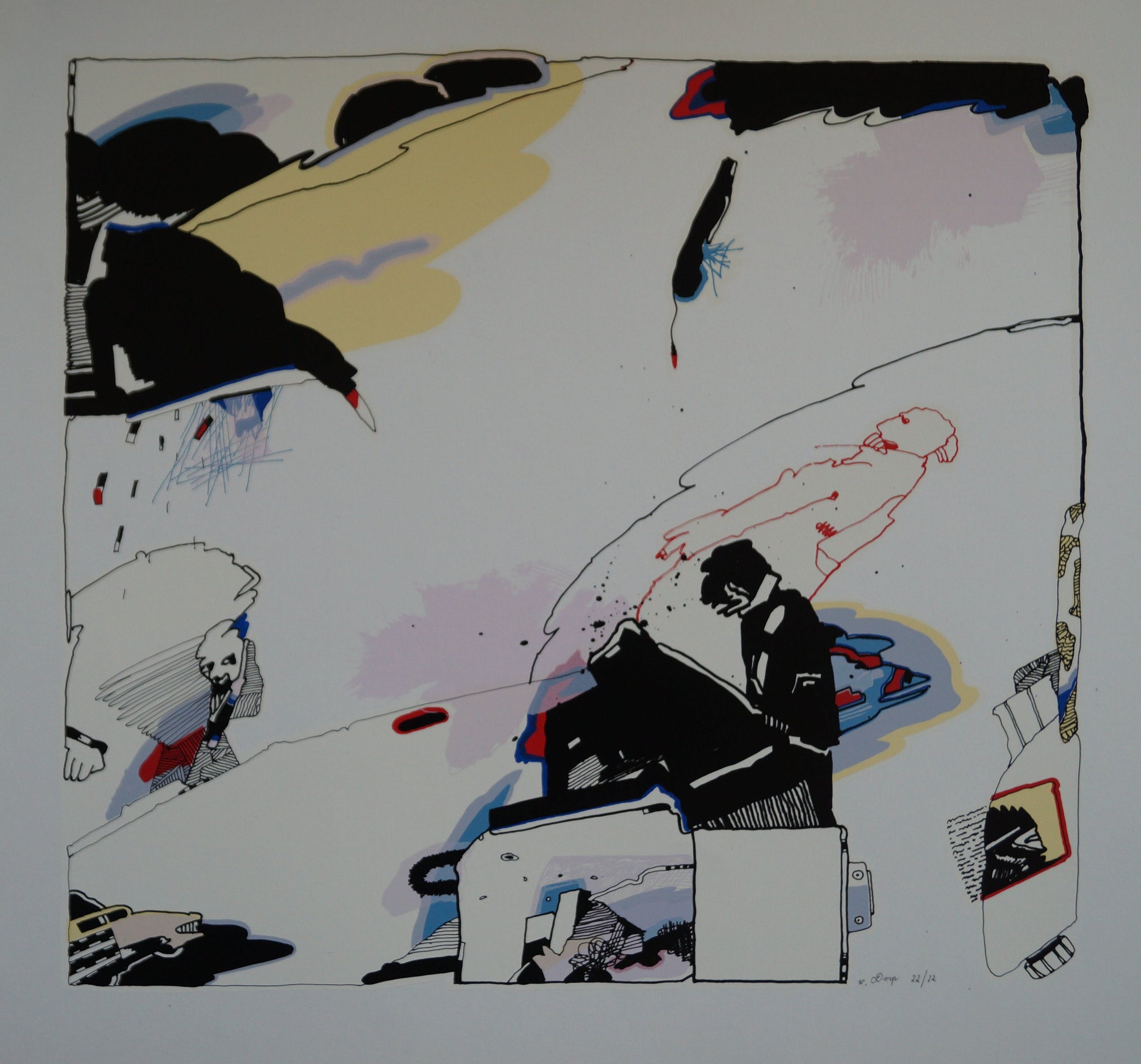 Gesigneerde zeefdruk van Huibert van Dorp Oplagenummer: 22/ 72 Afmeting afbeelding: 40 x 44 cm Conditie: zeer goed