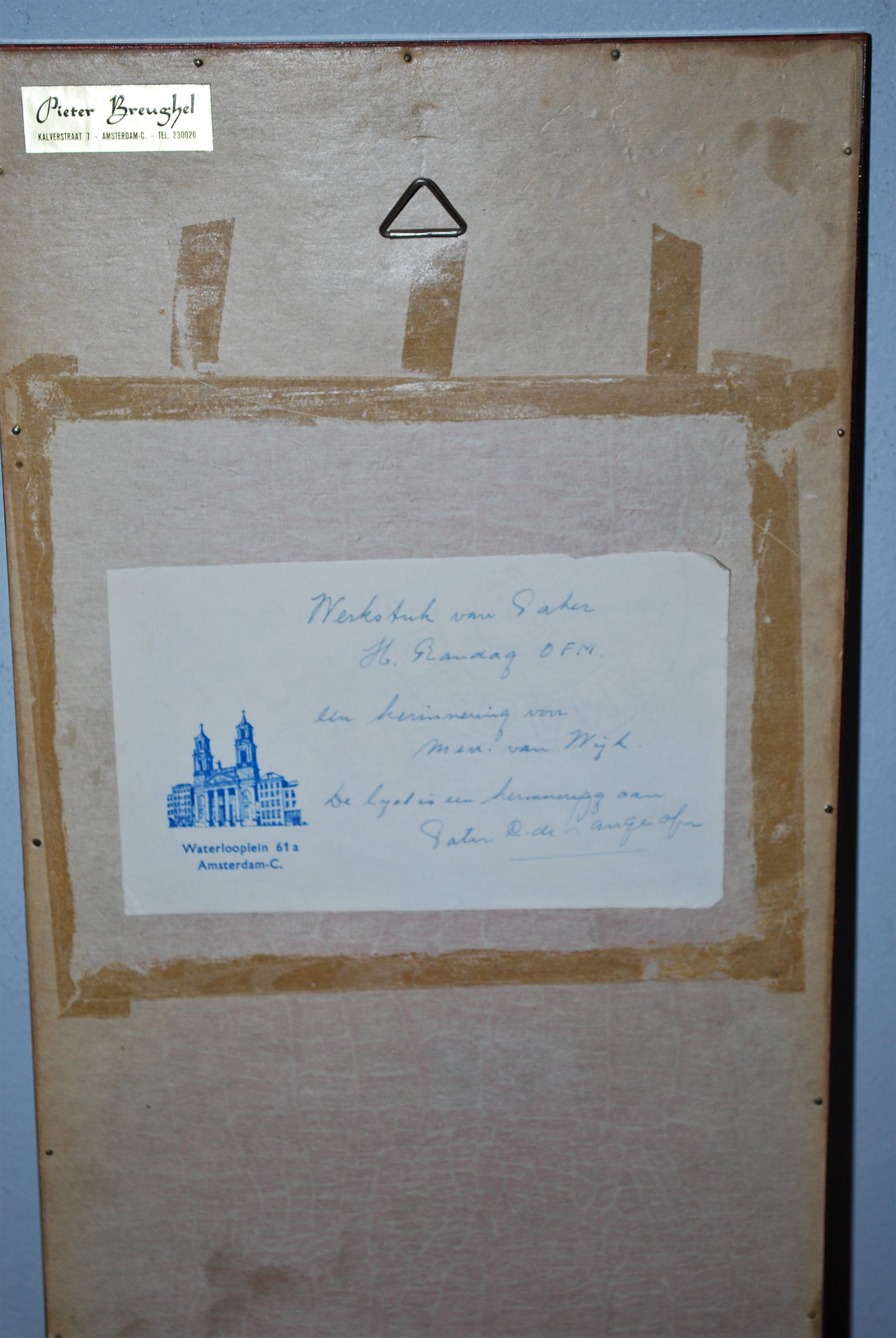 Dit werk is geschonken, zie de beschrijving aan de achterzijde. Het adres van Randag betrof n.a.w. Waterlooplein 61, Amsterdam, de pastorie van de R.K. Mozes & Aaronkerk