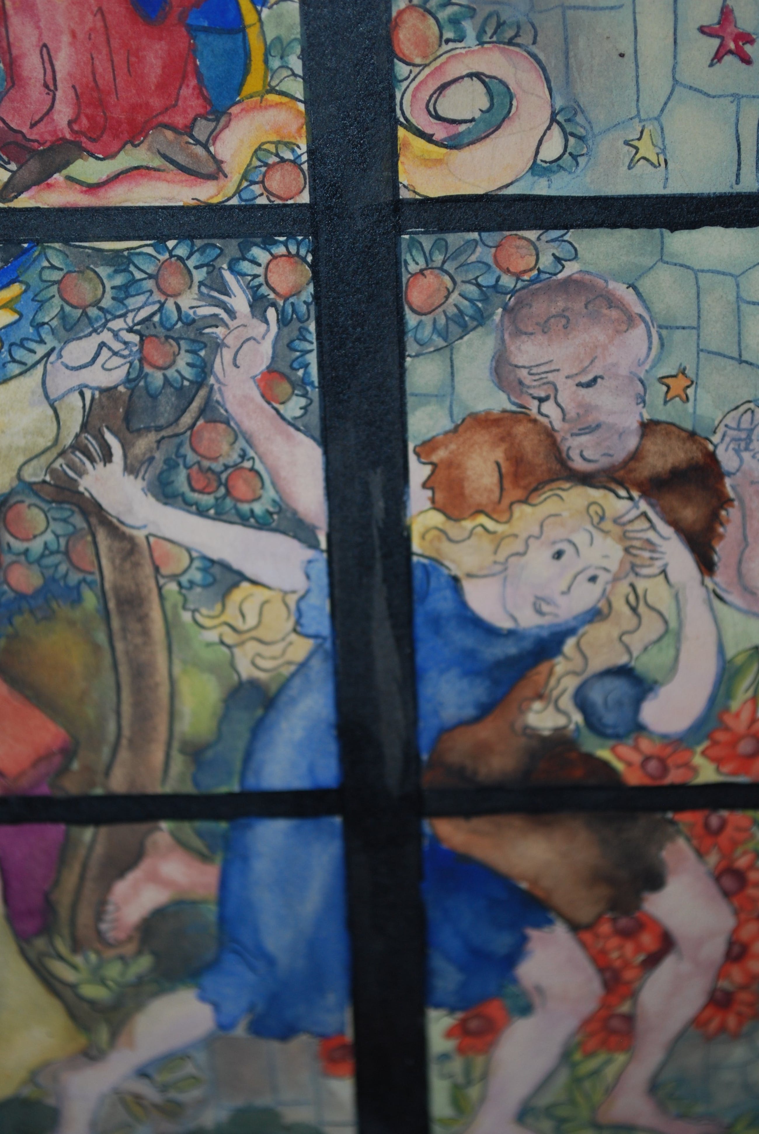 Aquarel/inkt/gouache op papier. Het zwart is ook geschilderd. In goede staat