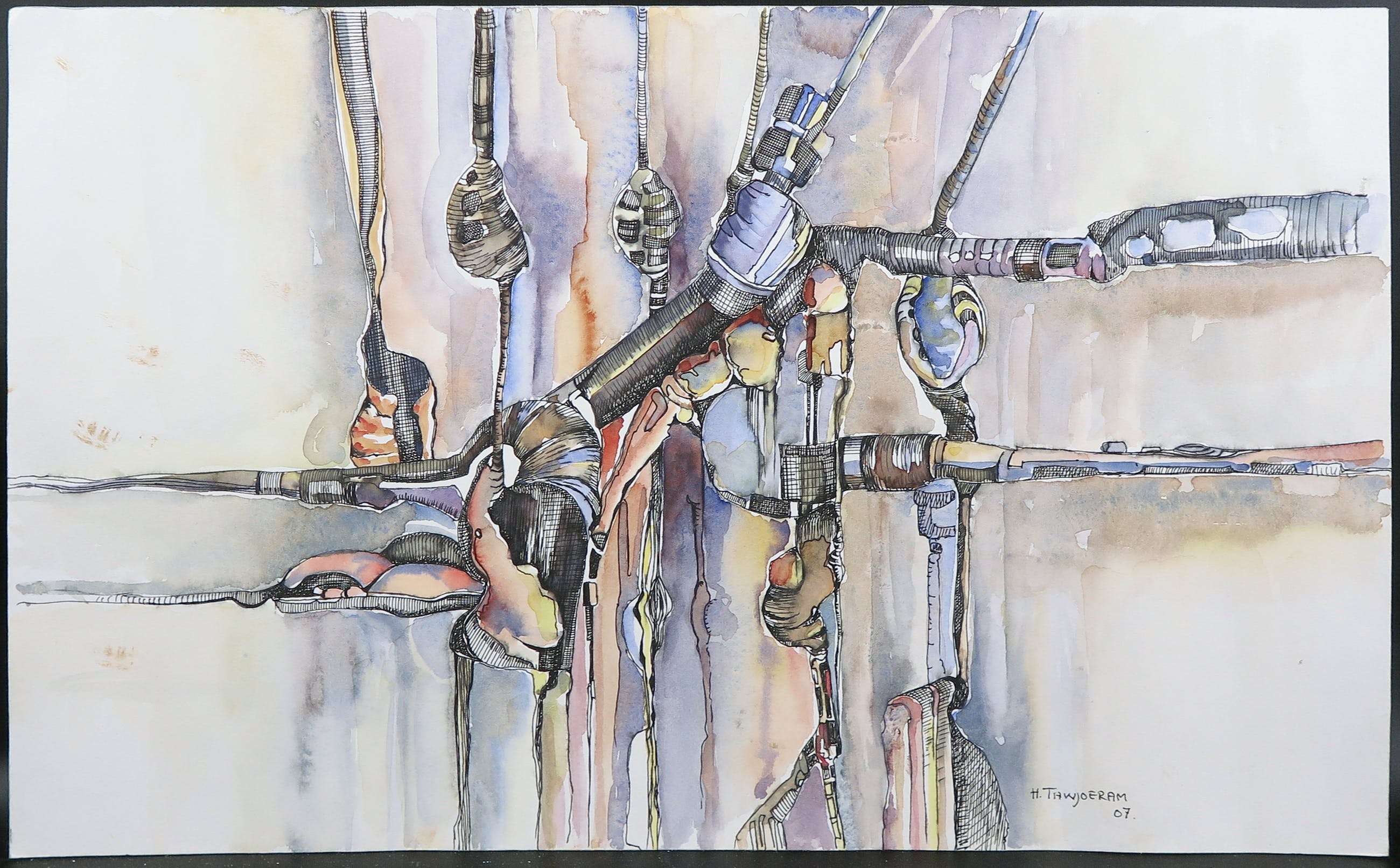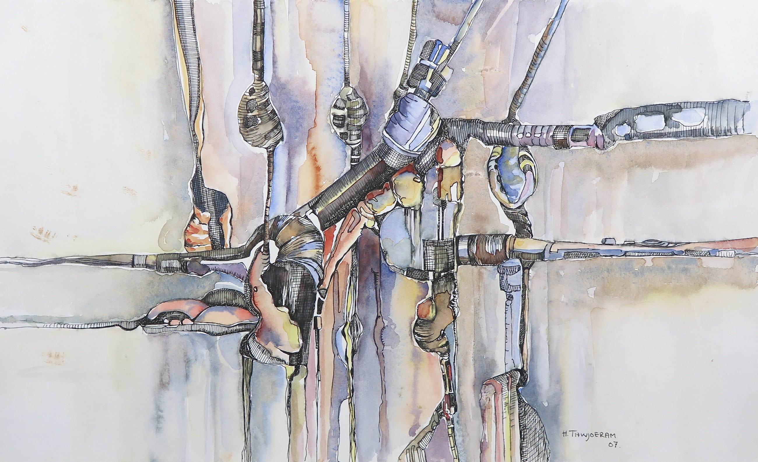 Kleurrijke en intrigerende compositie met krachtige zwarte lijnen en zachte kleuren.
