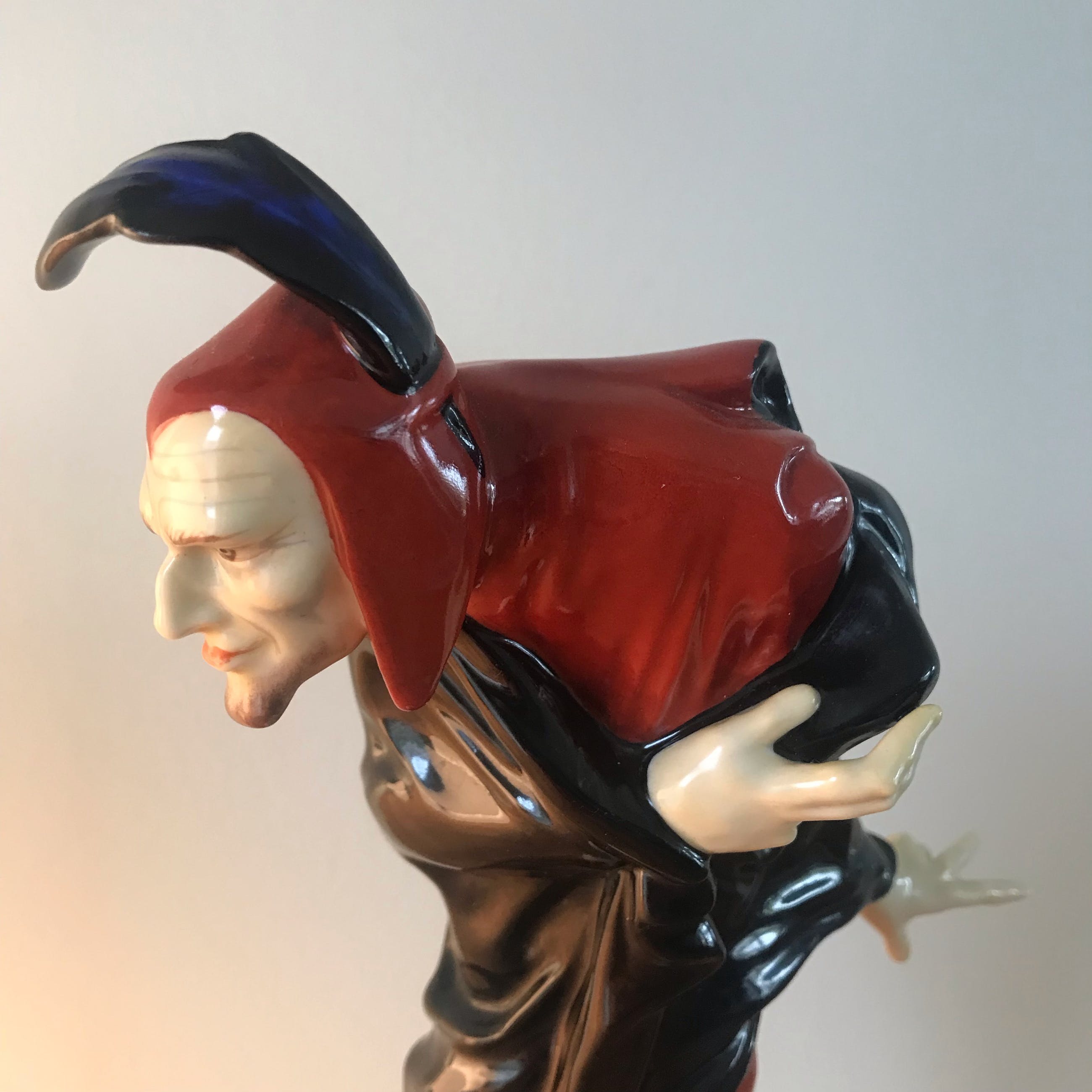 Dik glazuur van het rood-oranje pak, zwarte mantel, vleeskleur en zwart met blauw geaccentueerde veder-in-cap.