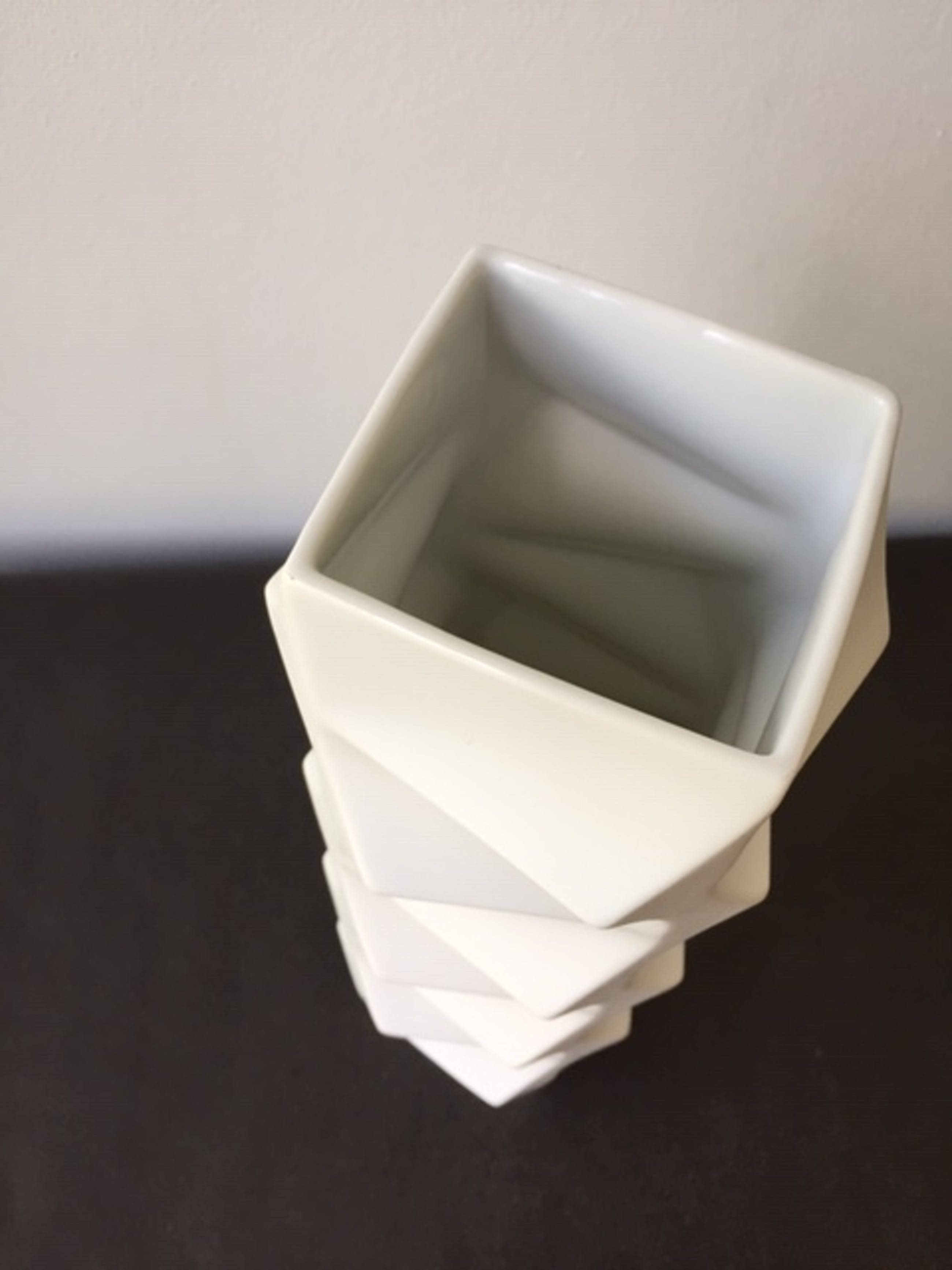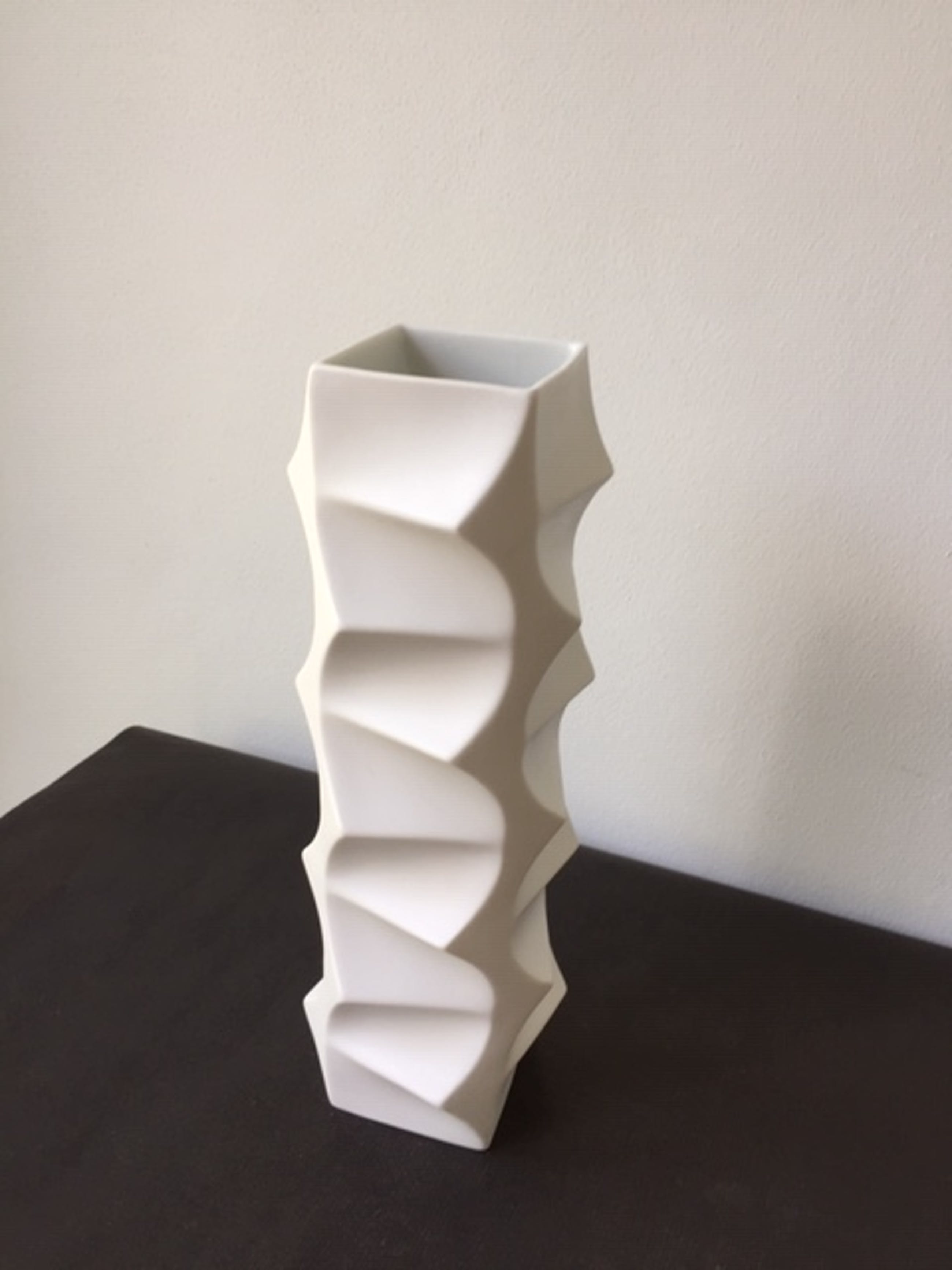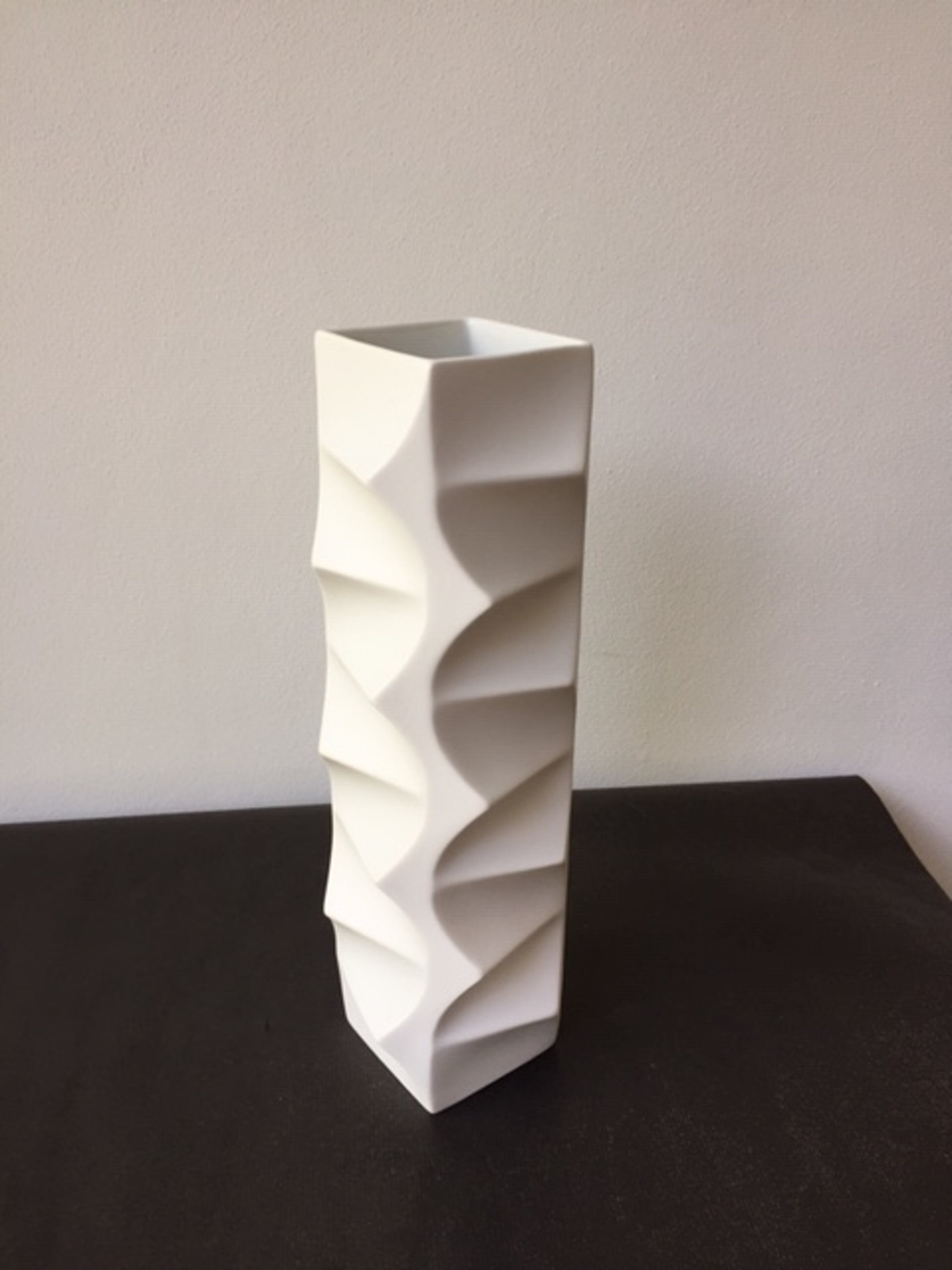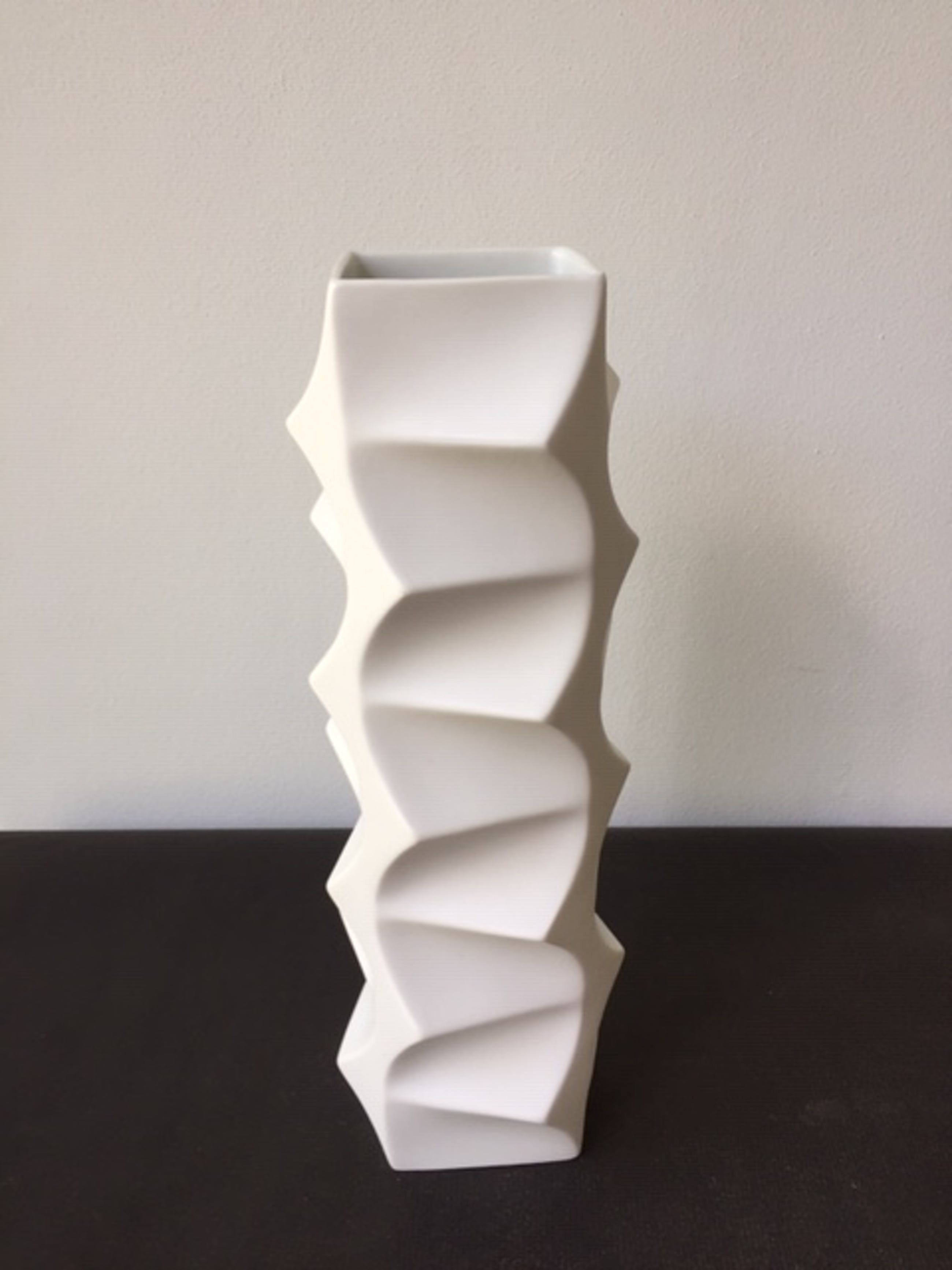 Monumentale, hoge vaas met reliëf. Wit, mat (biscuit) porselein. De binnenzijde heeft glanzend wit glazuur. Ontwerp Heinrich Fuchs voor Lorenz Hutschenreuther. Jaren 1968-1970.
