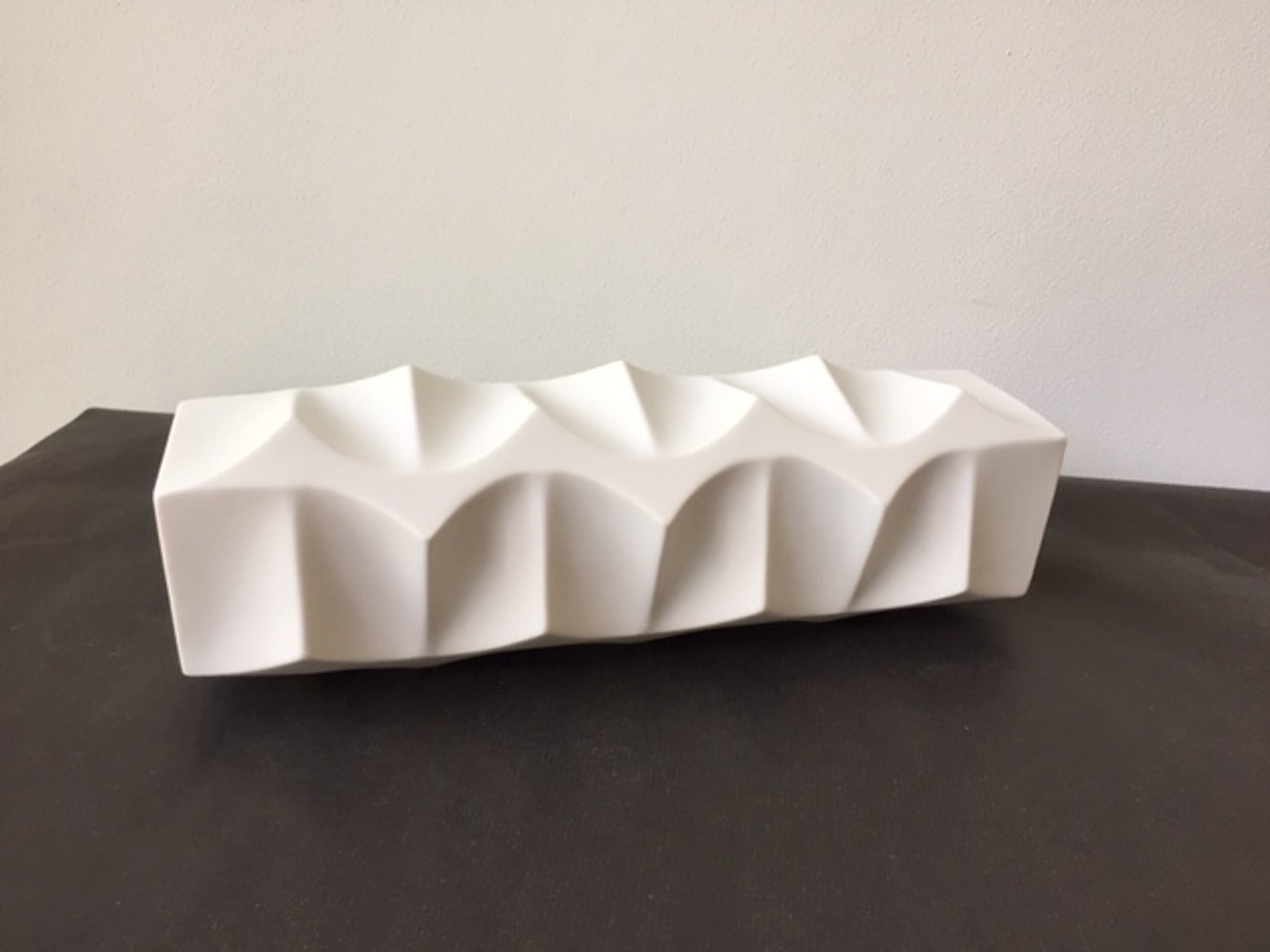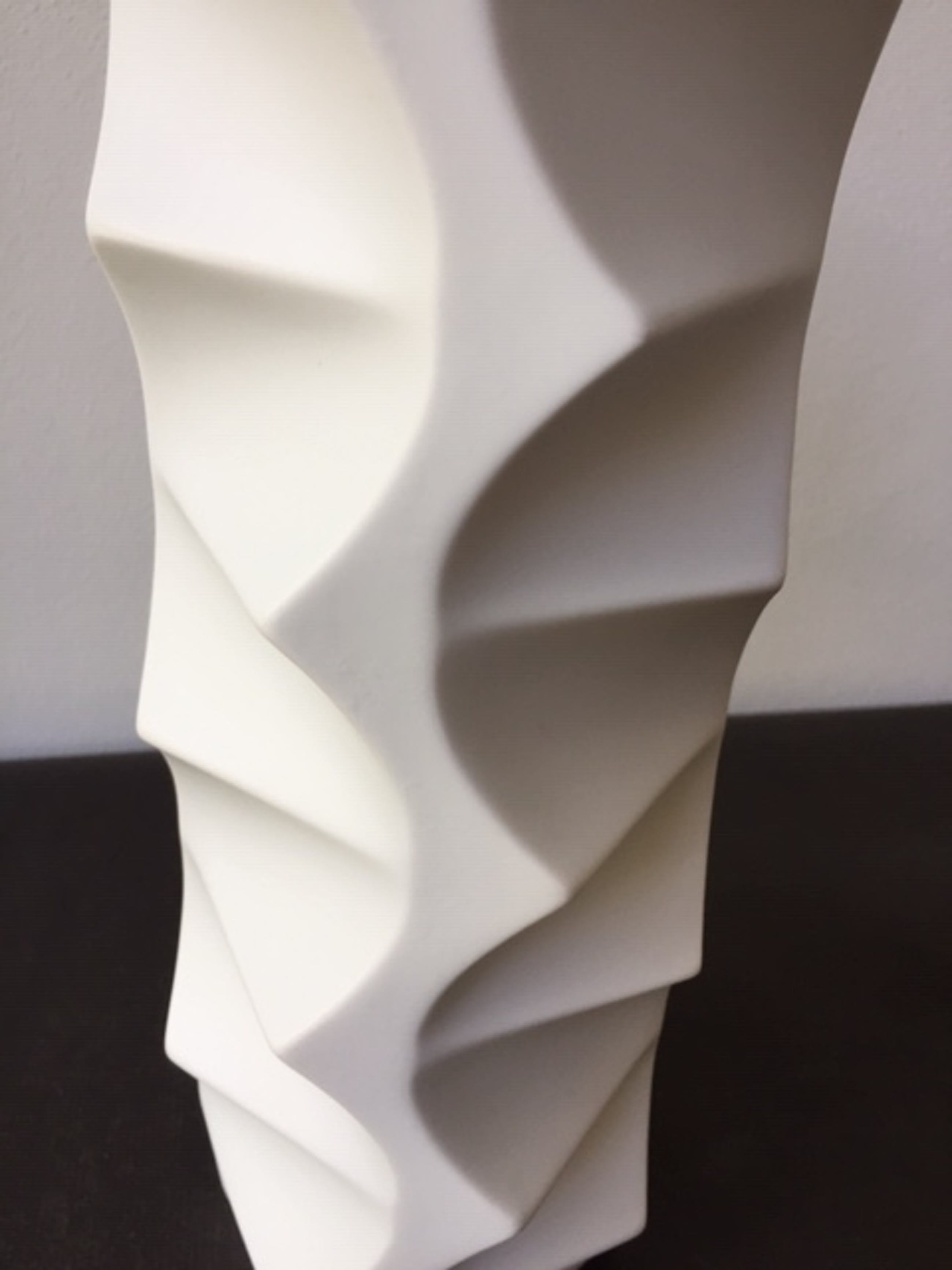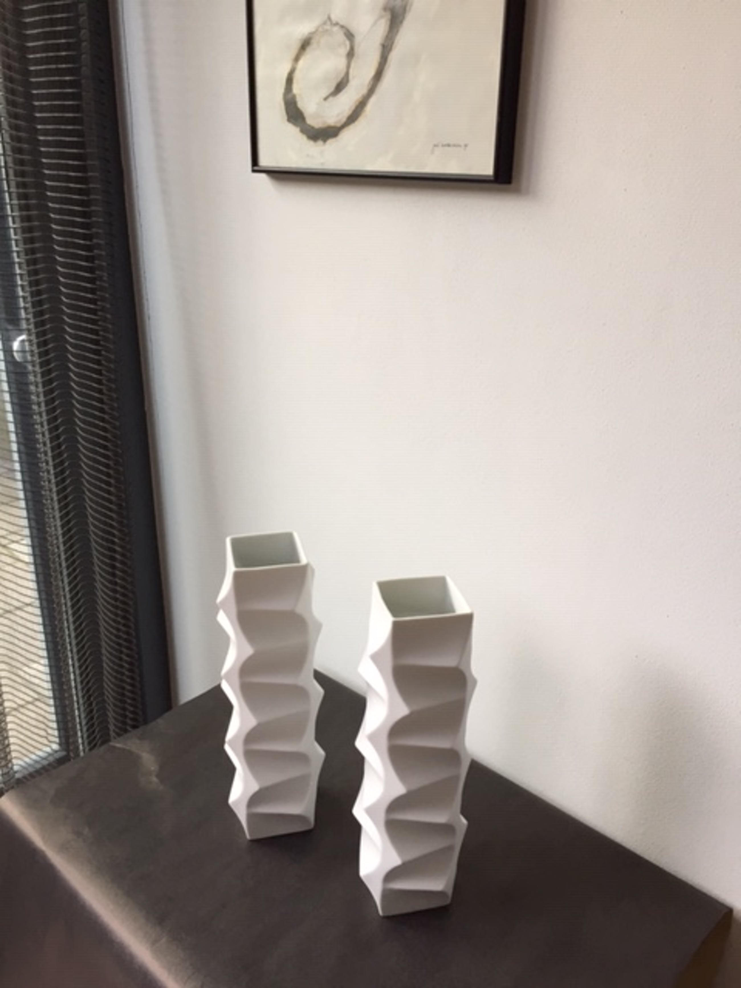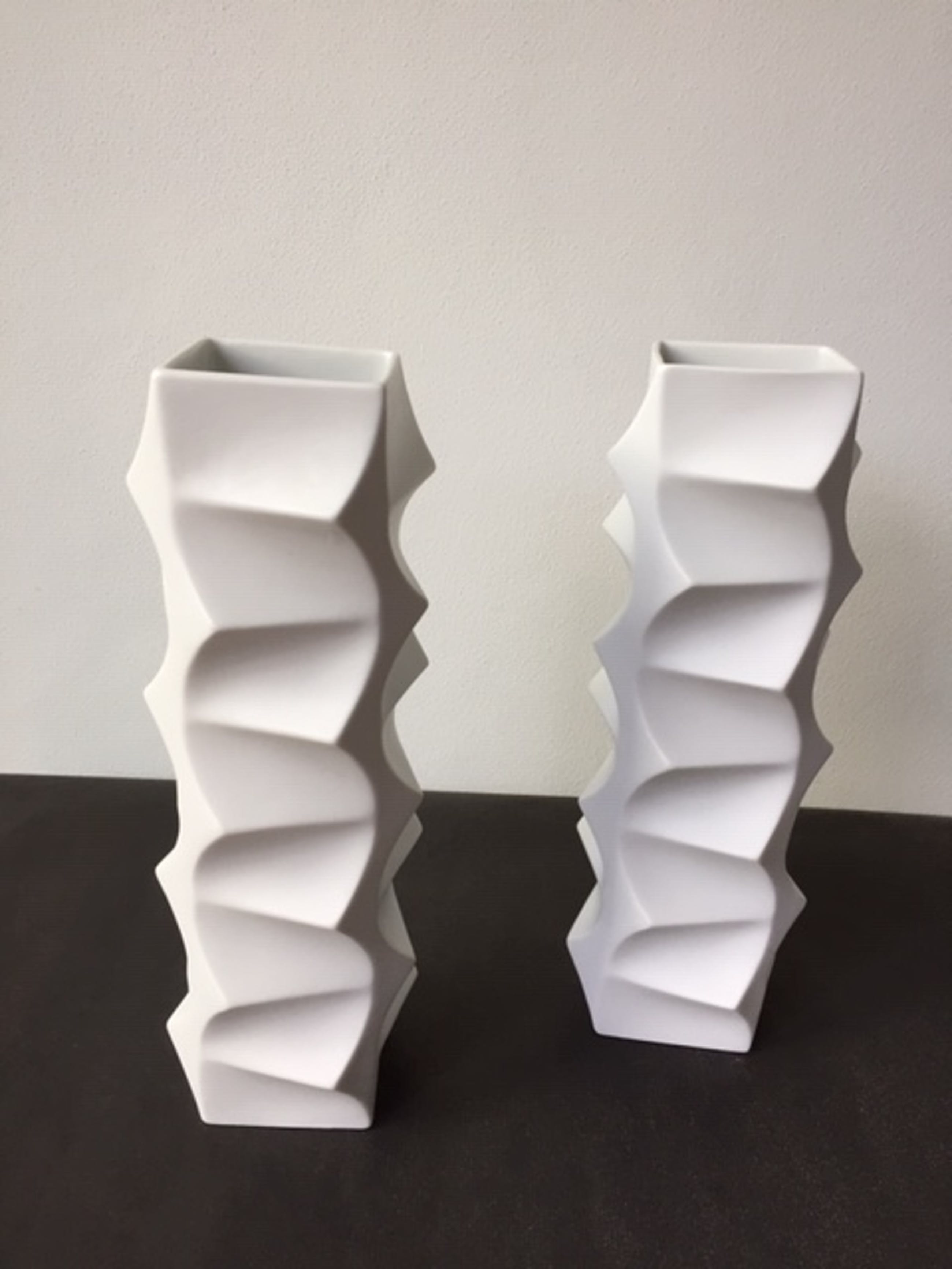 Monumentale, hoge vaas met reliëf. Wit, mat (biscuit) porselein. De binnenzijde heeft glanzend wit glazuur. Ontwerp Heinrich Fuchs voor Lorenz Hutschenreuther. Jaren 1968-1970.