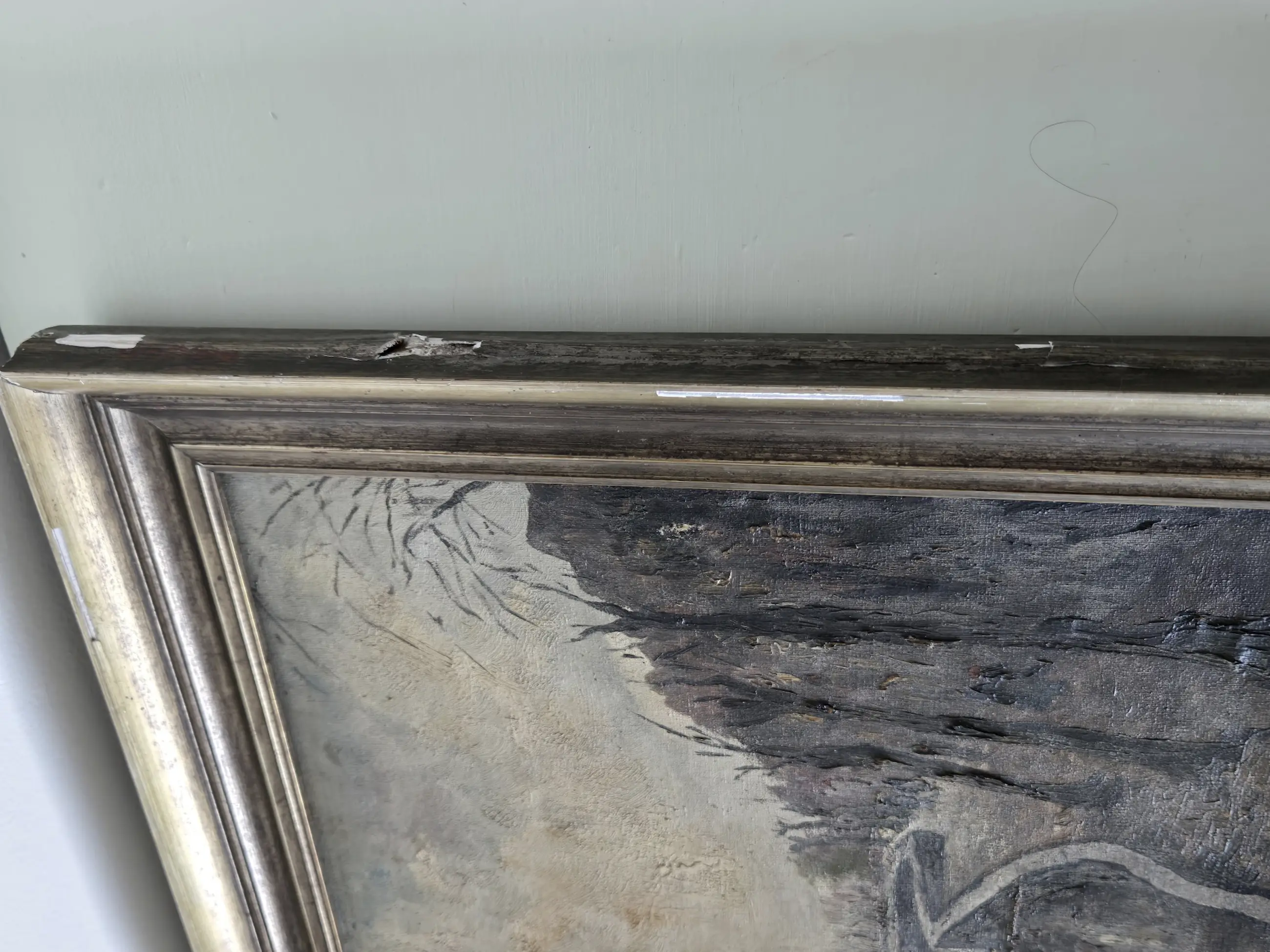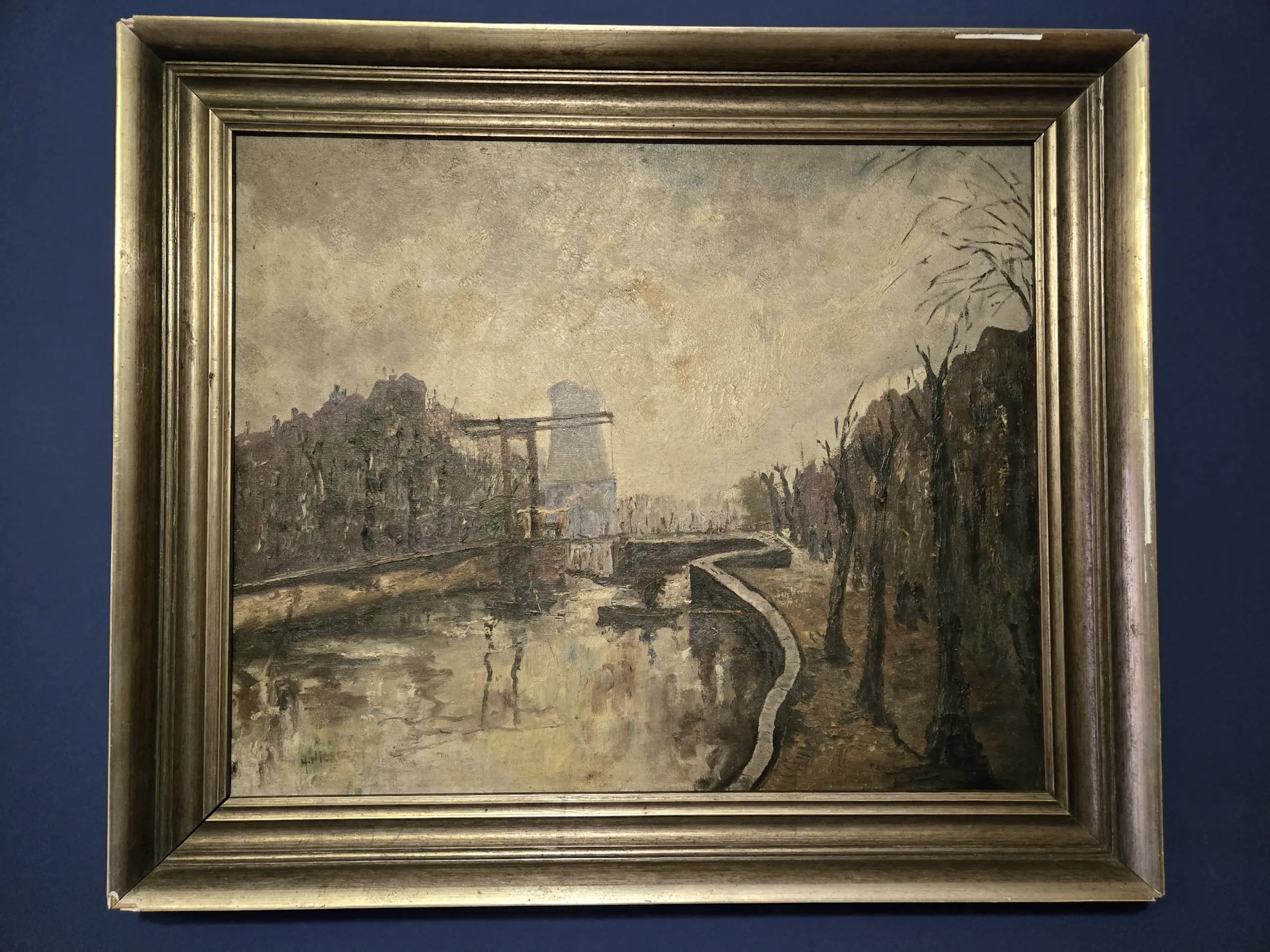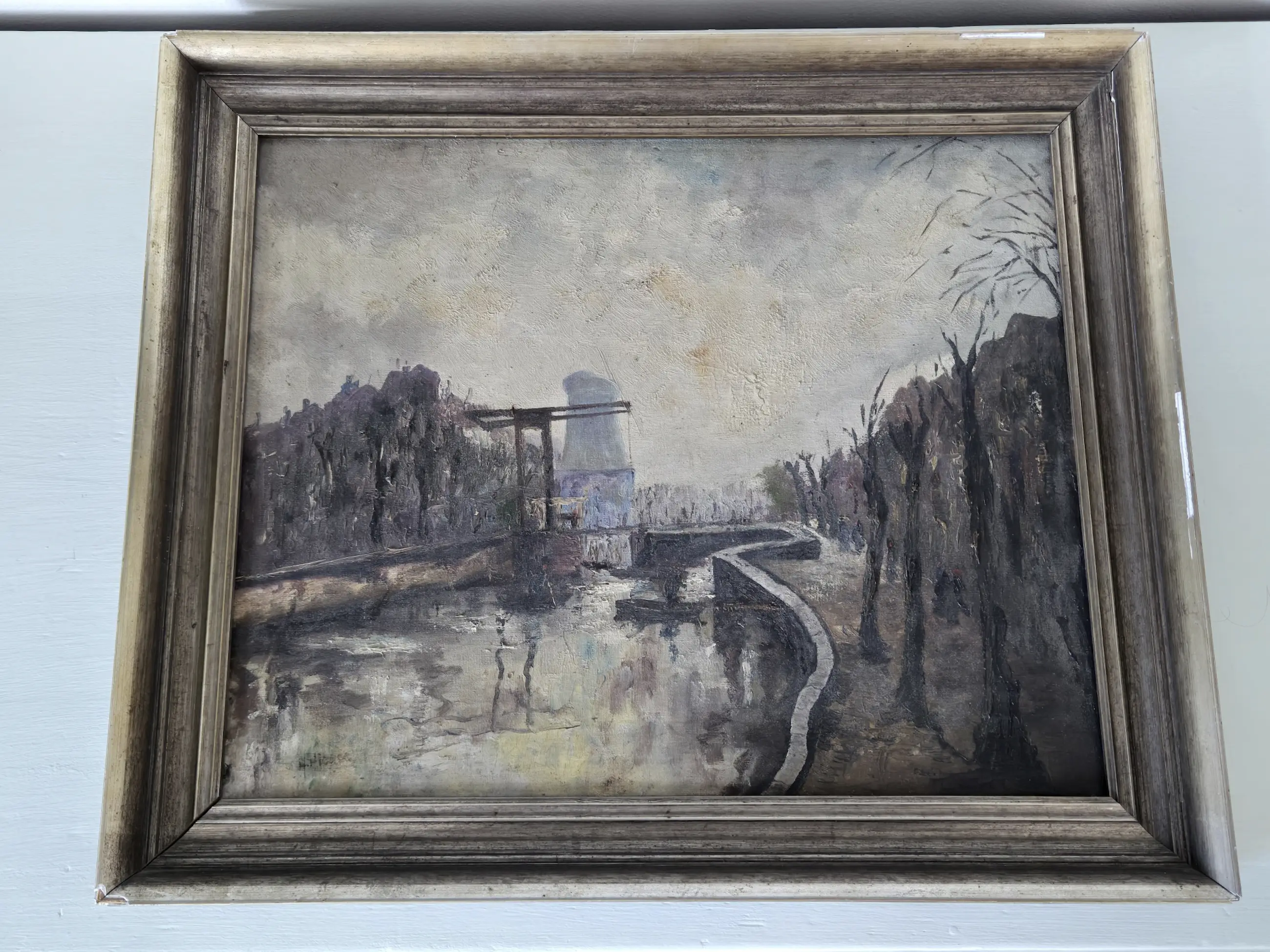 Duister schilderij van Huub Hierck van een troosteloze gracht met ophaalbrug in de donkere winterdagen. De lijst heeft enkele schadeplekjes zoals op de foto's te zien.