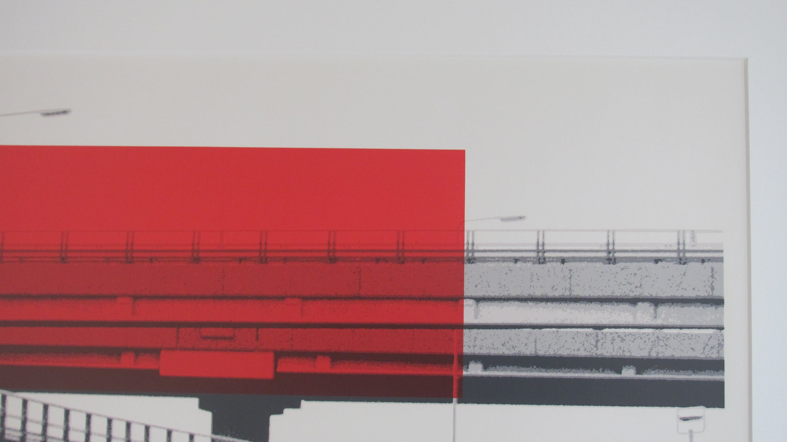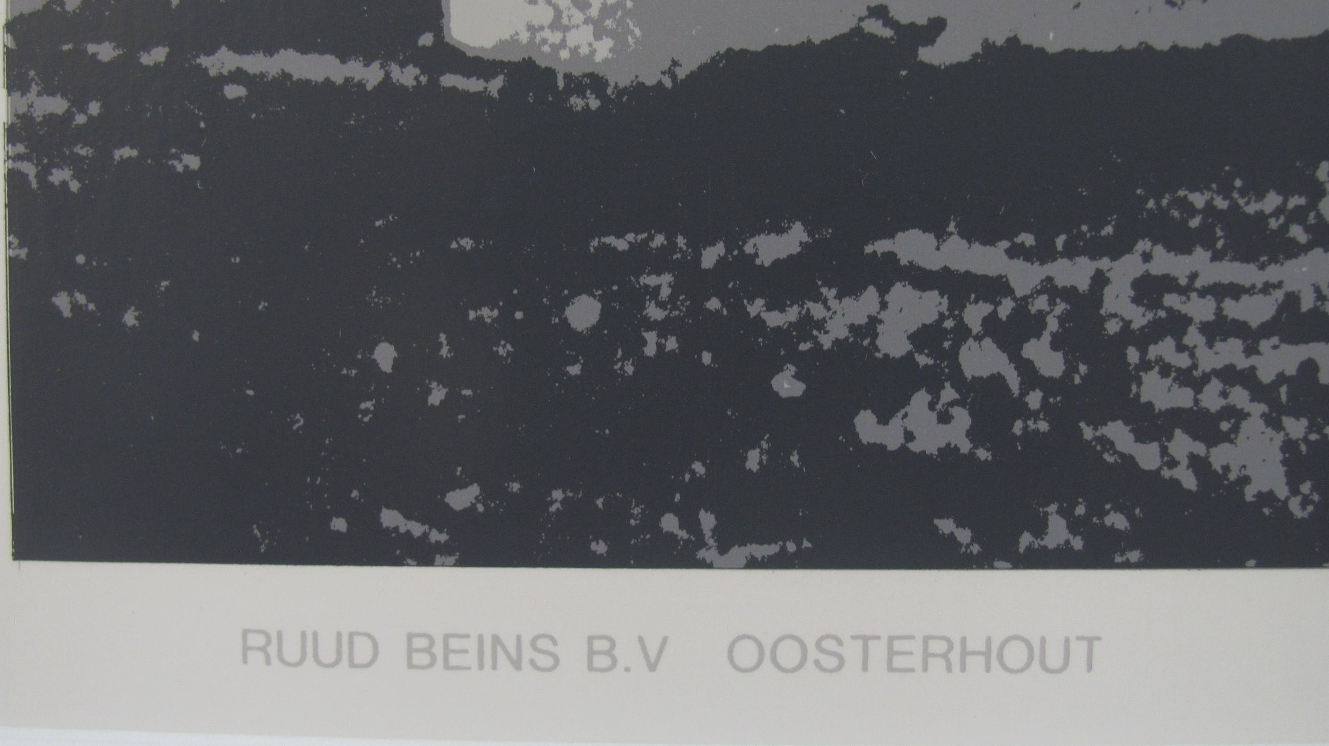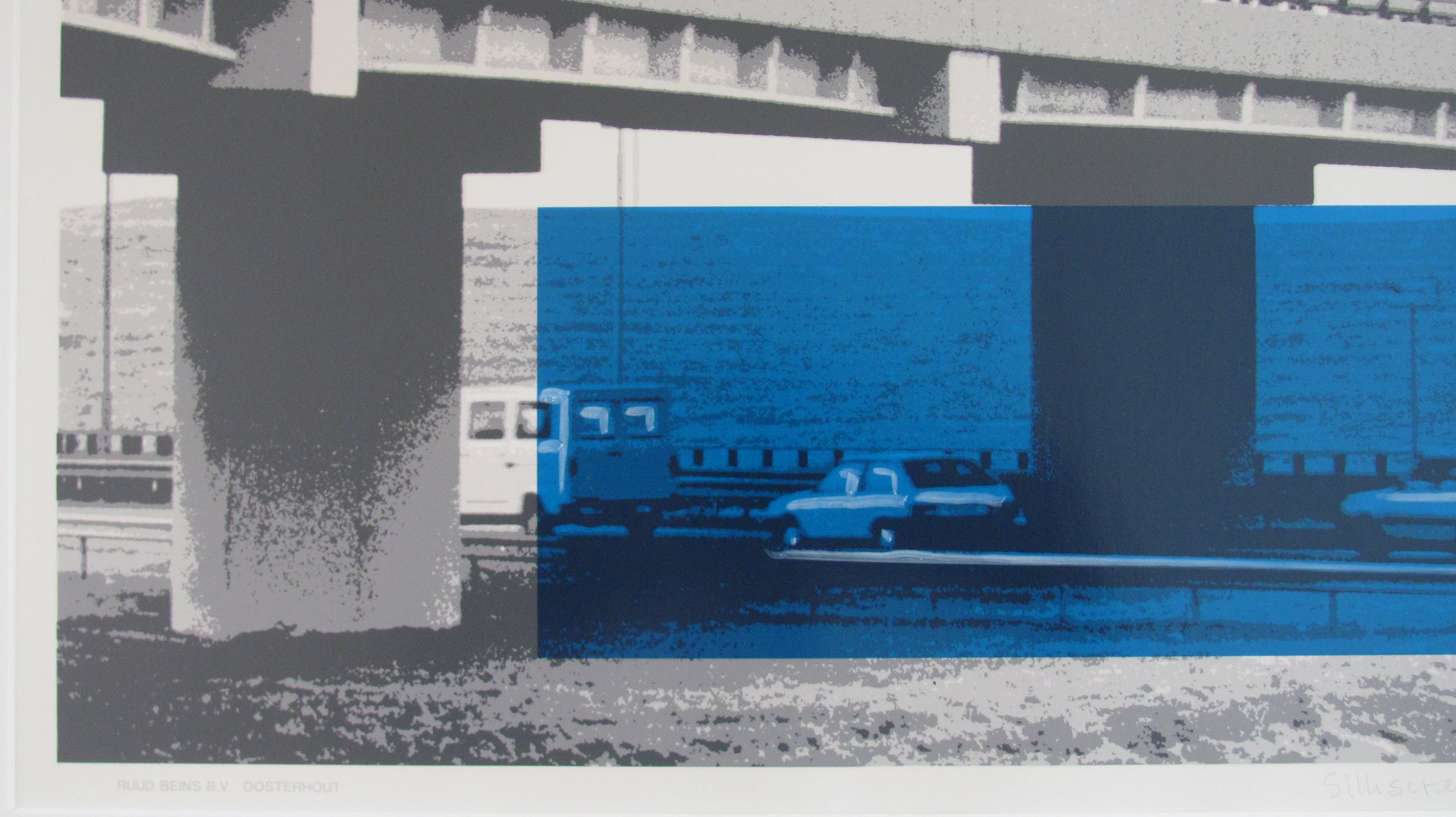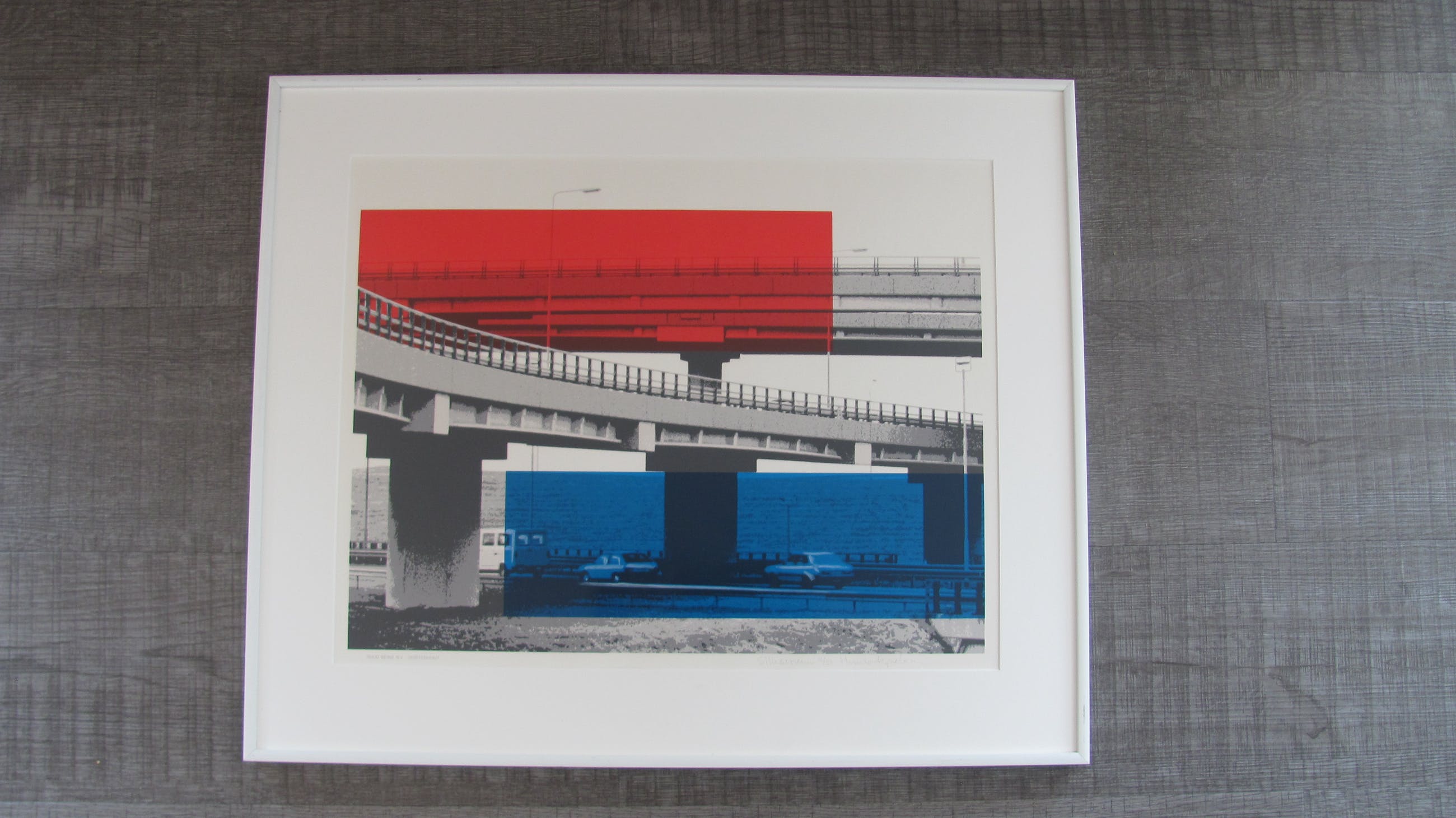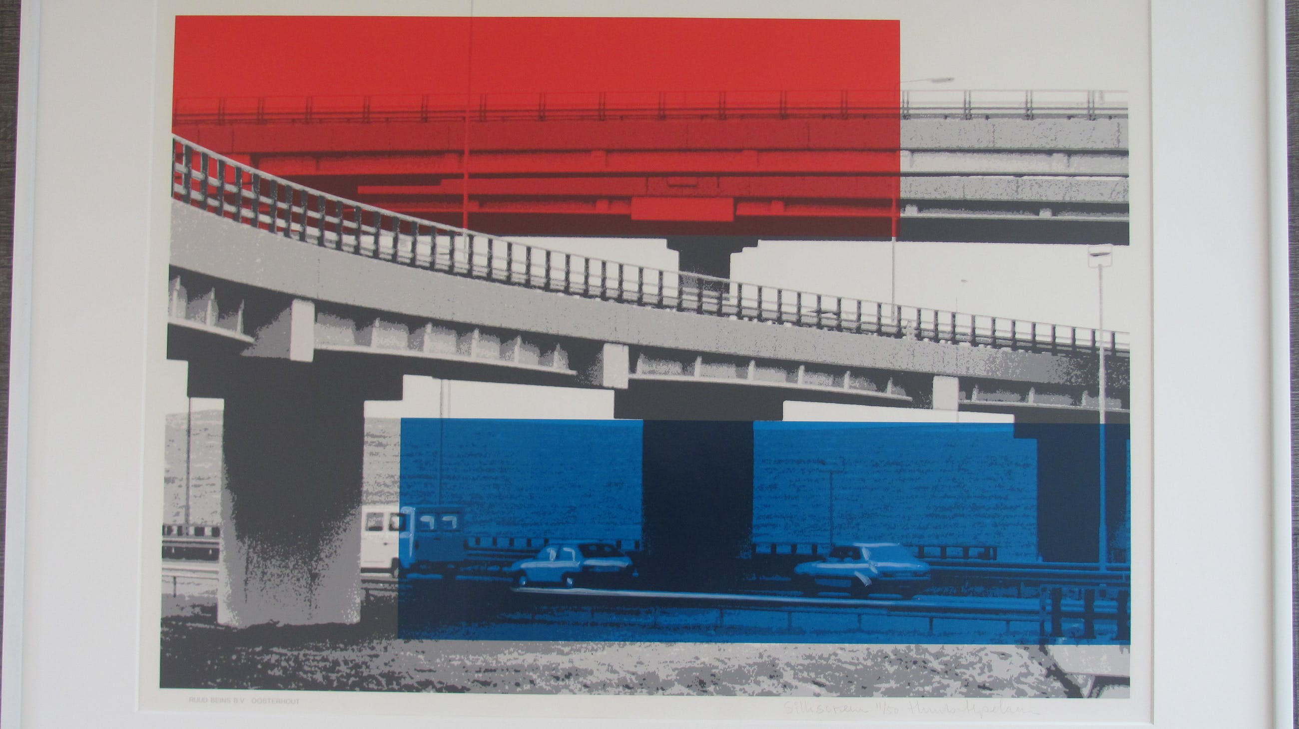 Mooie zeefdruk van Huub Lepelaar. Vervaardigd in opdracht van Ruud Beins B.V. Oosterhout. De zeefdruk is niet getiteld, maar afgebeeld is een verkeersplein in de kleuren rood, wit en blauw. Gesigneerd en genummerd (11/50).
