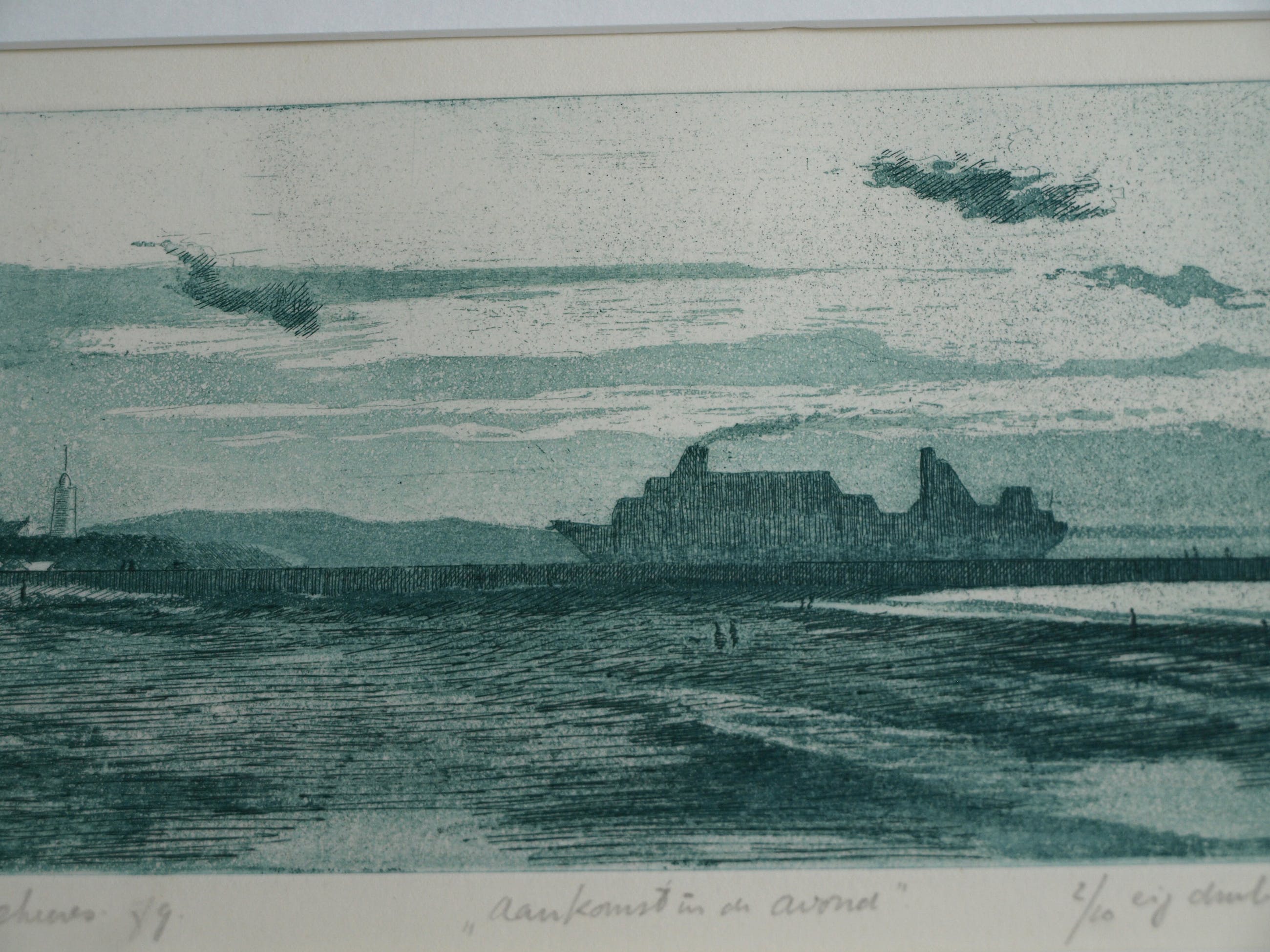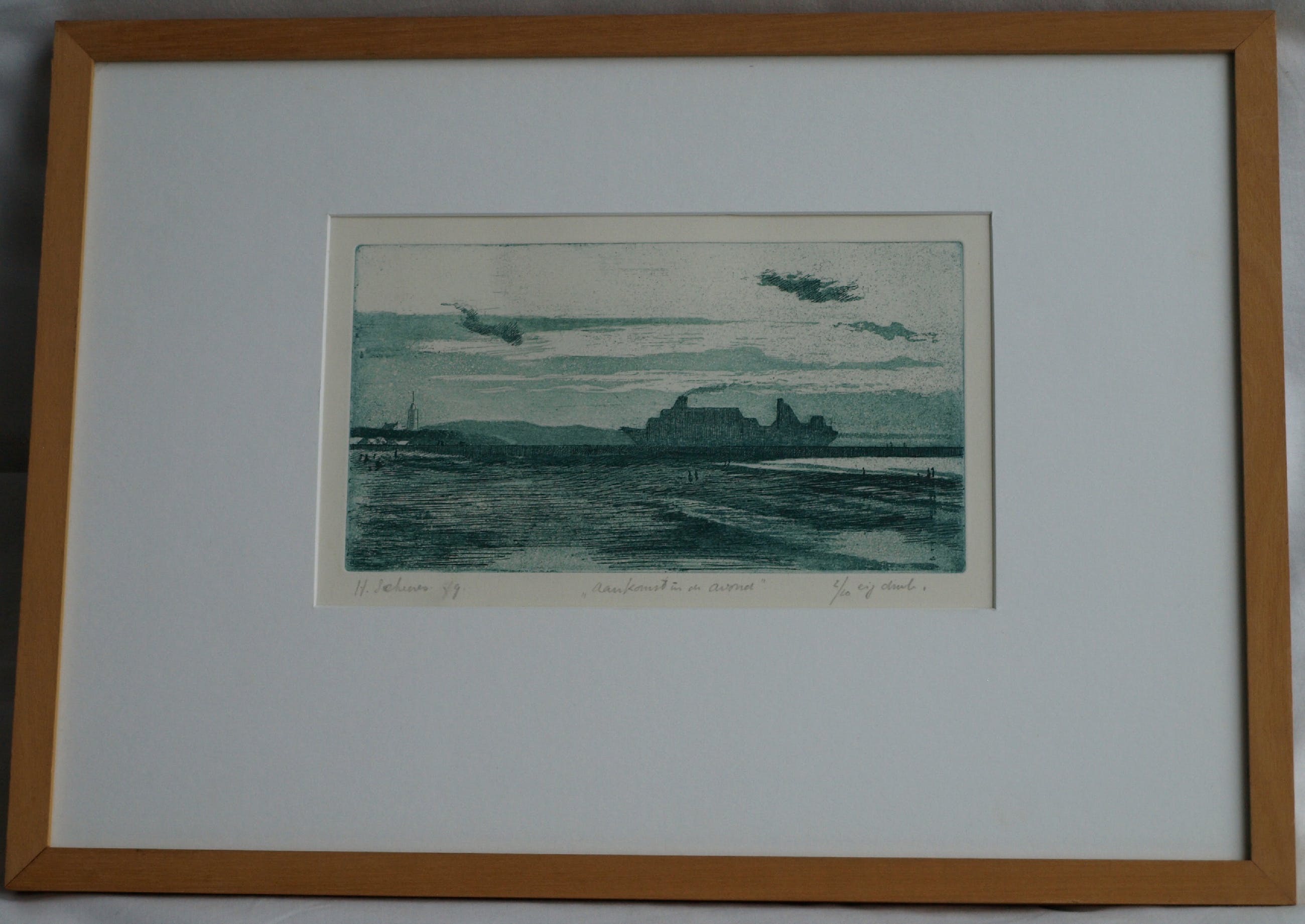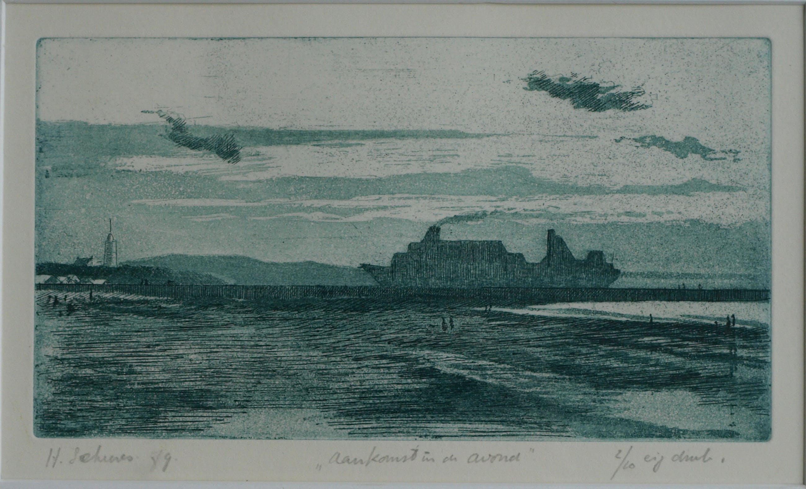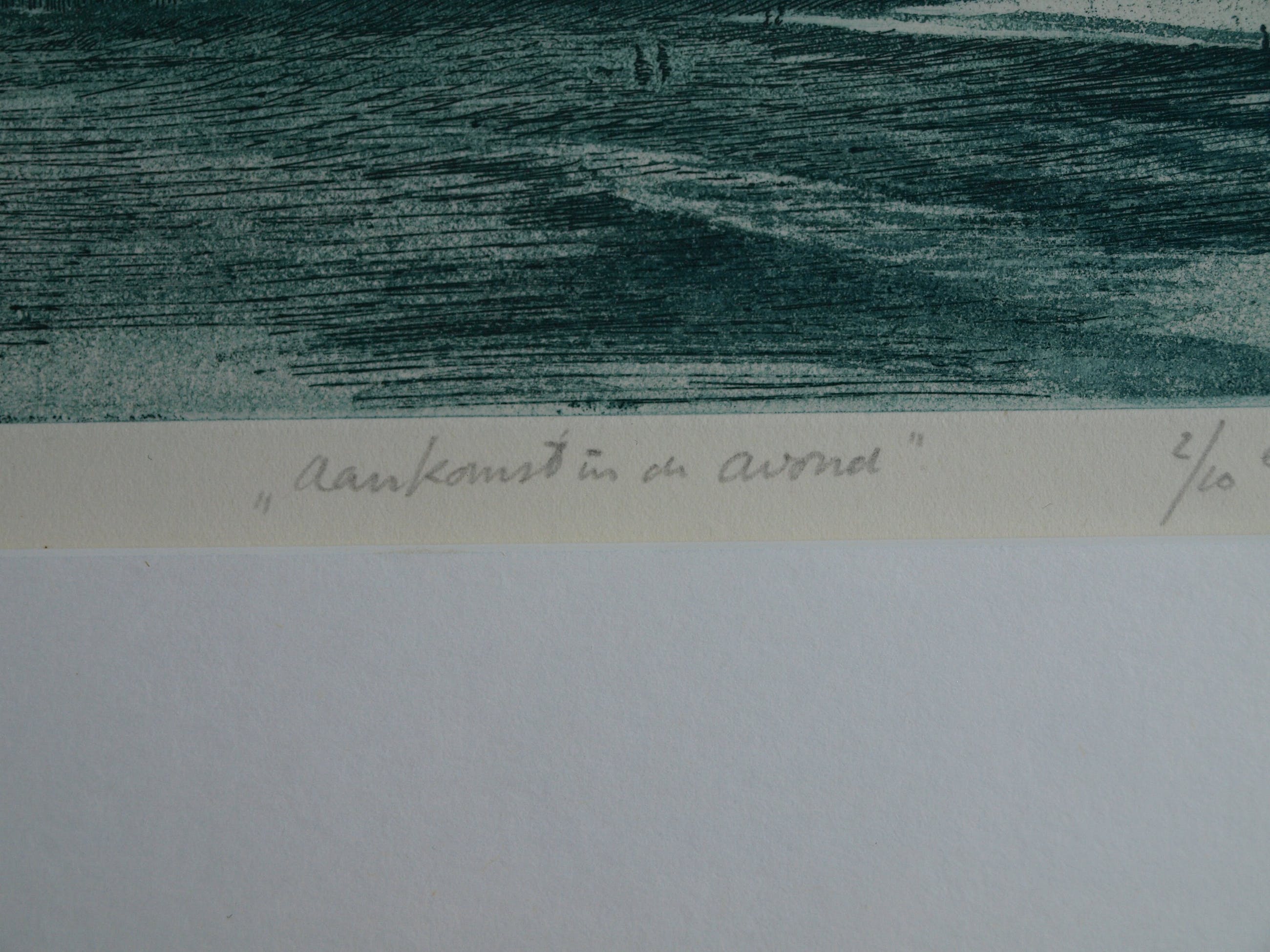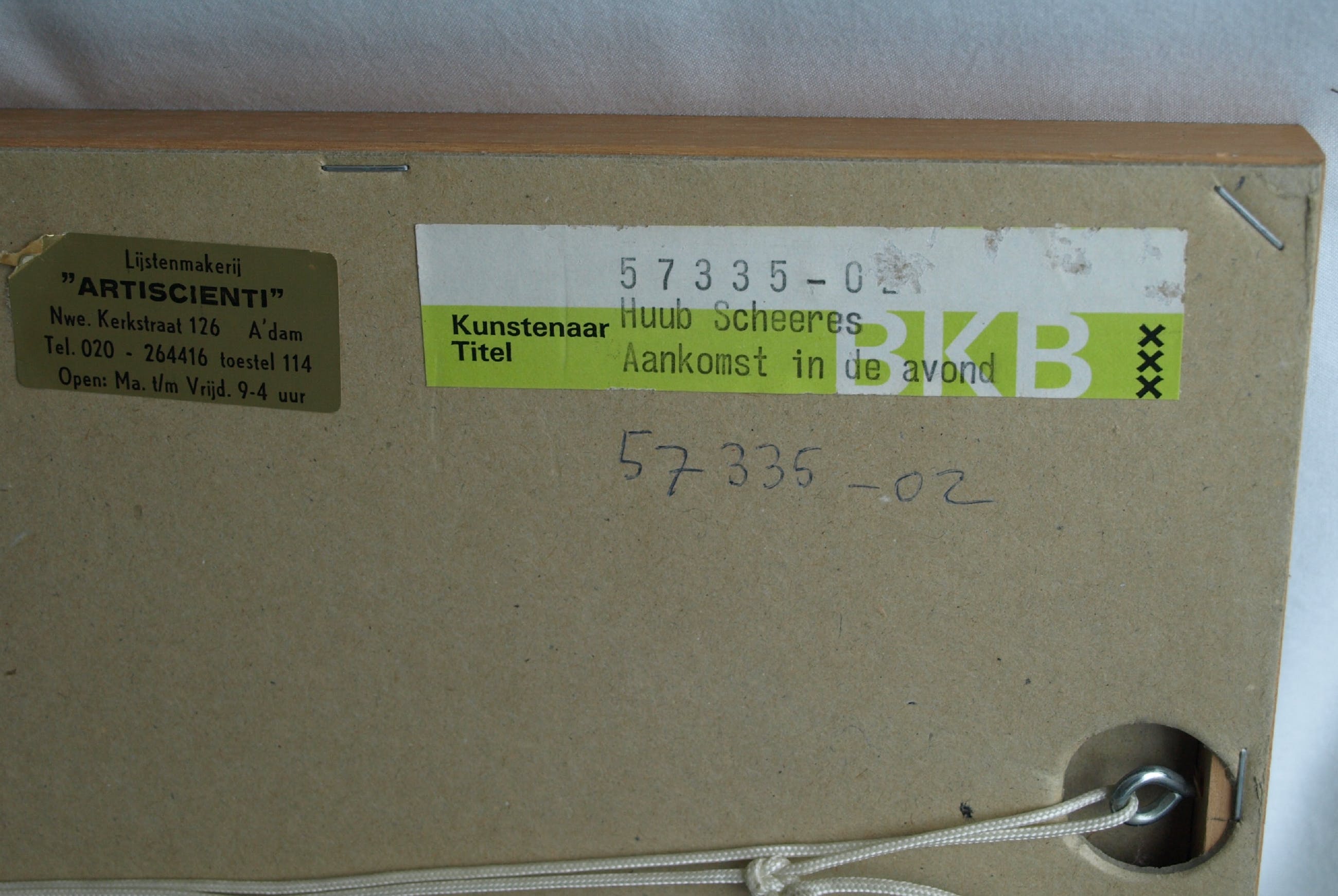 Een ets uit 1979 van de Nederlandse kunstenaar Huub Scheres, getiteld “Aankomst in de avond”.