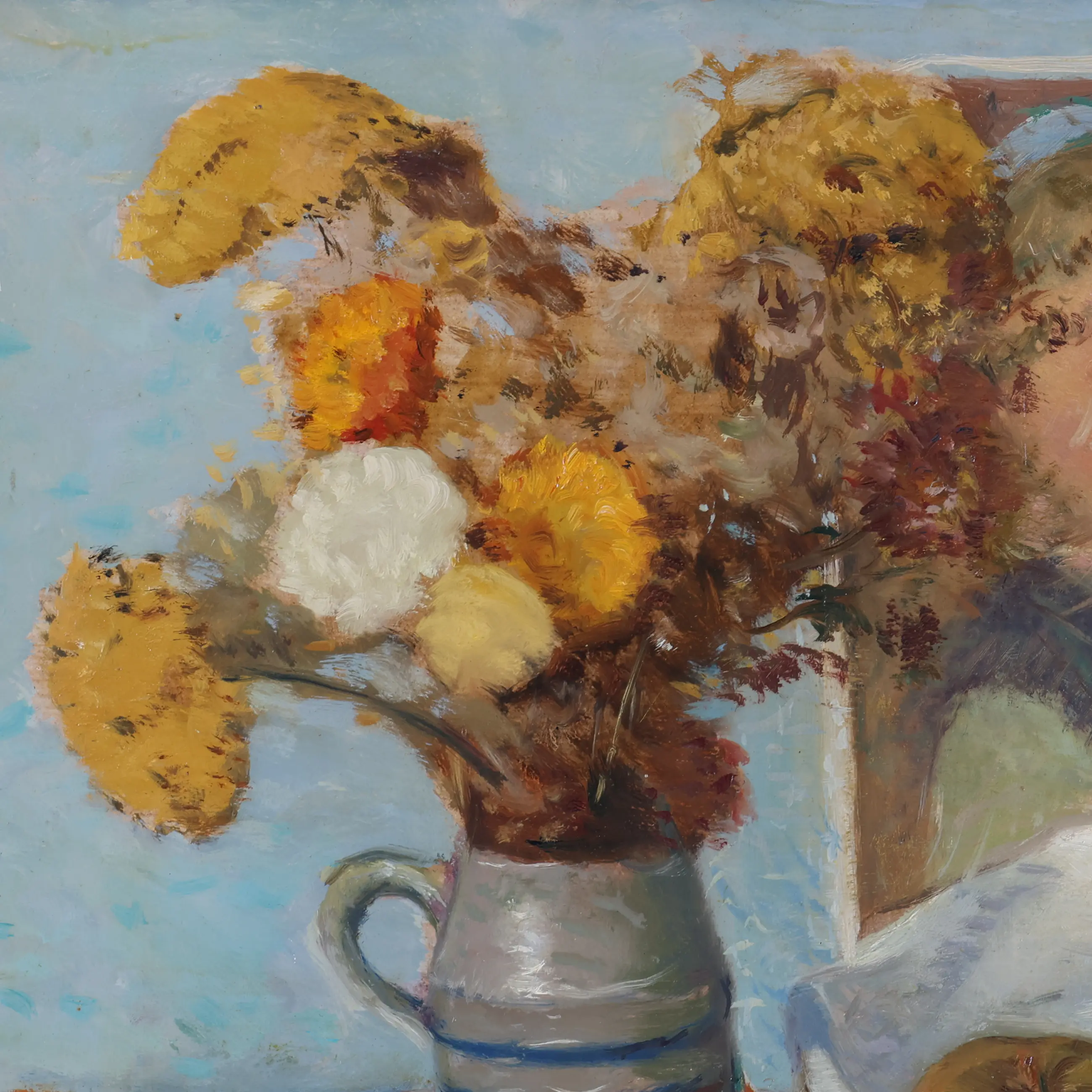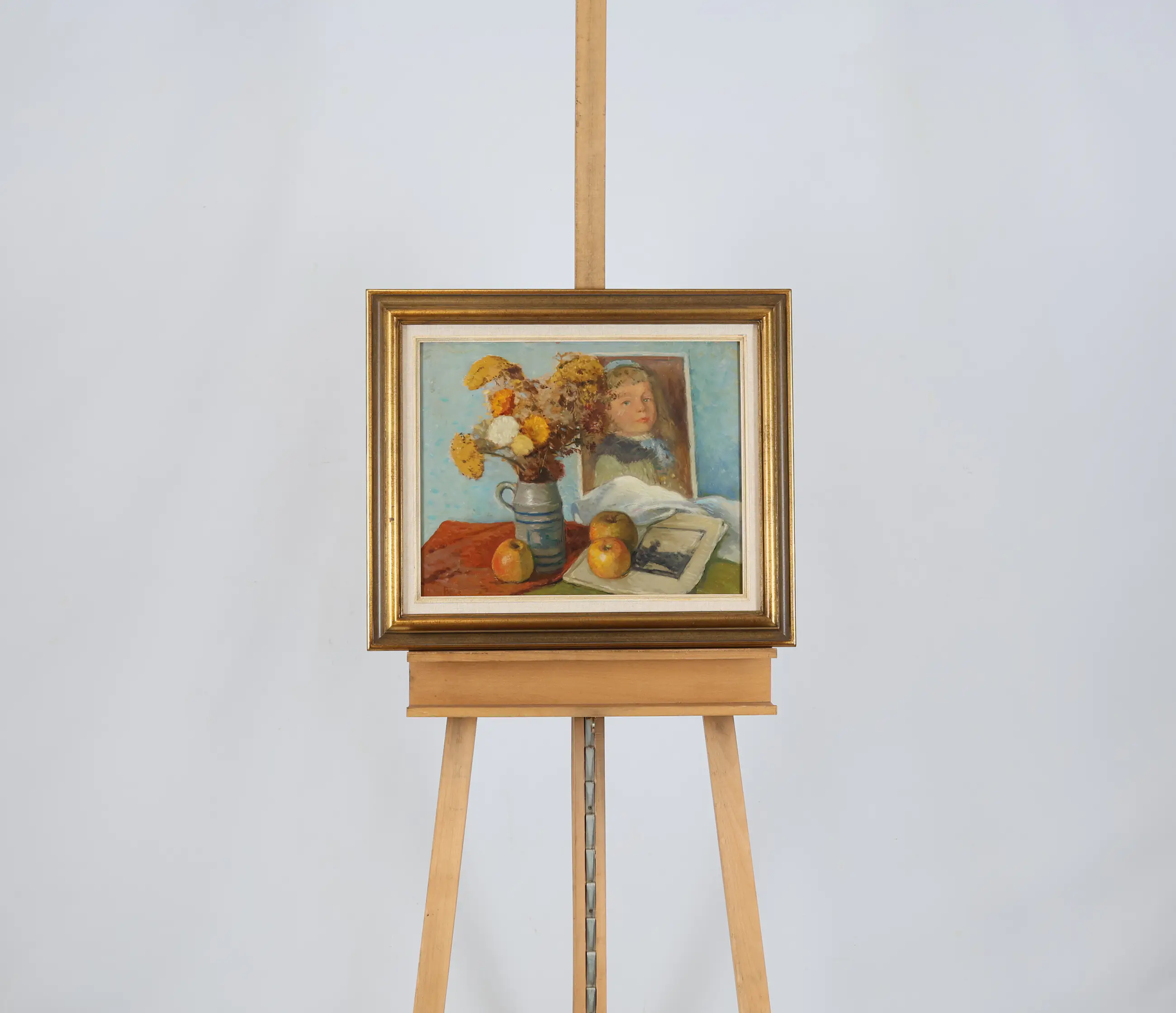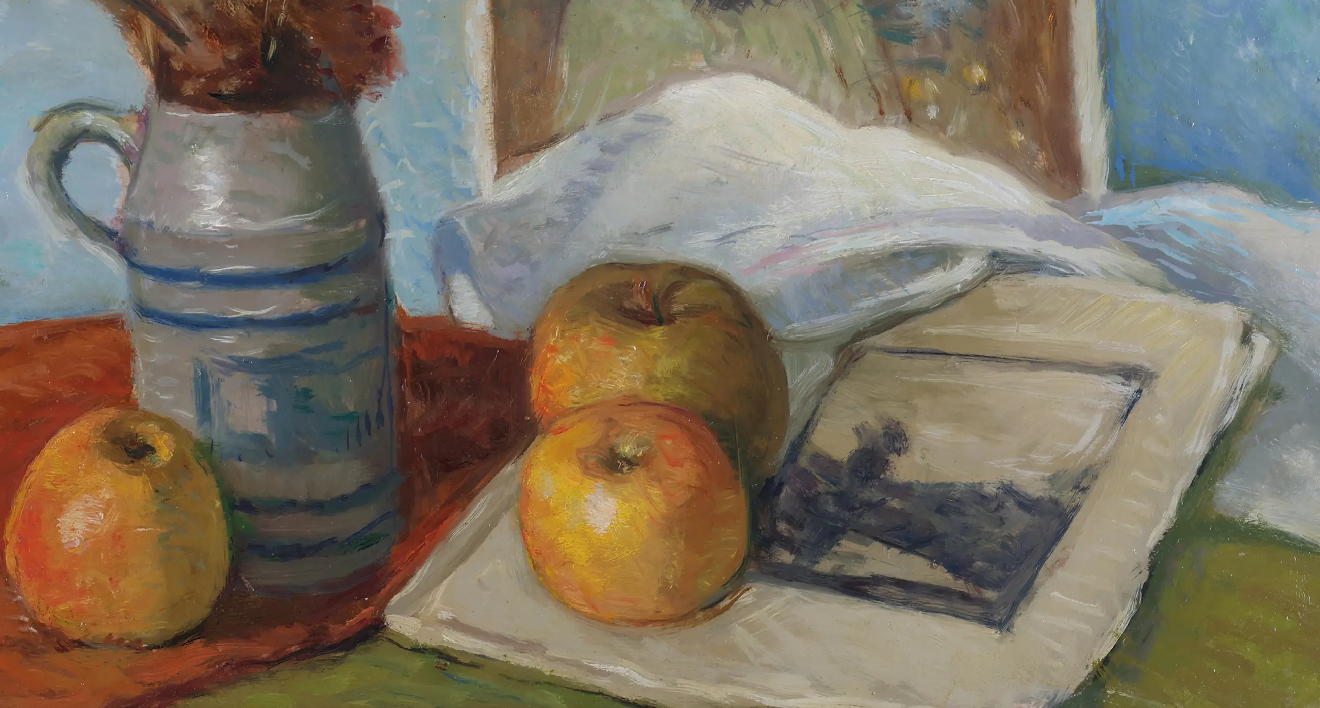 In dit intieme stilleven brengt Van Baar een subtiel samenspel van vormen, kleuren en symboliek samen. Op de voorgrond zien we een grijze kruik gevuld met een boeket gedroogde bloemen in warme tinten van oker, geel en oranje. De ruwe textuur van de bloemen contrasteert mooi met de gladde, koele glans van het aardewerk. Naast de kruik liggen drie appels, zorgvuldig gecomponeerd op een doek en een boek, waardoor het geheel een huiselijke en verstilde sfeer krijgt.