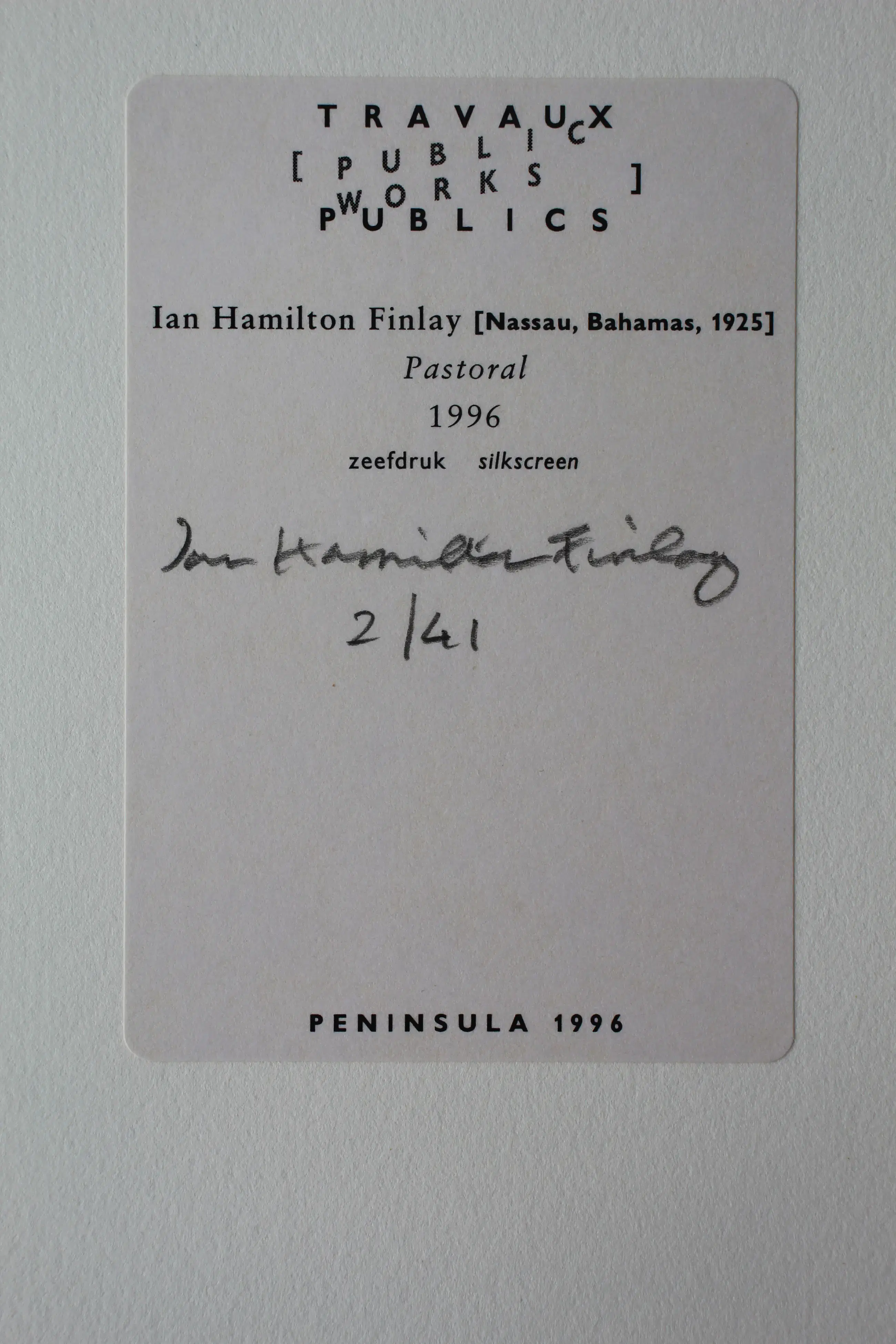Zeefdruk van de op de Bahama's geboren kunstenaar Ian Hamilton Finlay (dichter, auteur, beeldend kunstenaar). Finlay zijn ouders waren Schotten. Nummer: 2/41. Jaar: 1996. Gesigneerd op de achterzijde. De authenticiteit van dit werk wordt volledig gegarandeerd. Een certificaat van echtheid kan, op aanvraag, worden gemaild.