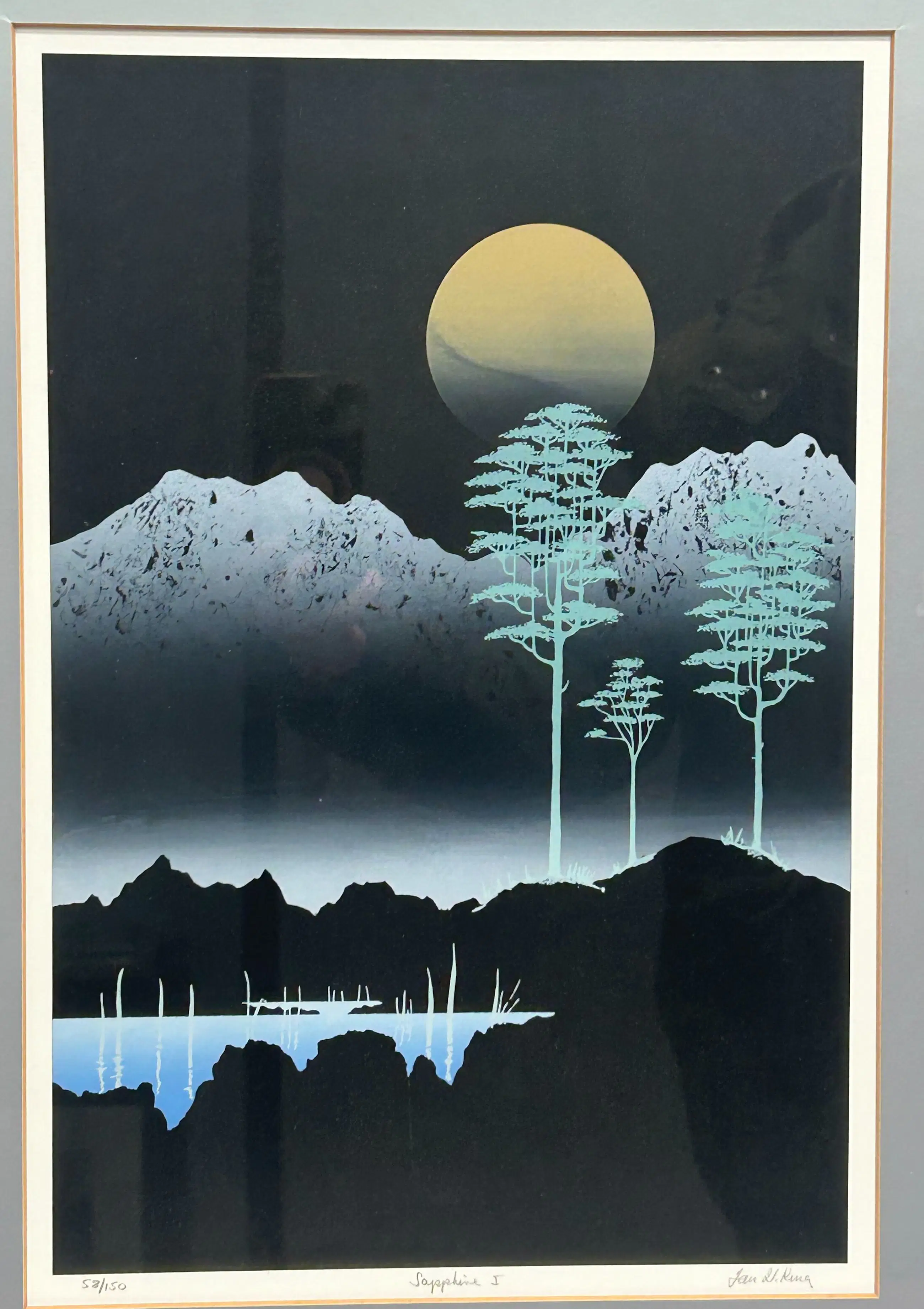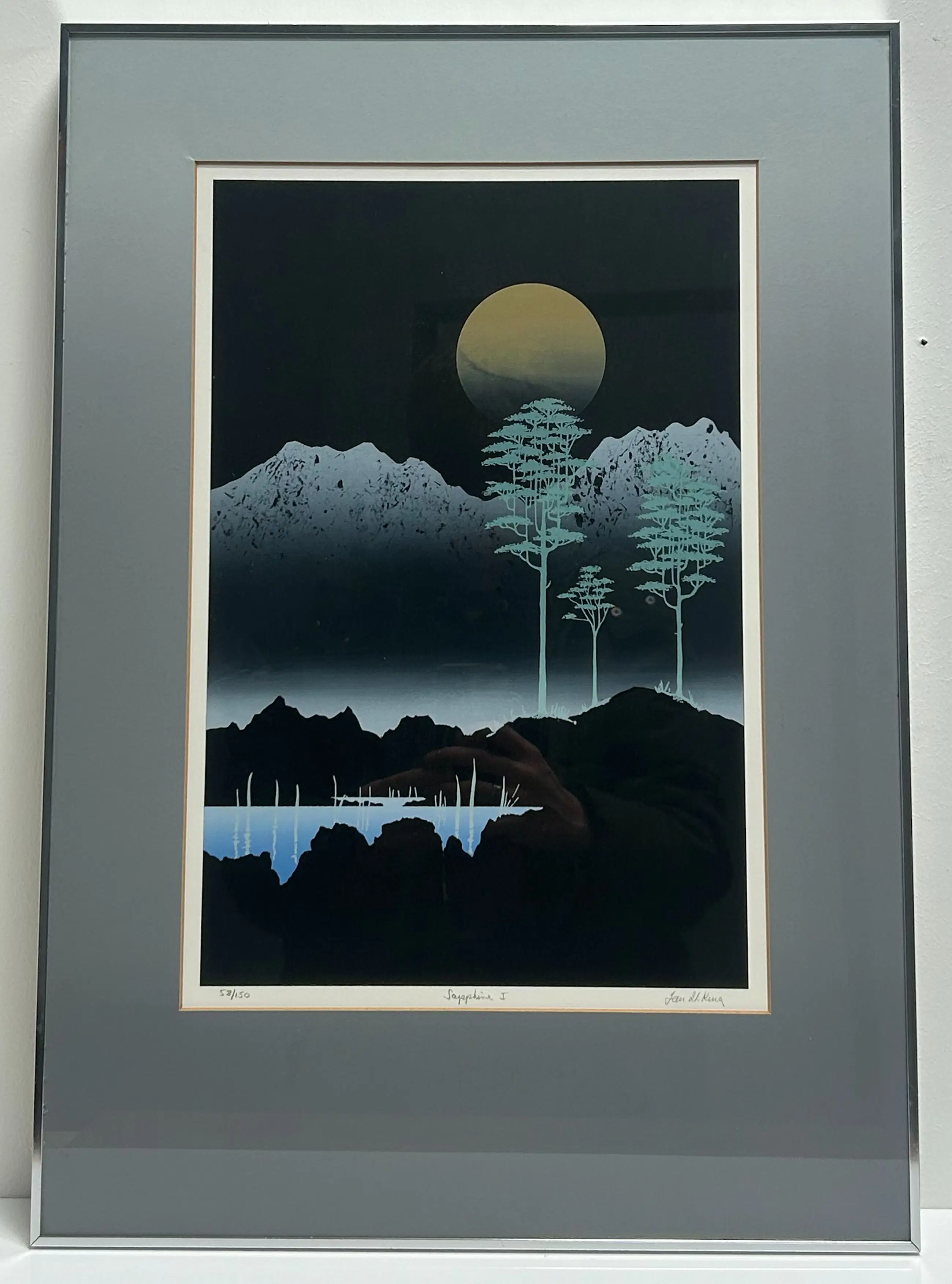 Mooie litho van Ian W. King, ingelijst achter glas. De lijst heeft een zilverkleurige rand die mooi aansluit bij het werk. Het kunstwerk is bovendien voorzien van een passe-partout, wat de presentatie versterkt.