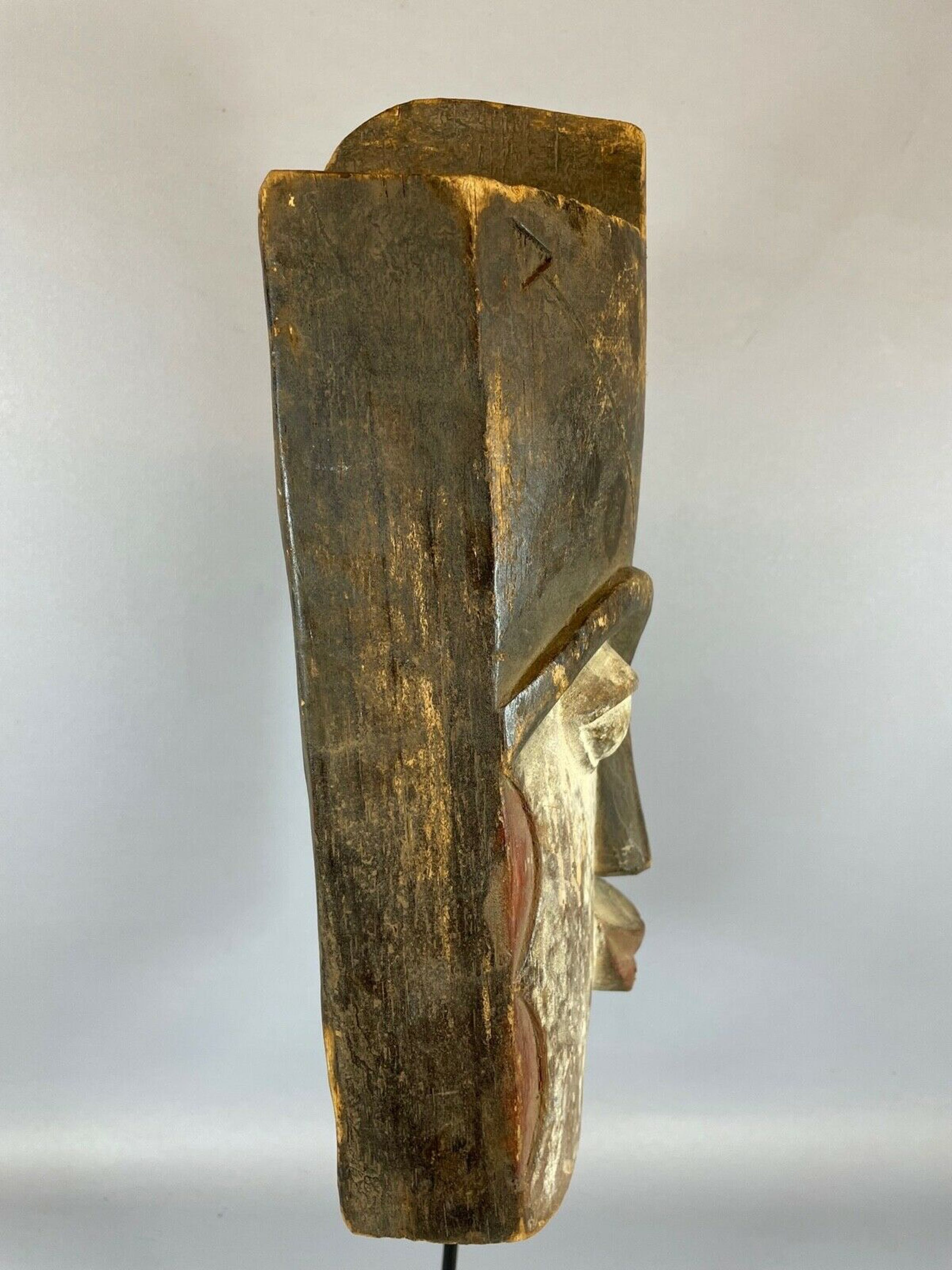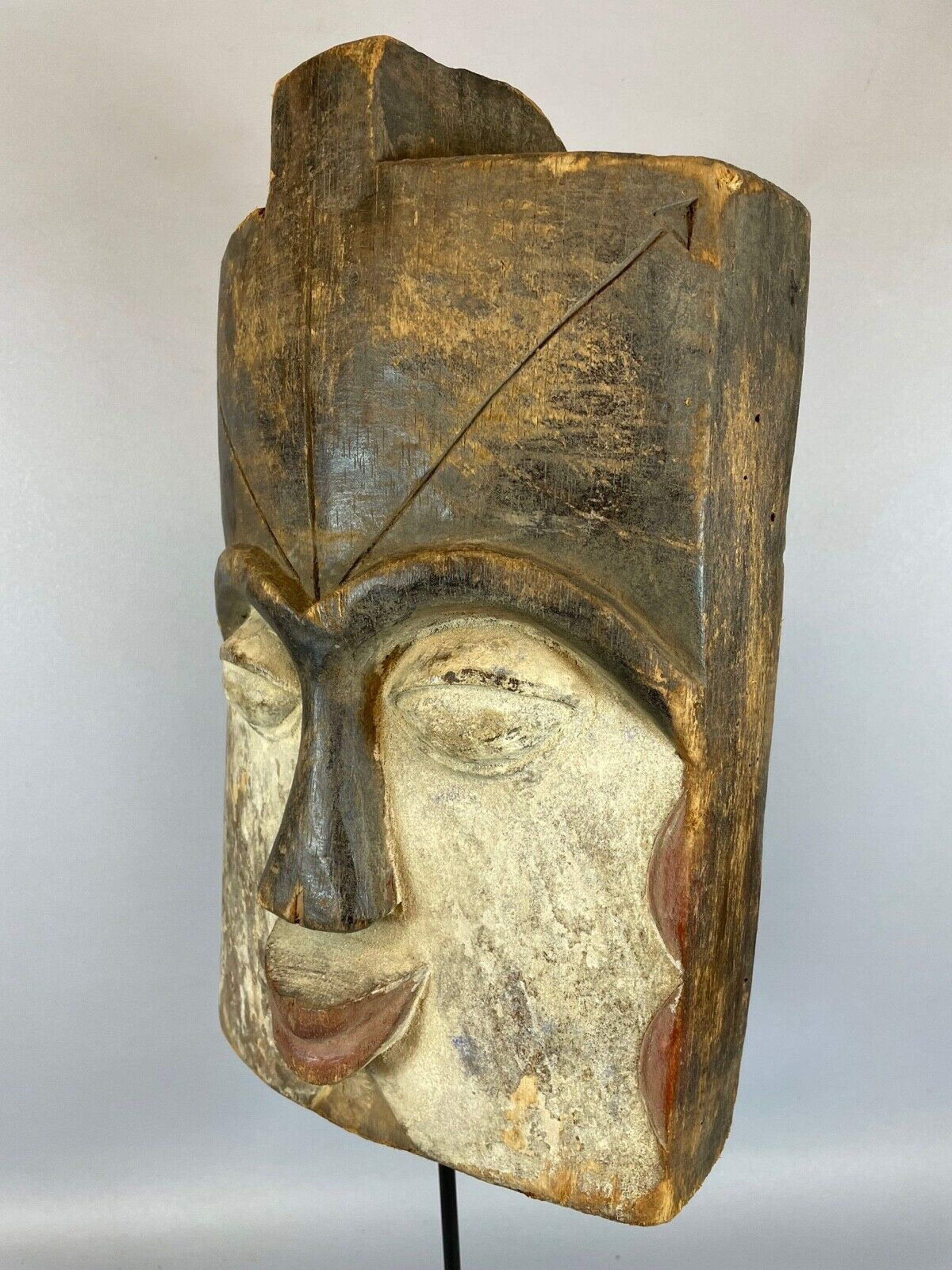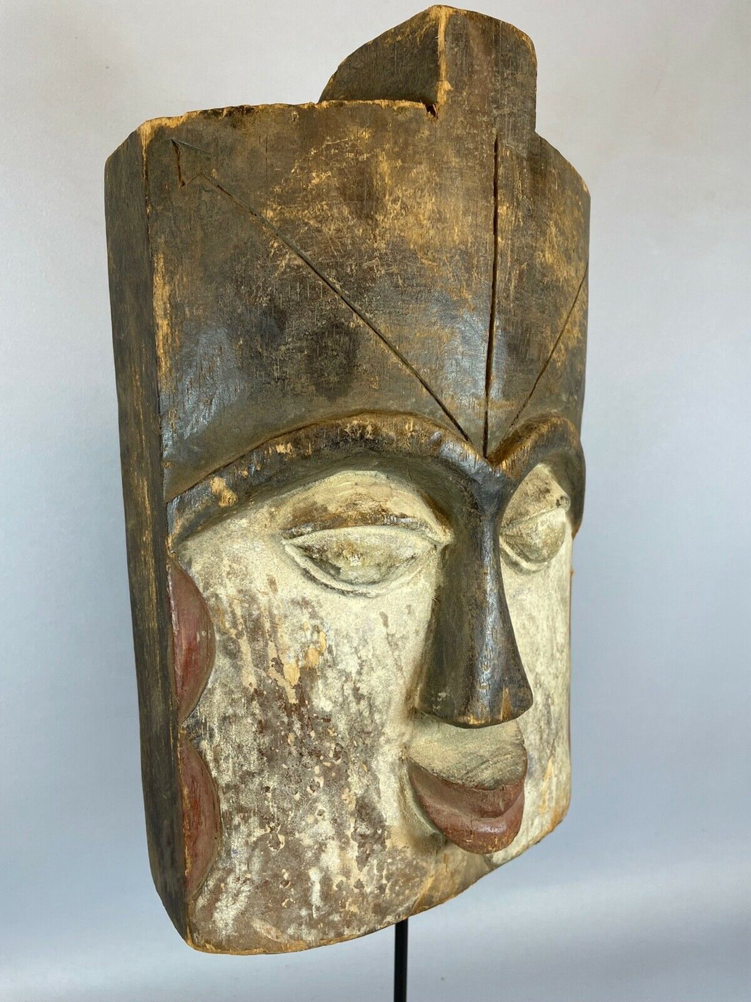 The masks and accoutrements of the Ekpo society make up the greatest works of art in Ibibio society. Ibibio often purposefully play with proportions in their masks to distort the face. A component that appears often in Ibibio masks is an articulated lower jaw. Ibibio people have an overarching theme of contrasting male and female masks by using dark and light colors respectively. These masks are not always performed together, but there is a general understanding of their opposing relationship. Feminine masks are decorated with light colors such as white. Their features are delicate to emphasize their femininity. On the other hand, masculine masks use dark colors to represent the mystic forces of the forest. These masks often have large features and are created to be intentionally ugly. They achieve this by distorting the features in unnatural manners such as having bulging eyes or misplaced mouths. Many deformities present in the masks come from naturally occurring human diseases and illnesses. One that is often depicted is gangosa - a part of yaws. Signs of baldness and walking sticks also show up often in order to portray symbols of karma and old age. Men's costumes incorporate natural materials from the wilderness such as raffia, and seed pod rattles. Women's costumes use materials such as light colored cloth to represent the order of living in the village.