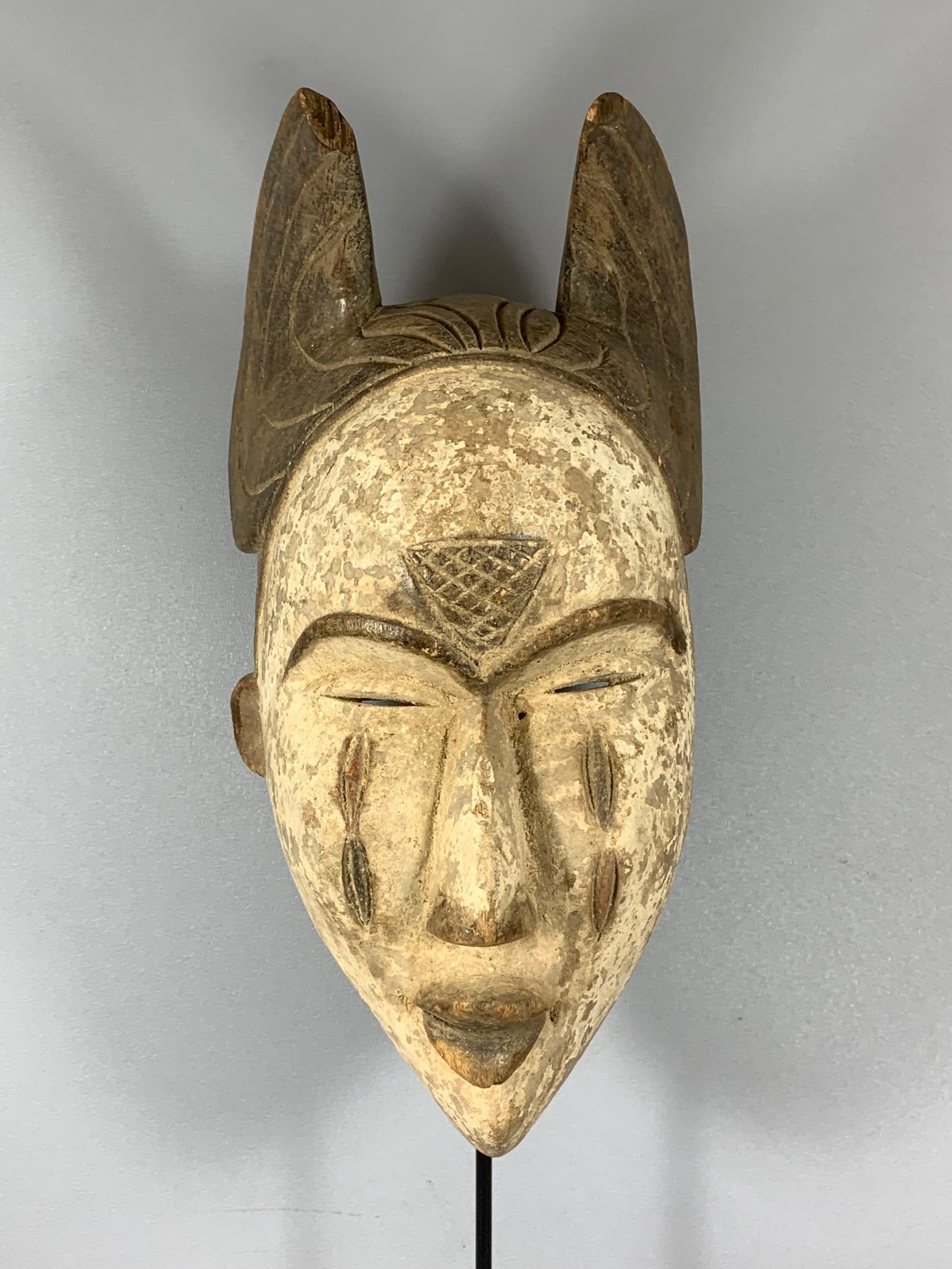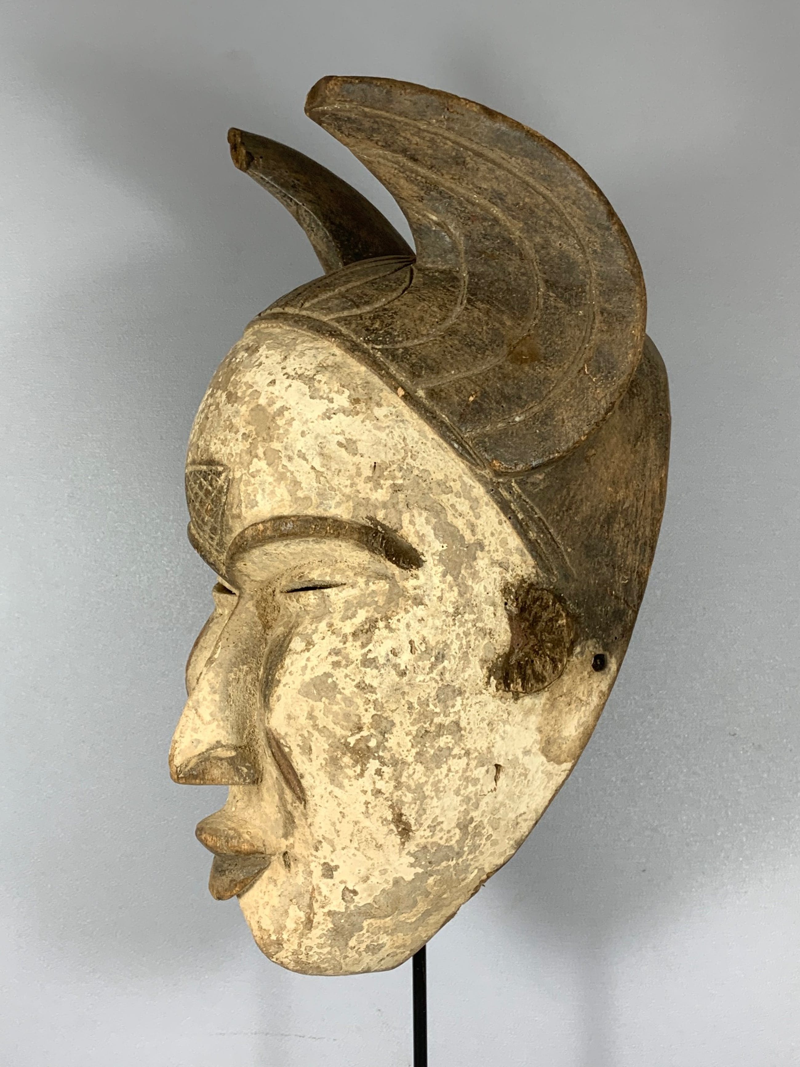 Over two million Ibibio live in Nigeria, between the Delta and the Cross River. There are western Anang Ibibio and southern Eket Ibibio. The main economic staple in the region is the palm tree, the oil of which is extracted and sold to external markets. The Ibibio traditionally cultivate yams, plantains and maize. Ekpo is the Ibibio word for “ancestor,” as well as the name of the principal masking society, its masks, and the dances that commemorate the deceased. The members of the ekpo society play a political, legislative, judiciary, and religious role in the village. It is a graded association in charge of the ancestor cult and includes two types of masks: the first, the idiok, is ugly and evokes wandering spirits, as compared to the mfon, which is handsome and represents spirits who have reached paradise. White- and yellow-faced masks, mfon come out during daytime burial festivities honoring the recent dead, and also at annual agricultural festivals. Their dances are slow and graceful, with costumes made of many bright-colored cloths. Considered good and beautiful, mfon masks embody the souls of people whose lives on earth were productive and morally unblemished. These are not named ancestors, but rather the collective community of souls whose positive influence is welcome among the living. During the ceremony, young people personify the spirits, who have momentarily returned to the world of living. The idiok black masks, are often of naturalistic appearance and with movable jaws. They represent corrupt, amoral, ugly, and evil souls sentenced at death to perpetual ghosthood. They appear only at night, well after the pretty masks have retired. Costumed in unruly hanks of black-dyed raffia, they dance erratically, at times with deliberately wild movements to inspire terror in those they encounter. Many dark Ibibio masks have distorted facial features that are interpreted as advanced states of disfiguring tropical diseases.