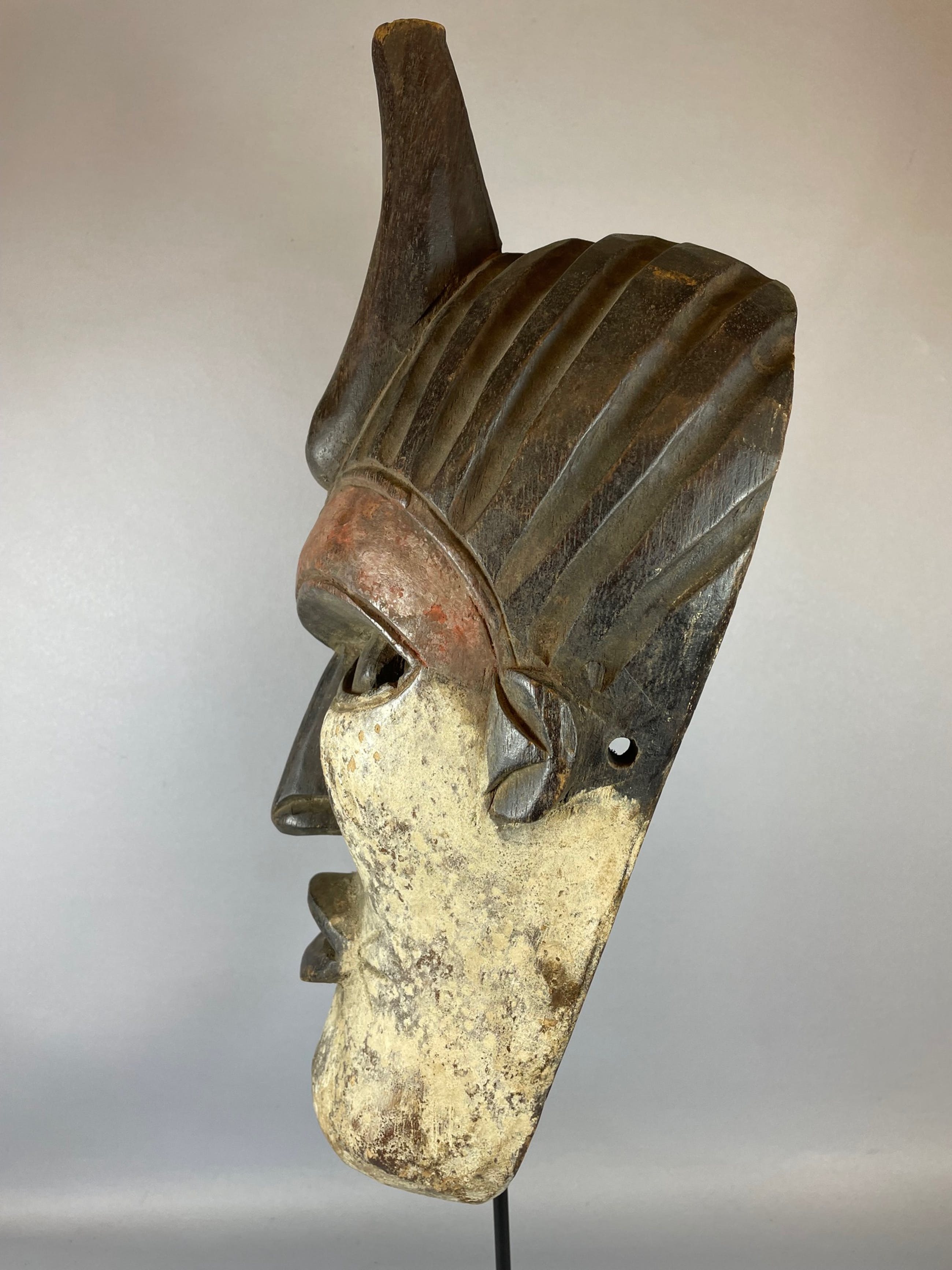 Over two million Ibibio live in Nigeria, between the Delta and the Cross River. There are western Anang Ibibio and southern Eket Ibibio. The main economic staple in the region is the palm tree, the oil of which is extracted and sold to external markets. The Ibibio traditionally cultivate yams, plantains and maize. Ekpo is the Ibibio word for “ancestor,” as well as the name of the principal masking society, its masks, and the dances that commemorate the deceased. The members of the ekpo society play a political, legislative, judiciary, and religious role in the village. It is a graded association in charge of the ancestor cult and includes two types of masks: the first, the idiok, is ugly and evokes wandering spirits, as compared to the mfon, which is handsome and represents spirits who have reached paradise. White- and yellow-faced masks, mfon come out during daytime burial festivities honoring the recent dead, and also at annual agricultural festivals. Their dances are slow and graceful, with costumes made of many bright-colored cloths. Considered good and beautiful, mfon masks embody the souls of people whose lives on earth were productive and morally unblemished. These are not named ancestors, but rather the collective community of souls whose positive influence is welcome among the living. During the ceremony, young people personify the spirits, who have momentarily returned to the world of living. The idiok black masks, are often of naturalistic appearance and with movable jaws. They represent corrupt, amoral, ugly, and evil souls sentenced at death to perpetual ghosthood. They appear only at night, well after the pretty masks have retired. Costumed in unruly hanks of black-dyed raffia, they dance erratically, at times with deliberately wild movements to inspire terror in those they encounter. Many dark Ibibio masks have distorted facial features that are interpreted as advanced states of disfiguring tropical diseases.