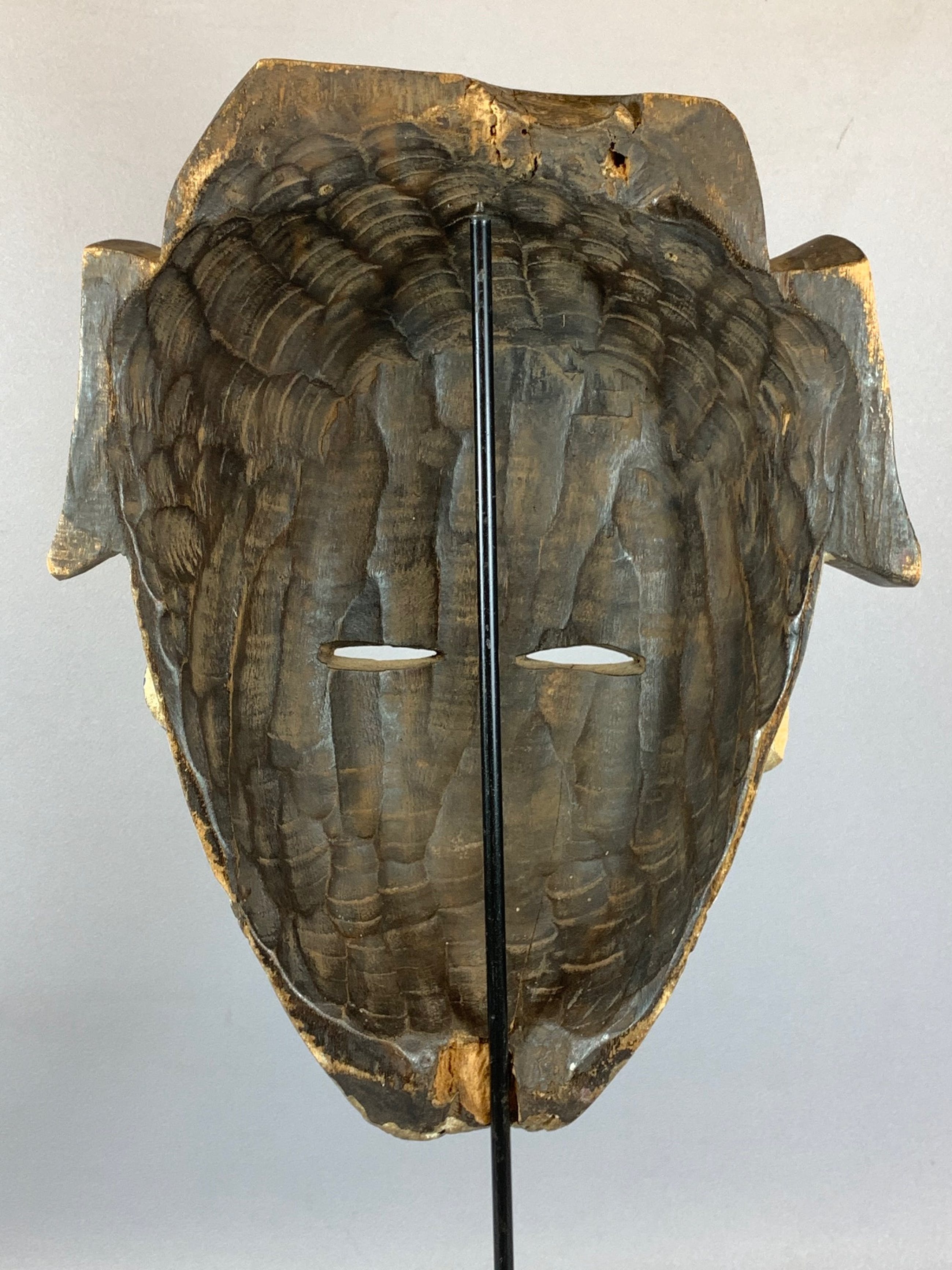Over two million Ibibio live in Nigeria, between the Delta and the Cross River. There are western Anang Ibibio and southern Eket Ibibio. The main economic staple in the region is the palm tree, the oil of which is extracted and sold to external markets. The Ibibio traditionally cultivate yams, plantains and maize. Ekpo is the Ibibio word for “ancestor,” as well as the name of the principal masking society, its masks, and the dances that commemorate the deceased. The members of the ekpo society play a political, legislative, judiciary, and religious role in the village. It is a graded association in charge of the ancestor cult and includes two types of masks: the first, the idiok, is ugly and evokes wandering spirits, as compared to the mfon, which is handsome and represents spirits who have reached paradise. White- and yellow-faced masks, mfon come out during daytime burial festivities honoring the recent dead, and also at annual agricultural festivals. Their dances are slow and graceful, with costumes made of many bright-colored cloths. Considered good and beautiful, mfon masks embody the souls of people whose lives on earth were productive and morally unblemished. These are not named ancestors, but rather the collective community of souls whose positive influence is welcome among the living. During the ceremony, young people personify the spirits, who have momentarily returned to the world of living. The idiok black masks, are often of naturalistic appearance and with movable jaws. They represent corrupt, amoral, ugly, and evil souls sentenced at death to perpetual ghosthood. They appear only at night, well after the pretty masks have retired. Costumed in unruly hanks of black-dyed raffia, they dance erratically, at times with deliberately wild movements to inspire terror in those they encounter. Many dark Ibibio masks have distorted facial features that are interpreted as advanced states of disfiguring tropical diseases.